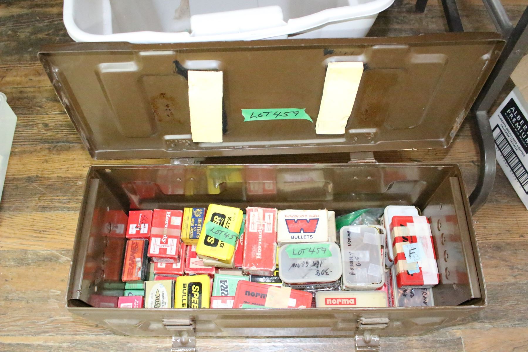 8 Part Boxes of 22 cal. Bullets; 3 Part Boxes of 6mm (approx. 180); 2 Boxes 7mm (almost full); 284Sp BT, 30 cal. Gas Checks, 311 Dia. Bullets (full), 308 Part Box, 311 Rnd Nose, 35 cal, 6.5mm, 308 & 8mm - In an Ammo Box