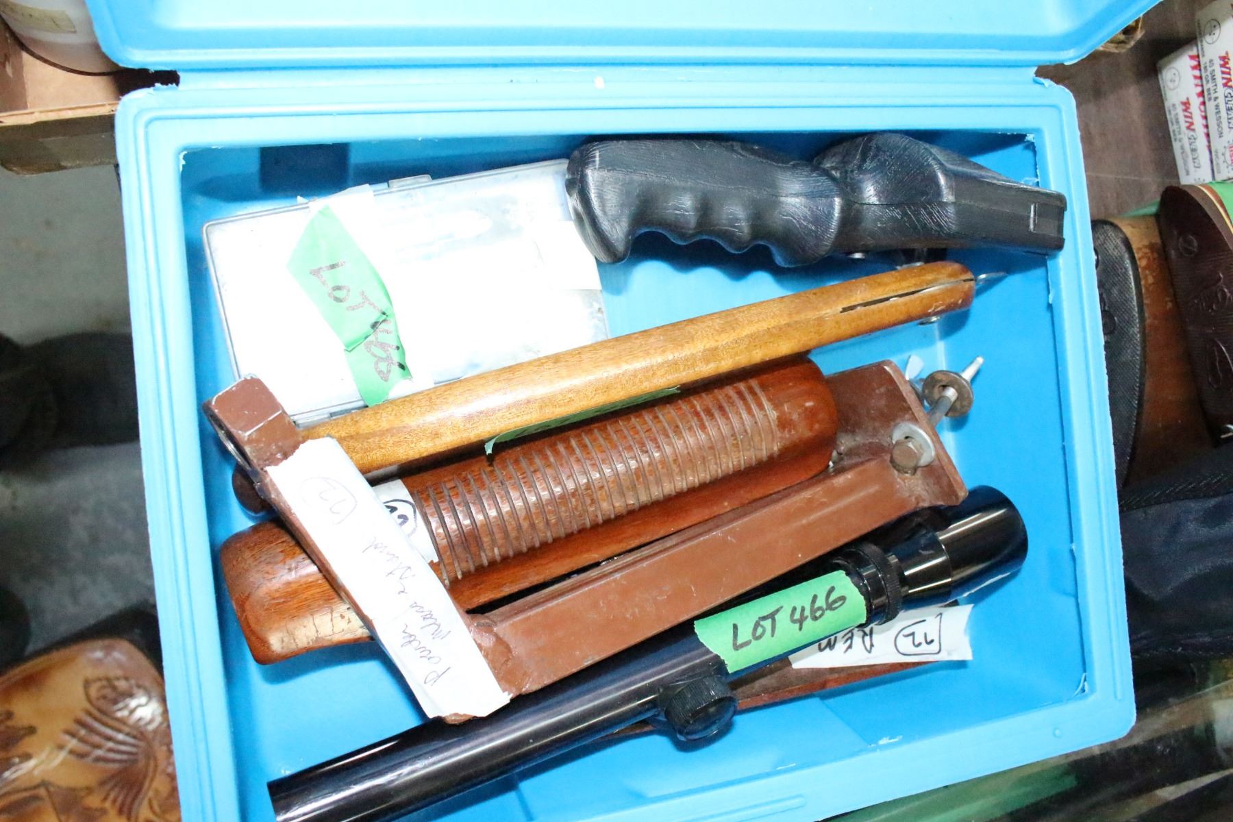 Lot 466 Blue Plastic Carry Box w/ 2 Shotgun Fore-ends; 2 - 22 Scopes; Sling Shot; Small Screwdrivers; a Camp
