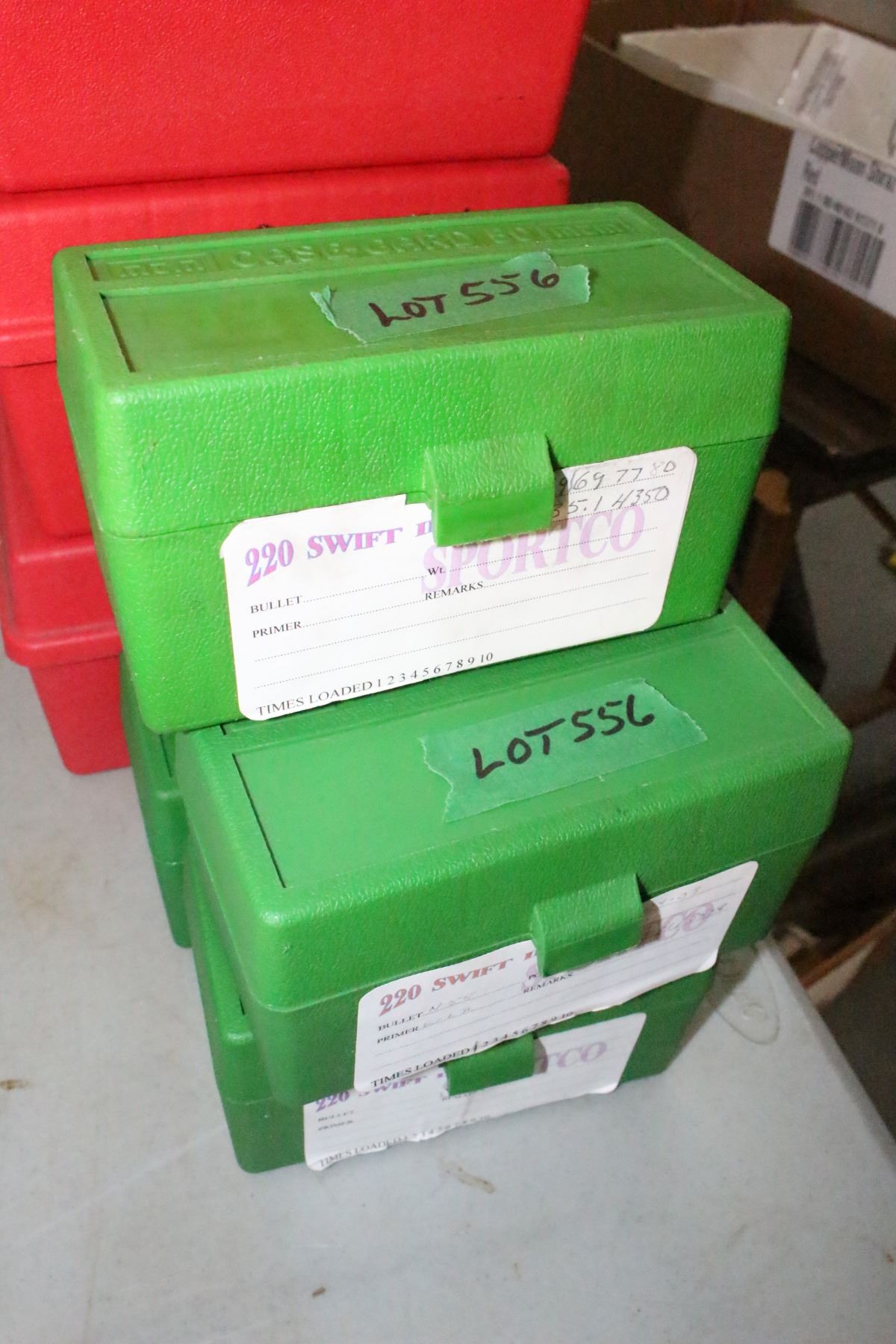 Lot 556 250 Rnds of Reloaded 222 Swift w/Load Information in the Green Caseguard Cases