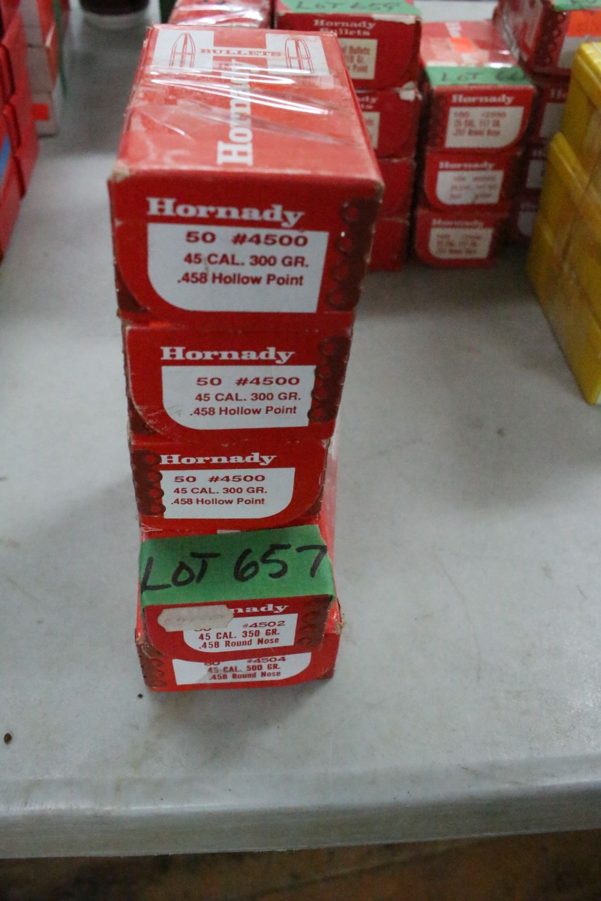 Lot 657 5 Boxes of Hornady, 45 cal. Bullets - 300, 350 & 500 gr., Hollow Point & Rnd Nose - All 'Appear' Ful