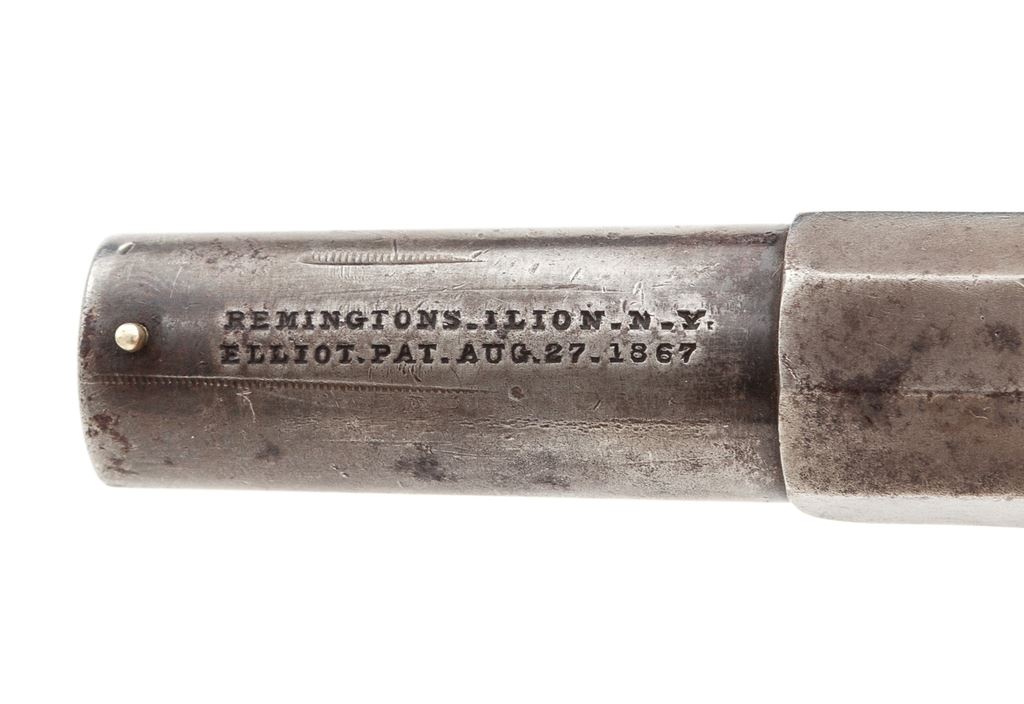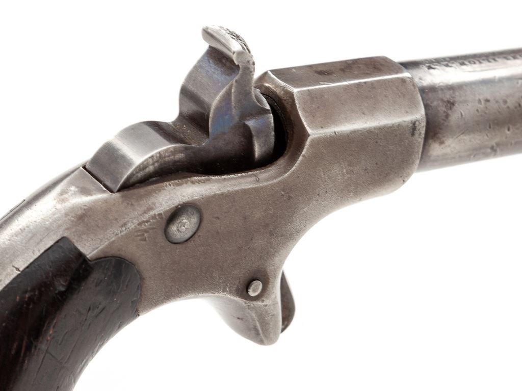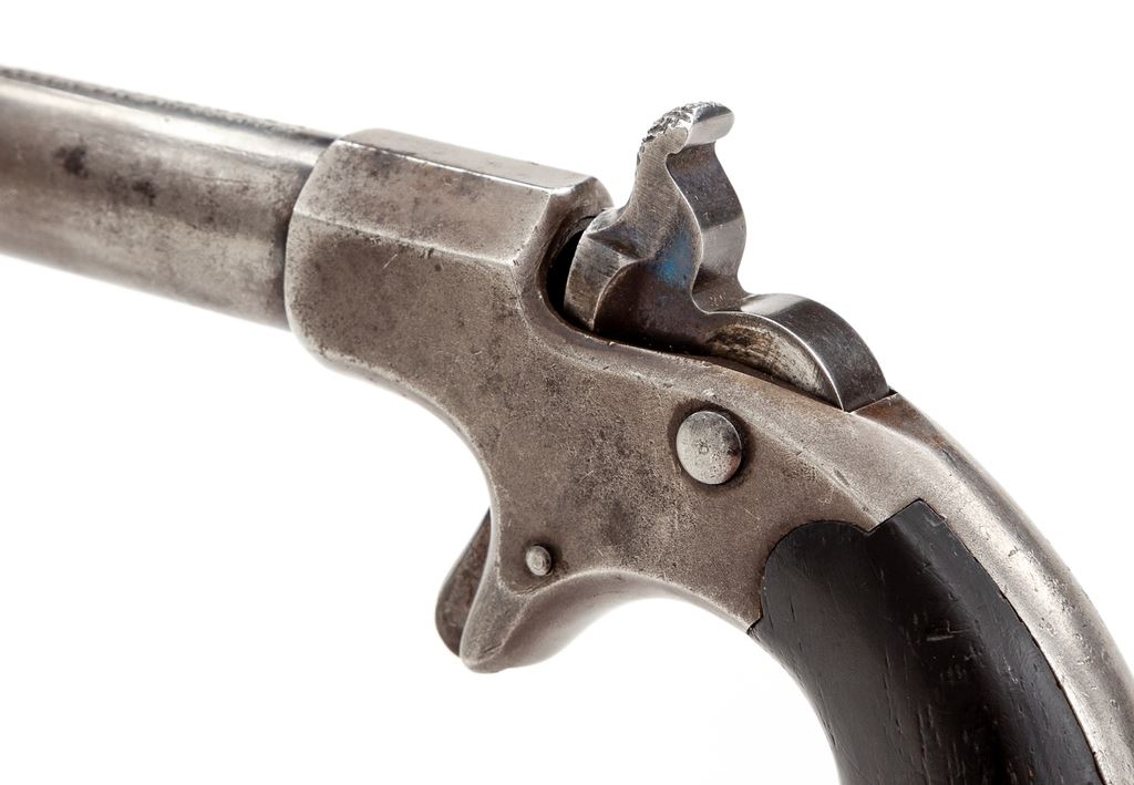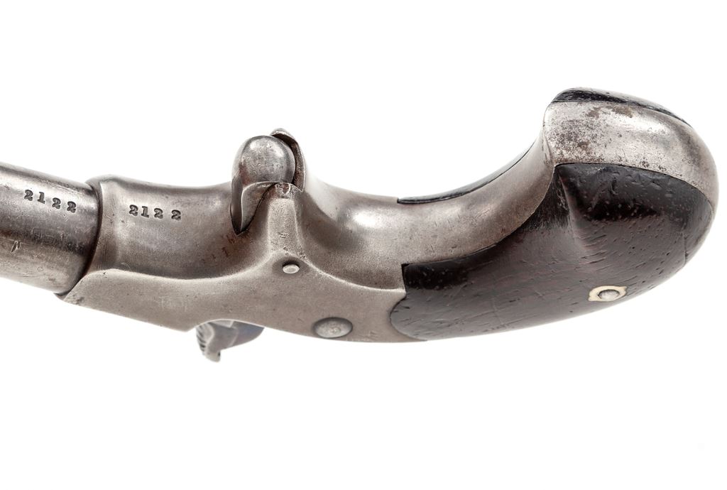 Remington-Elliot ''Vest Pocket'' Single Shot Spurtrigger Cartridge Deringer, #2122, .41 RF cal., 2.5'' round barrel marked ''Remingtons_Ilion_N.Y. / Elliot. Pat. Aug. 27. 1867'' in two lines, with two-piece varnished dark walnut (or rosewood) ''bird's head'' grips. Mfg'd 1867-88. Condition is very good retaining bright blue to sides of hammer spur, but otherwise no original finish, an overall gunmetal gray color and clear markings. Grips are very good and retain much of their original varnish finish. Action seems to work properly; bore appears clean with sharp rifling. Est.: $650-$950. (Antique)
