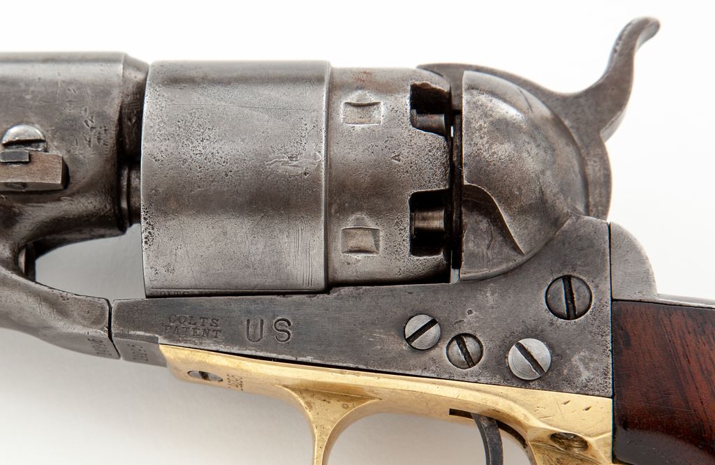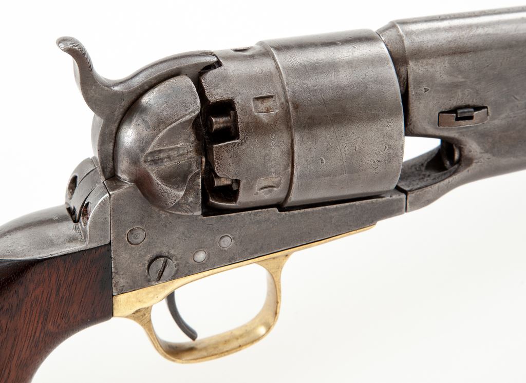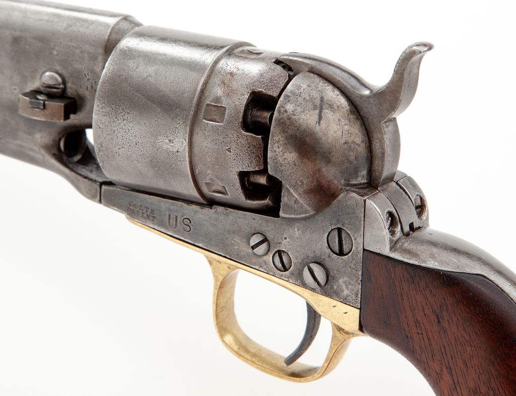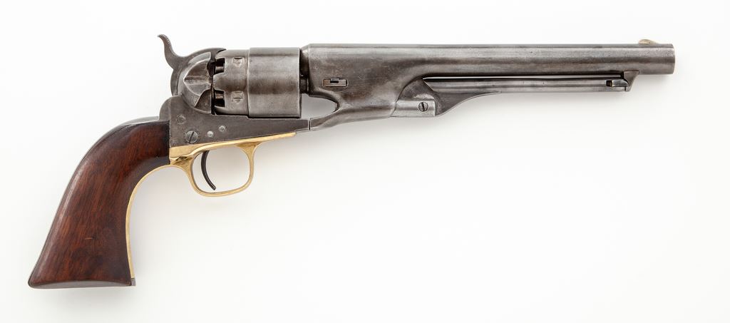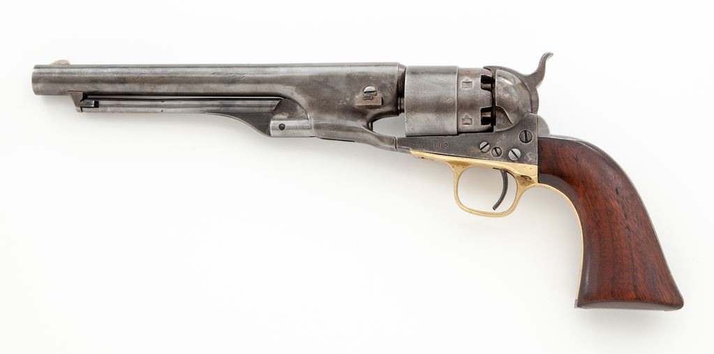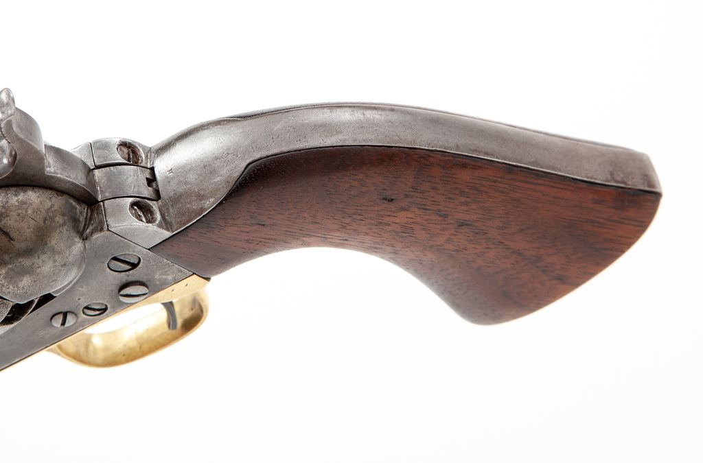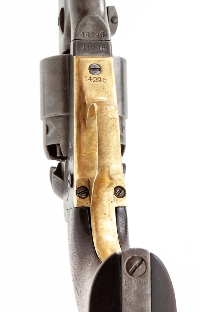 Civil War Colt Model 1860 Army Percussion Revolver, #14296, .44 cal., 8'' round ''streamlined'' barrel marked ''-Address Col. Saml. Colt New-York U.S. America-'' in one line, 6-shot round rebated cylinder with rolled naval engagement scene, 4-screw frame and backstrap cut for attachable shoulder stock, brass triggerguard and steel backstrap, originally blued and case hardened finishes, with one-piece oil-finished walnut grips. Inspector marked "A" on cylinder and barrel, "H" on backstrap, and "J" on bottom of barrel. Mfg'd 1861. Condition is very good showing no original finish and a cleaned gunmetal gray color with scattered minor nicks; no cylinder scene remains but ''Colt's Patent 14296'' and ''Pat. Sept. 10th 1850'' lines are clear. Grips are very nice, sound and smooth and fit well; all visible serial numbers match (including wedge). Large ''US'' stamping on left frame appears to be later. Action is smooth and crisp, bore is fairly clean with sharp rifling. Est.: $1,200-$1,800. (Antique)