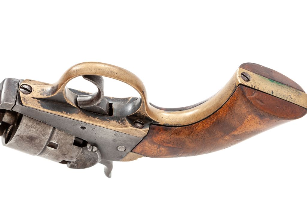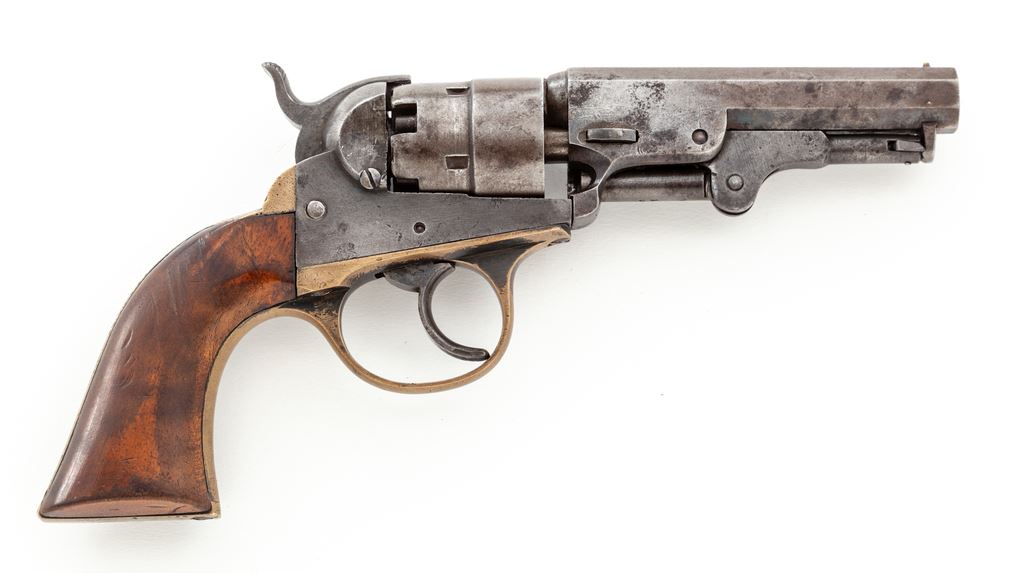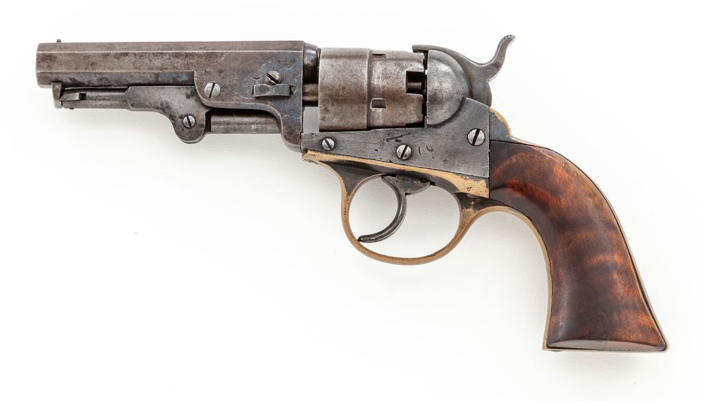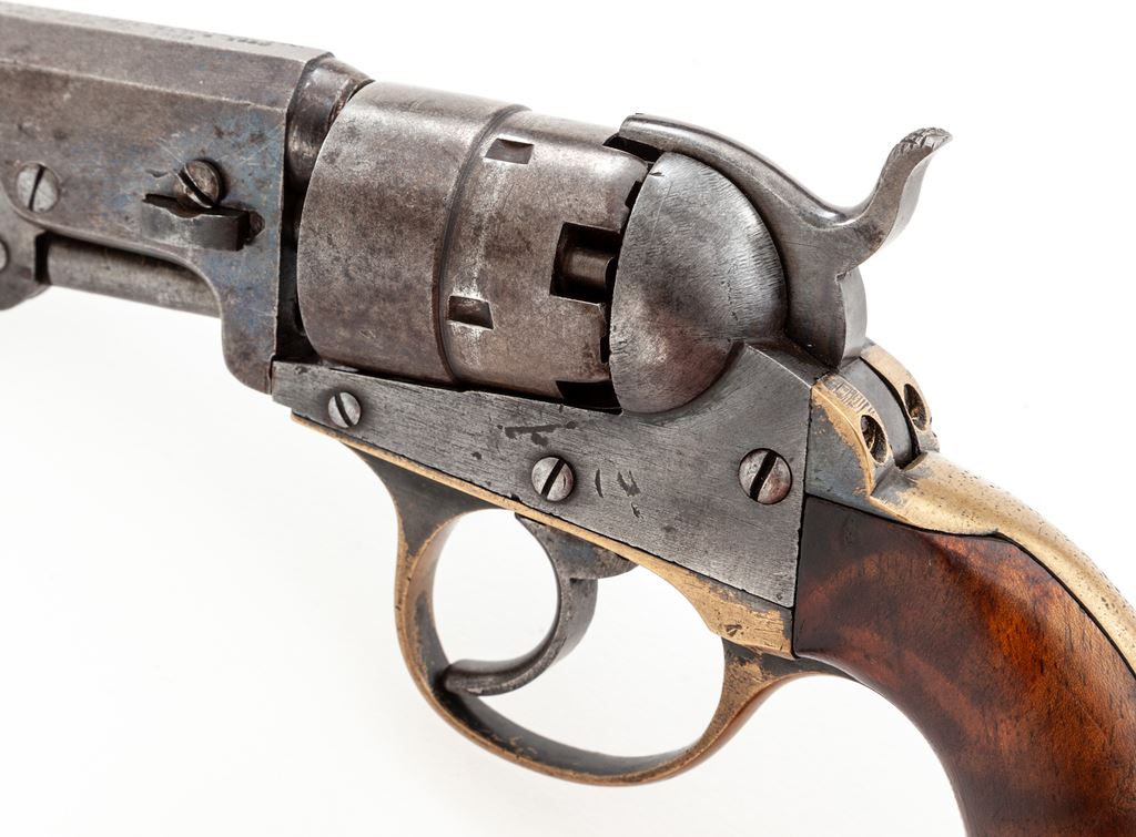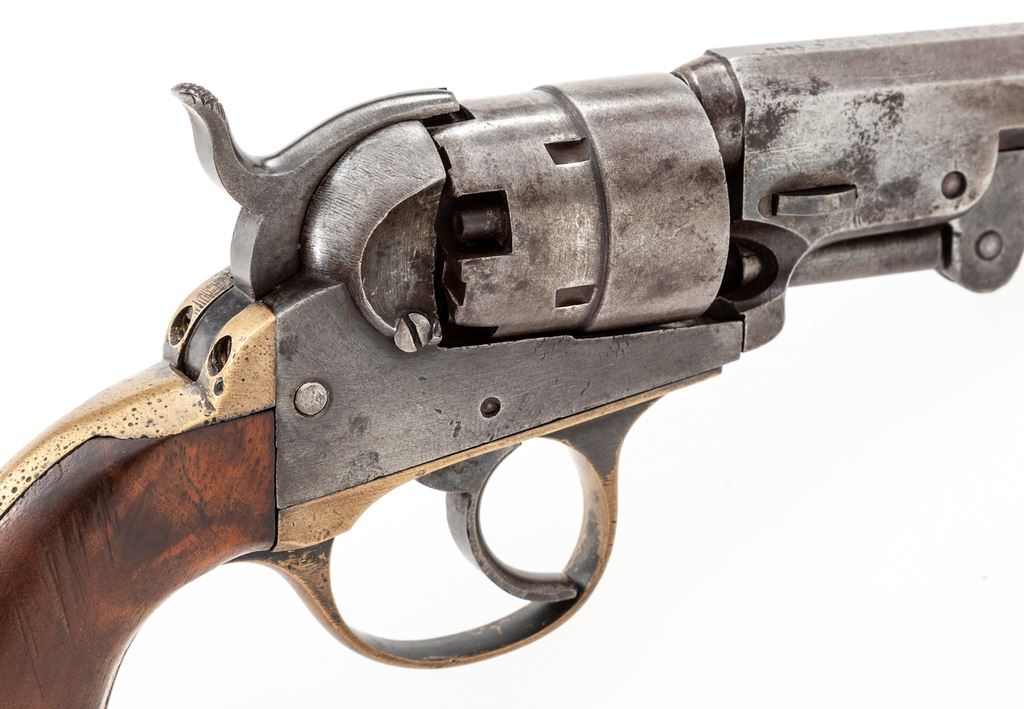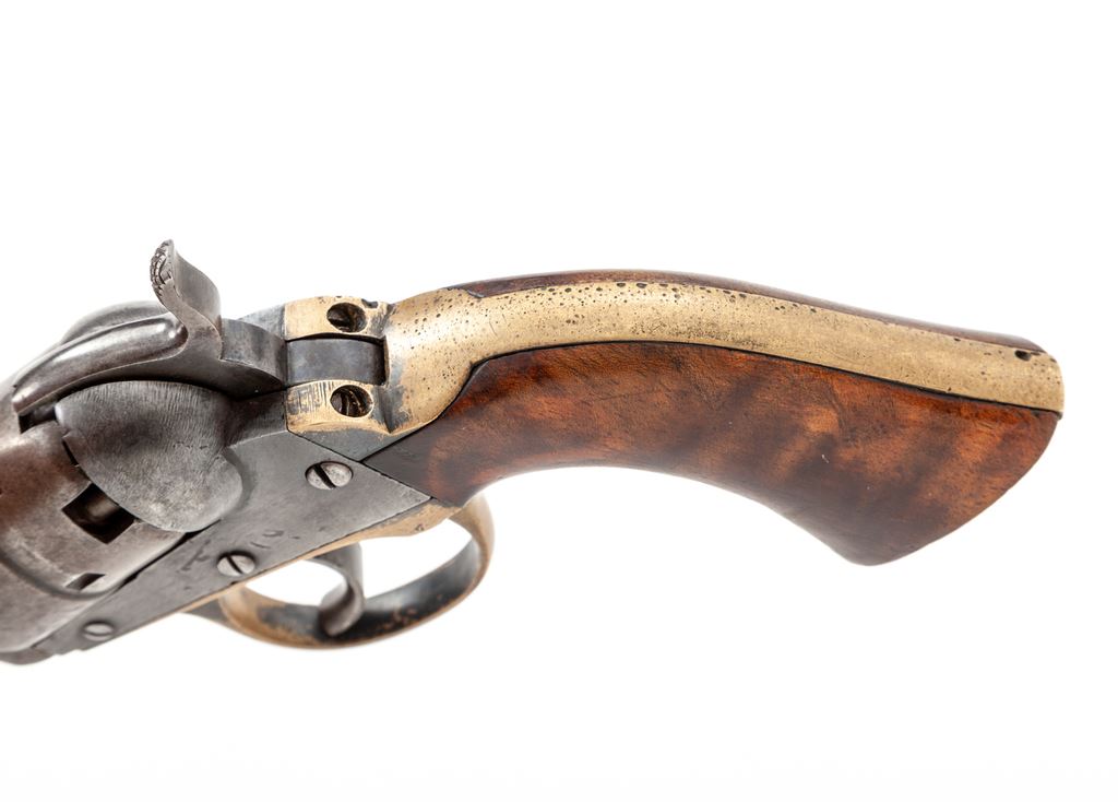 Civil War Cooper 2nd Model Double Action Navy Model Percussion Revolver, #43, .36 cal., 4'' octagonal barrel marked ''Cooper Fire Arms Mfg. Co. Frankford Phila. PA. / Pat. Jan 7, 1861 Apr 25, 1854 Sep. 4, 1860 / Sep 1, 1863 Sep 22, 1863'' in three lines, small brass post front sight and hammer notch rear sight, undecorated 5-shot rebated cylinder, brass grip straps with the large triggerguard distinctive to this maker. Originally blued finish, with one-piece walnut grips. Condition is very good with medium toned gunmetal gray steel having hints of blue in protected areas of barrel, and age toned brass. Grips are very good and fit well with a few marks on right side and retain perhaps 40% original varnish. All visible serial numbers match. Action is crisp and tight, bore is dark with visible rifling and should clean. A desirable Secondary Martial Civil War handgun having an uncharacteristically low serial number. Est.: $650-$950. (Antique)
