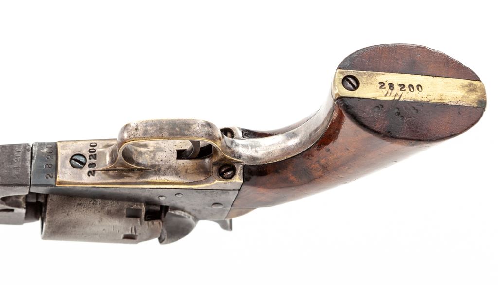 Civil War Manhattan Series III ''Navy'' Percussion Revolver, #28200, .36 cal., 5'' octagonal barrel marked ''Manhattan Fire Arms Co., Newark, N.J.'' in one line, German silver blade front sight and hammer notch rear sight, 5-shot cylinder having 12 locking notches. Originally blued and case hardened steel parts, with silver-plated brass grip straps and one-piece walnut grips. Condition is good to very good with no original finish and aged steel parts; cylinder scene and patent line mostly obscured by cleaned pitting, 95+% original silver on triggerguard and toned brass to backstrap. Grips are very nice with good color and fit and retain most original varnish finish with light wear at bottom sides. Serial numbers match including full number on wedge. Action is crisp and tight, bore is dark with distinct rifling and should clean. Est.: $450-$650. (Antique)