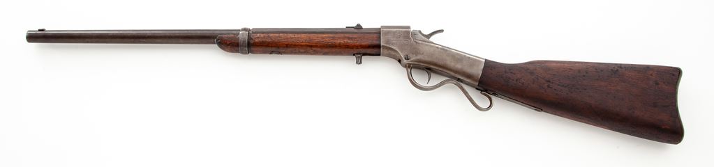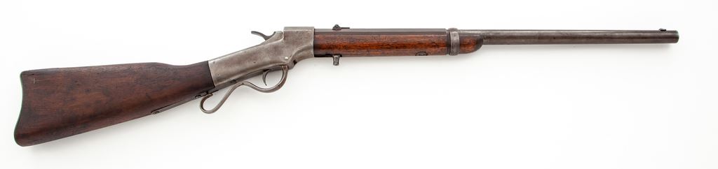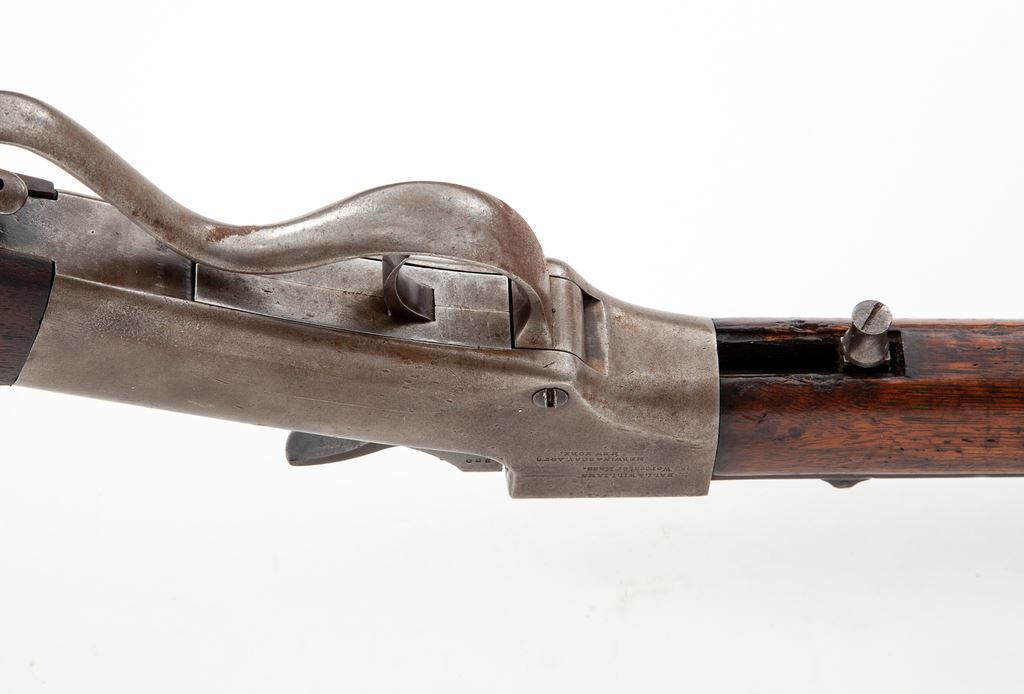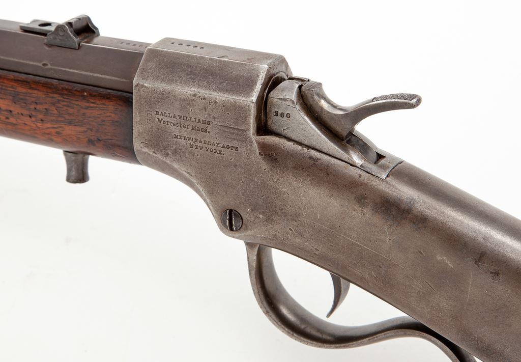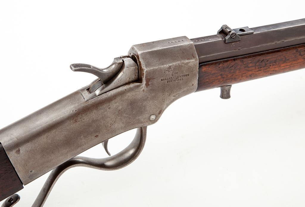 Civil War Ballard Cavalry Cartridge Carbine, #10300, .44 RF cal., 22'' round-to-octagonal barrel with dovetailed slot front and adjustable leaf rear sights, receiver marked ''Ballard's Patent/Nov. 5, 1861'' on right side, and ''Ball & Williams/Worcester, Mass./Merwin & Bray Agts./New York'' on left; iron furniture including single barrel band, serpentine actuating lever and buttplate. Two-piece walnut stocks. All visible serial numbers match. Condition is good+ retaining no original finish with a smooth brownish-gunmetal gray color, sharp edges and lettering; sling swivels are missing; buttstock is a replacement. Action works but hammer does not cock; bore is clean with distinct rifling. Est.: $650-$950. (Antique)