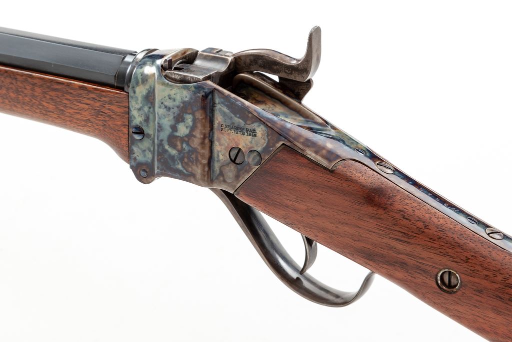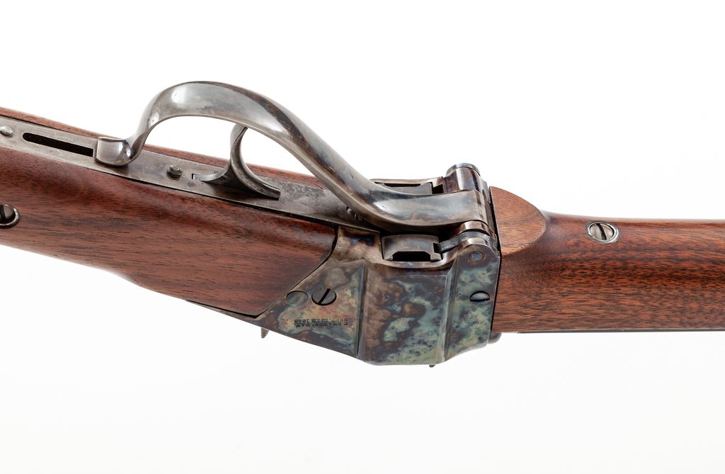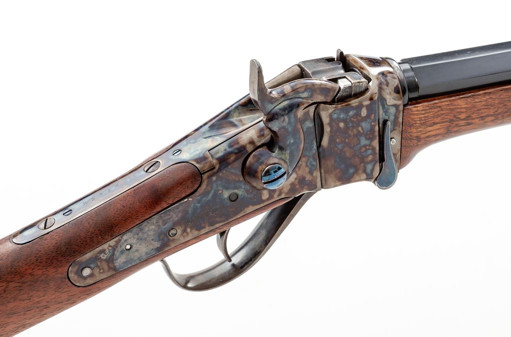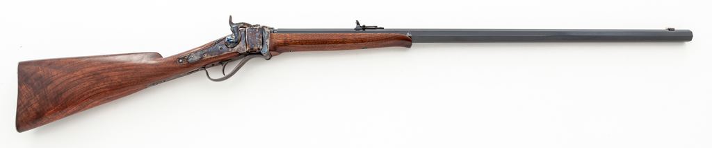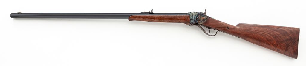 Sharps Model 1874 Sporting Rifle, #97563, .45 CF cal., 32'' blued octagonal barrel with dovetailed German silver blade front sight and ''Shiloh Sharps'' marked combination buckhorn and sliding leaf adjustable rear sight, case hardened hammer, receiver, trigger, bottom tang and actuating lever, checkered shotgun style steel buttplate. Receiver marked on left side, ''C. Sharps' Pat./Sept. 12th 1848'', and on right side, ''C. Sharps' Pat./Oct. 5th 1852'' in two lines, and serial number on rear tang. Satin-finished two-piece walnut stocks. Barrel appears to be original, with 'Old Reliable" in script to top flat (faint but visible). Condition is excellent as configured, retaining 98% barrel blue, highly figured and colored case hardening on receiver and hammer (more subdued on lever, trigger and bottom tang). Bottom tang with milled slot and threaded hole for unknown purposes. Screw slots are immaculate. Stocks are near new; buttstock with near-deluxe grain, showing just slight handling marks and 95% satin finish. Action is tight and crisp; bore is brilliant with deep rifling. Est.: $1,500-$2,500. (Antique)