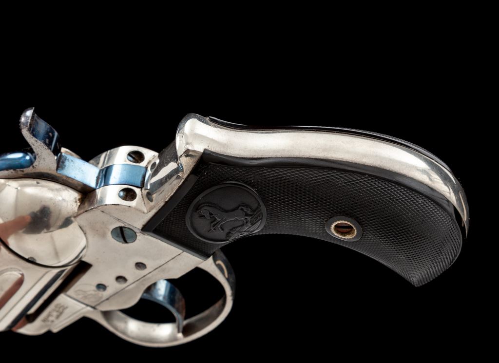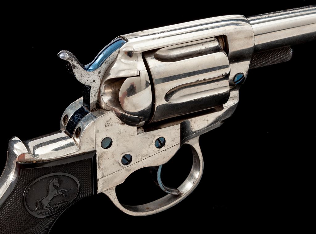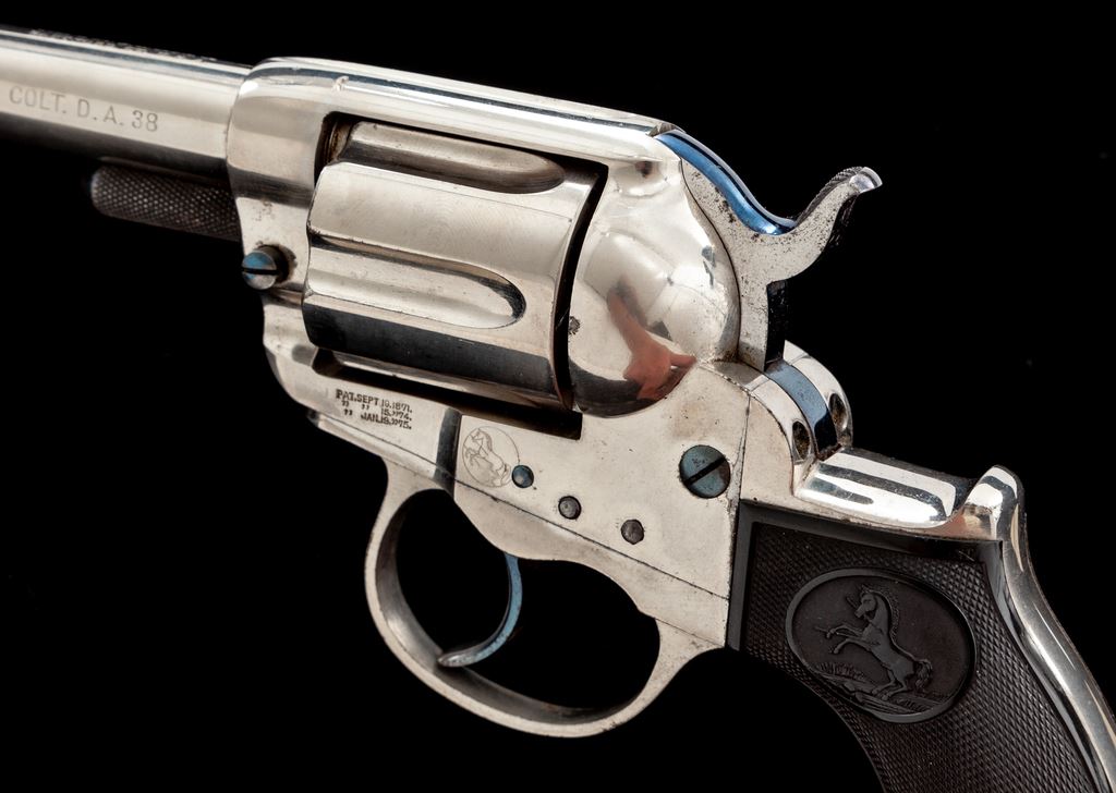Colt Model 1877 Lightning Double Action ''Storekeeper's'' Cartridge Revolver, #96625, .38 Colt CF cal., 3.5'' ejectorless round barrel marked ''Colt's Pt. F.A. Mfg. Co./Hartford, CT. U.S.A.'' in two lines and, ''Colt D.A. .38'' on left side; 6-shot fluted cylinder, left frame marked with three-line 1871-74-75 patent dates and circular Rampant Colt logo, finely checkered black hard rubber ''bird's head'' grips having the Rampant Colt in a relief oval at top. Mfg'd 1894. Originally finished in full nickel plate with fire blued screws, blued trigger, and blued hammer with polished sides in the white. All serial numbers match including cylinder; loading gate correctly numbered ''188''. Condition is excellent, retaining 99% bright nickel, bright blue screws, hammer with all original blue and bright sides, and blue on checkered cylinder pin. Grips are unblemished with sharp checkering and Colt logo. Action is crisp and sure, bore is mirror bright with sharp rifling and the gun appears unfired. Est.: $1,250-$1,750. (Antique)