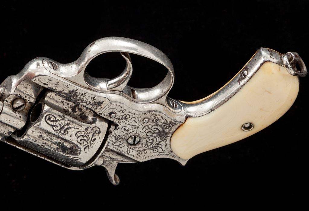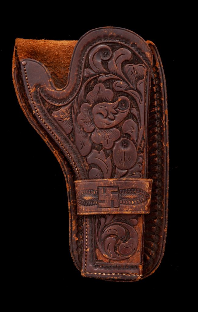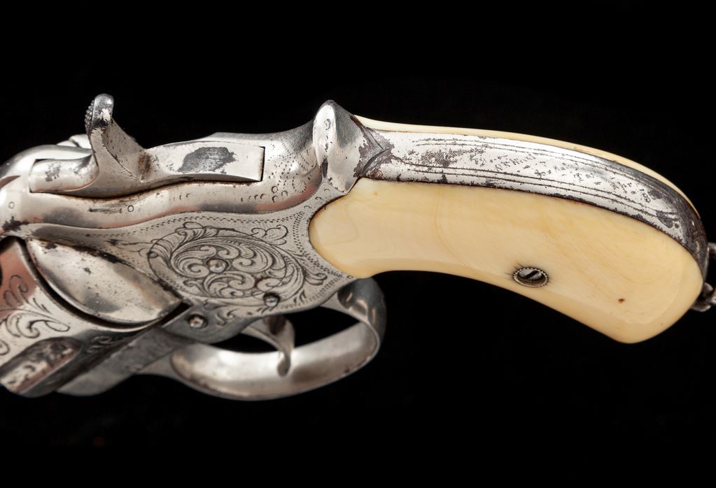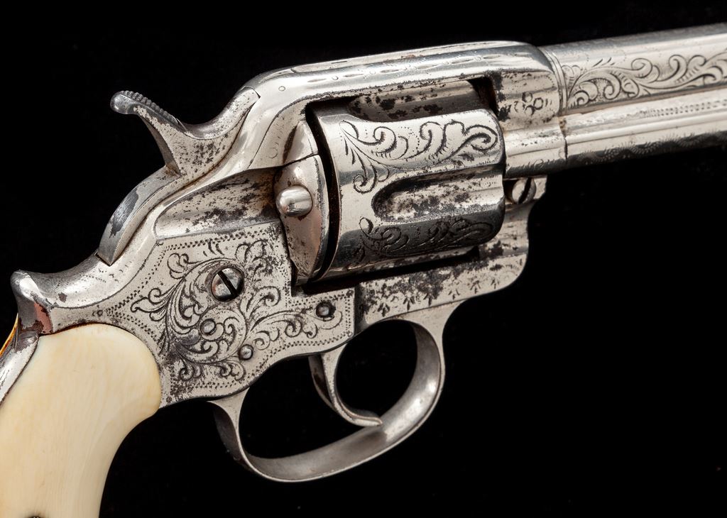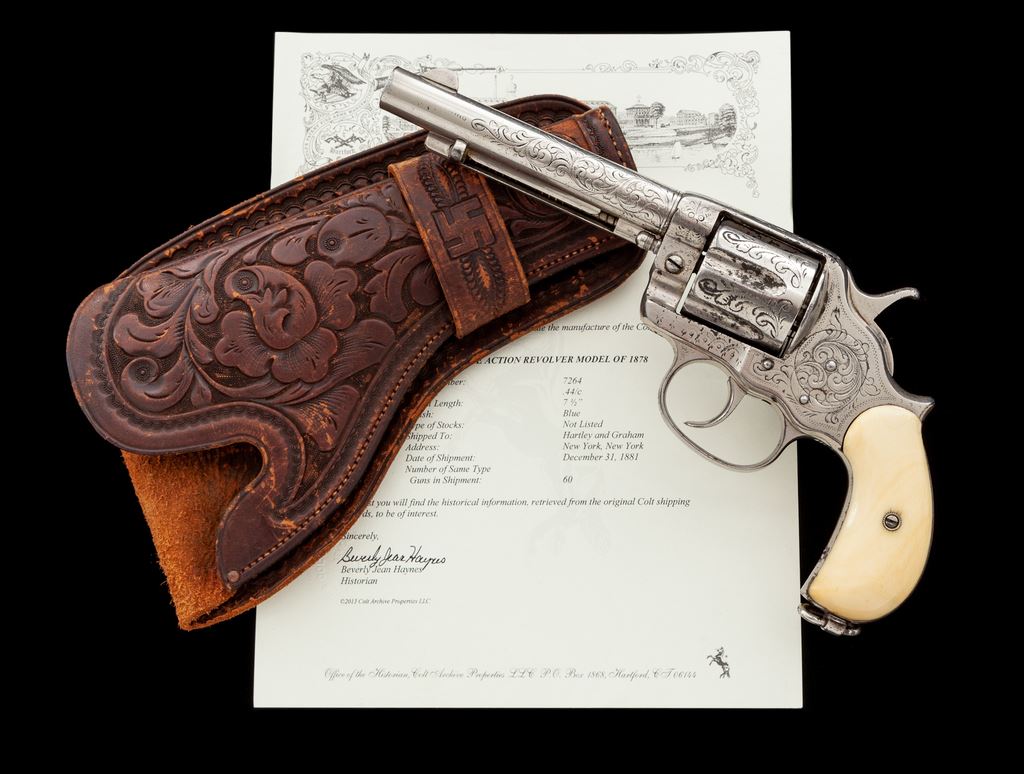 Engraved Colt Model 1878 Double Action Frontier Cartridge Revolver, with holster, #7264, .44-40 CF cal., 5.5'' round barrel marked ''Colt's Pt. F. A. Mfg. Co. Hartford, CT. U.S.A.'' in one line, full nickel-plated finish, two-piece ivory ''bird's head'' grips. Visible serial number ''7264'' appears on bottom of grip straps ahead of lanyard loop; loading gate is unmarked; the numbers ''2-6-4'' are stamped between each bore on rear of cylinder. Engraving on backstrap is barely legible but appears to read “R.H. Ward to N.S. Ward, San Antonio, Tex., Apr. 85”. Mfg'd. 1881. Left front triggerguard bow has the ''44 C.F.'' designation in tiny numbers. A 2013-dated Colt factory letter accompanying this revolver states that it was shipped to Hartley and Graham, New York City, on Dec. 31, 1881 in a shipment of 60 guns, and states that it left the factory with a 7.5'' barrel, blued finish and grips ''Not Listed''. It is likely that H&G shortened the barrel to the present 5.5'' and had the gun engraved in a loose scrolling-vine ''New York'' style at the time. The ivory grips may have been added then as well, although the number ''64'' is written in pencil inside the left panel. Condition is fine, retaining approx. 80% nickel plate showing erosion mainly at right side of frame and in cylinder flutes. Markings are very good, engraving is mostly sharp. Ivory grips are without cracks, have a small loss along right backstrap, and show excellent coloration. Action is smooth and tight but cylinder does not lock up at full cock; bore is very good with defined rifling. Holster is unmarked but shows quality workmanship with deep floral carving and an early American Indian symbol on the Mexican loop. Est.: $1,500-$2,500. (Antique)