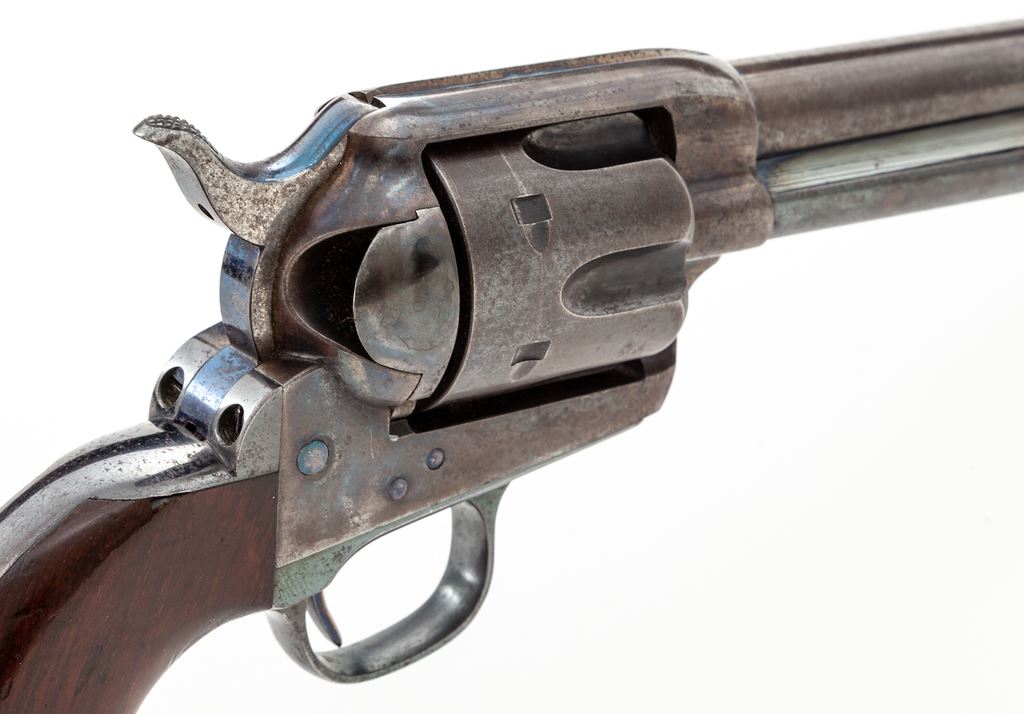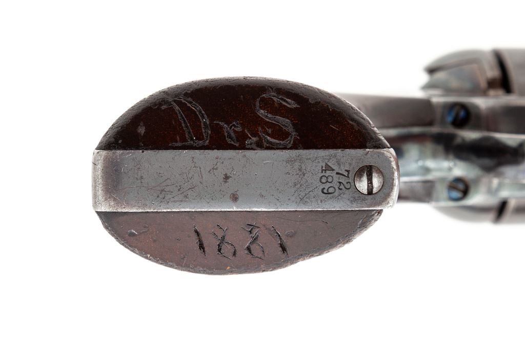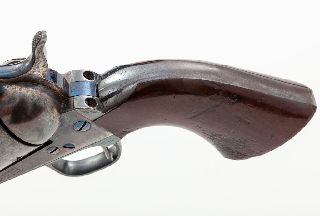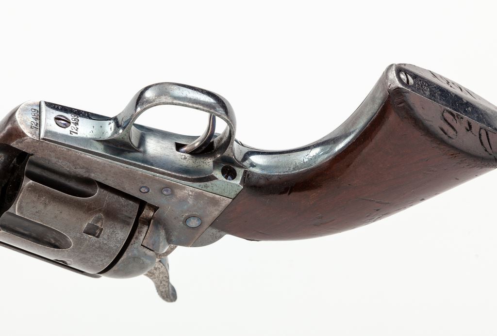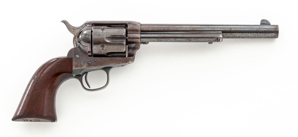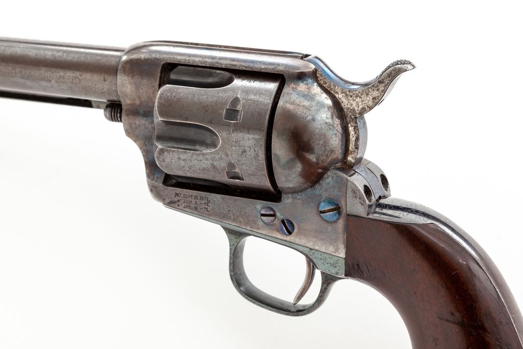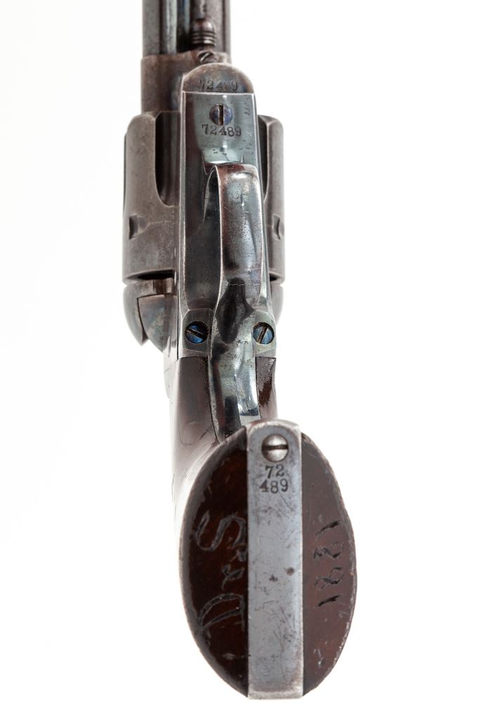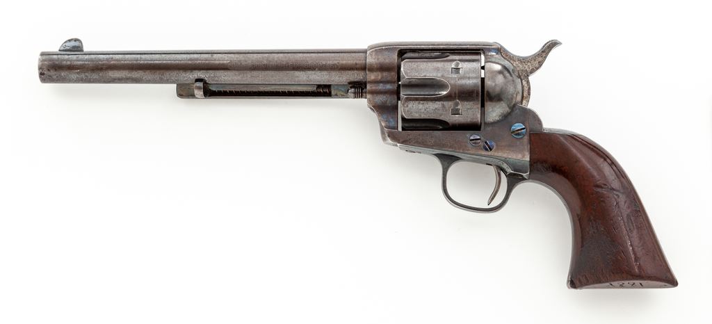 ''Colt Frontier Six-Shooter'' Etched Panel Model 1873 Colt Single Action Army Cartridge Revolver, #72489, .44-40 CF cal., 7.5'' round barrel marked ''Colt's Pt. F. A. Mfg. Co. Hartford, CT. U.S.A.'' in one line, left frame with three-line 1871-72-75 patent dates, originally blued and case hardened finish, blued hammer with polished sides in the ''white'', blued trigger and screws; steel grip straps with one-piece varnished walnut grips. All visible serial numbers match, including ''2489'' on cylinder periphery; loading gate correctly marked ''6876'', later-style crescent-shaped ejector rod head. Mfg'd 1881. Left side of barrel has the ''Colt Frontier Six-Shooter'' etched panel; the corresponding ''44'' caliber designation appears in tiny numbers on bottom of barrel ahead of cylinder pin. A 2018-dated Colt factory letter accompanying this revolver states that it was shipped to E.K. Tryon, Jr. & Co., Phila., PA, on Oct. 22, 1881 in a shipment of 4 guns, and confirms all the above features but for the barrel length and grips, as 7.5'' and walnut were considered ''standard'' at the time. Condition is fine+, retaining approx. 60% darkening barrel blue, 40% cylinder blue, mostly in the flutes, and approx. 75-80% deep Colt blue to grip straps with wear mostly confined to backstrap; frame retains 50% case hardening, silvering and darkening. All markings are sharp; most screw heads retain their original bright fire blue. Walnut grips retain approx. 75% original glossy varnish with a patch of wear and loss to left side; ''Dr. S'' and ''1881'' were hand-scribed into bottom grip panels. Action is crisp, tight and positive; bore is bright with sharp rifling. Est.: $5,000-$7,500. (Antique)