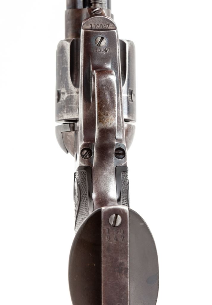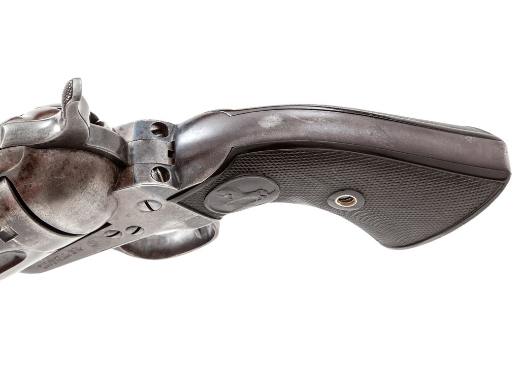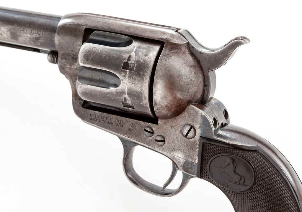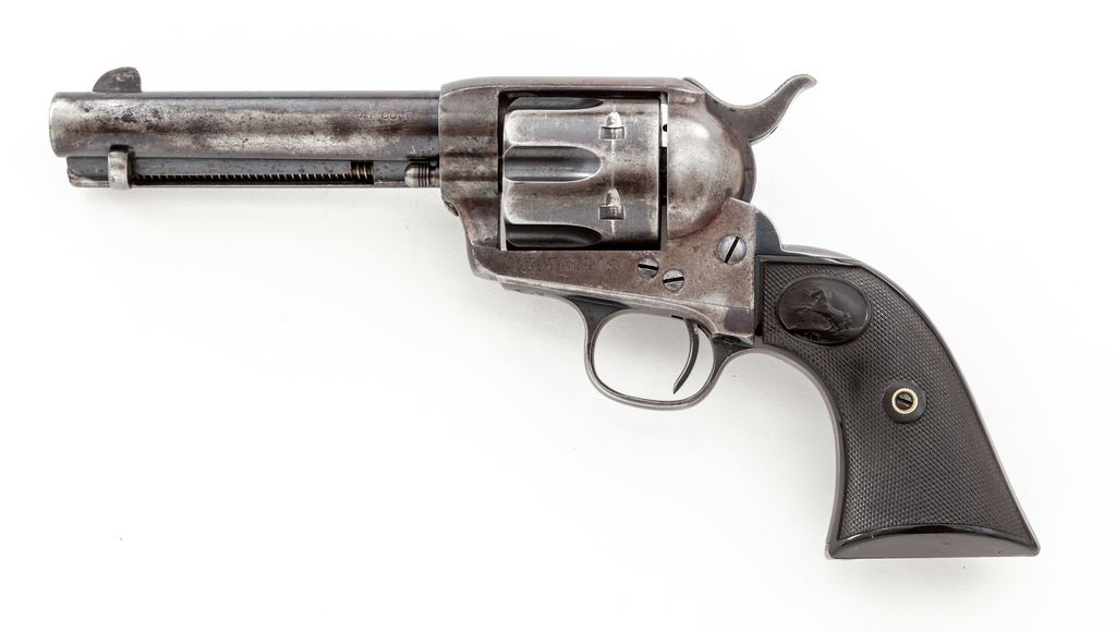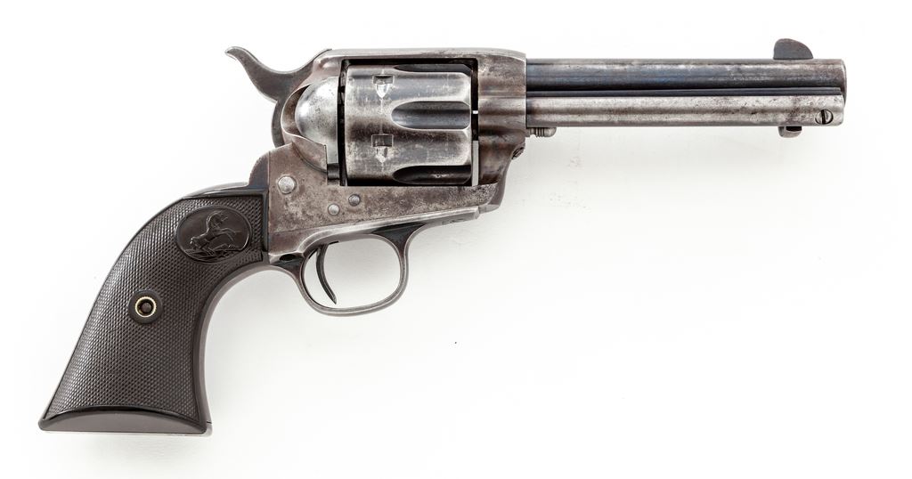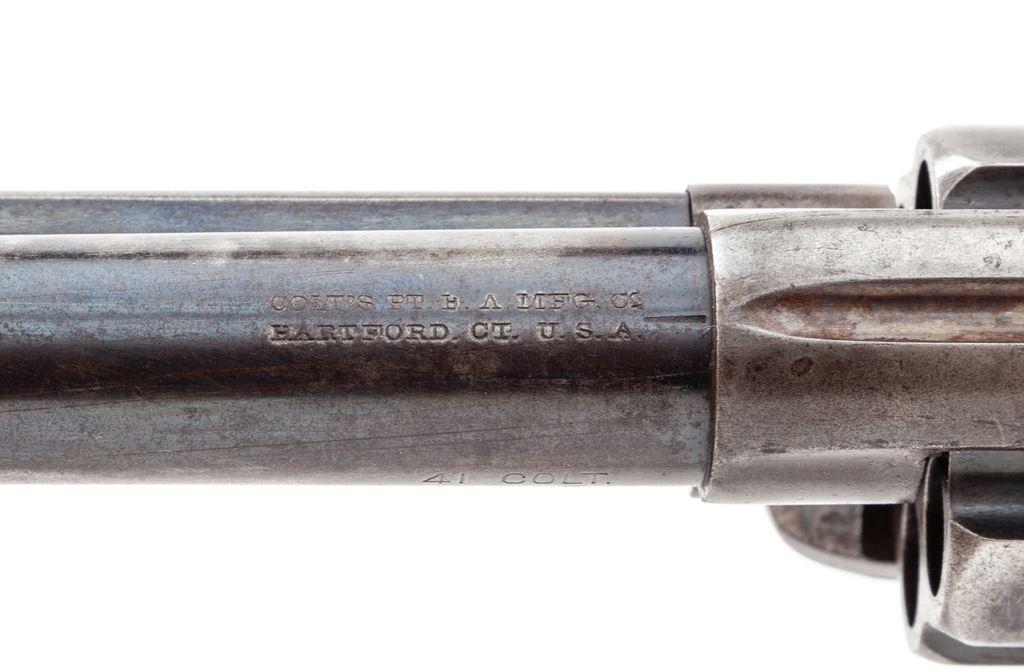 Antique Colt Model 1873 Single Action Army Cartridge Revolver, #160947, .41 Colt CF cal., 4.75'' round barrel marked ''Colt's Pt. F. A. Mfg. Co. / Hartford, CT. U.S.A.'' in two lines, left frame with two-line 1871-75 patent dates and circular Rampant Colt logo, ''41 Colt.'' marked on left side of barrel ahead of juncture with frame, originally blued and case hardened finishes, steel grip straps with two-piece checkered hard rubber grips having the Rampant Colt within an oval cartouche at top. All visible matching serial numbers; loading gate correctly marked ''569''. Mfg'd 1895. Condition is very good, with smooth metal retaining approx. 40% thinning and toning original blue to barrel (losses mainly confined to left side), 80% deep blue to top and bottom of ejector rod housing, 35% thin blue to cylinder with deep original blue in flutes, 5% original blue on triggerguard bows and backstrap apron, the balance gunmetal gray. Frame and hammer retain darkened and silvered case colors; most screws with unmarred slots. Grips show light wear to checkering and Colt logo, no chips or cracks, and fit well. Action is crisp and sure, bore is shiny with defined rifling. A nice Single Action, in the desirable ''Cowboy'' caliber. From the iconic Mel Guy Collection of Single Action Colt revolvers. Est.: $3,500-$5,000. (Antique)