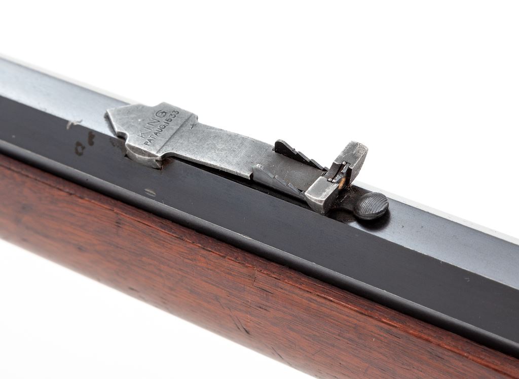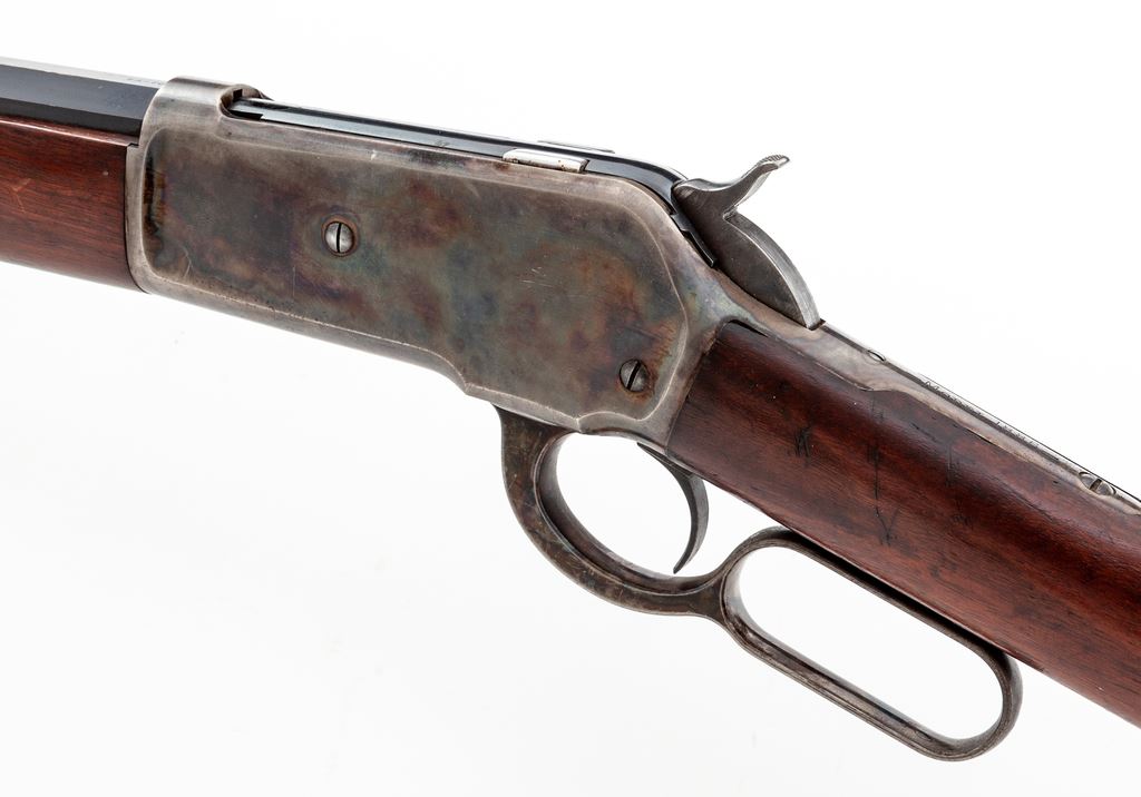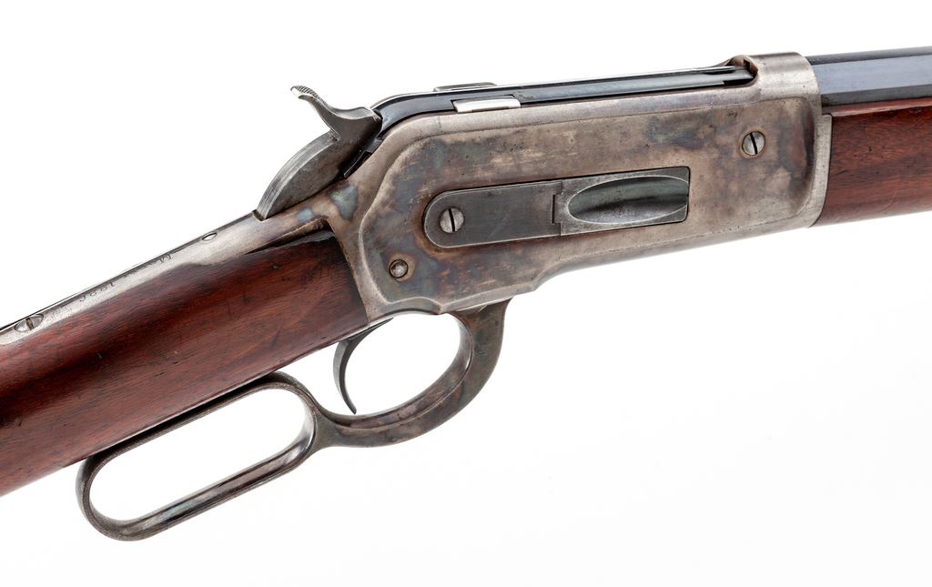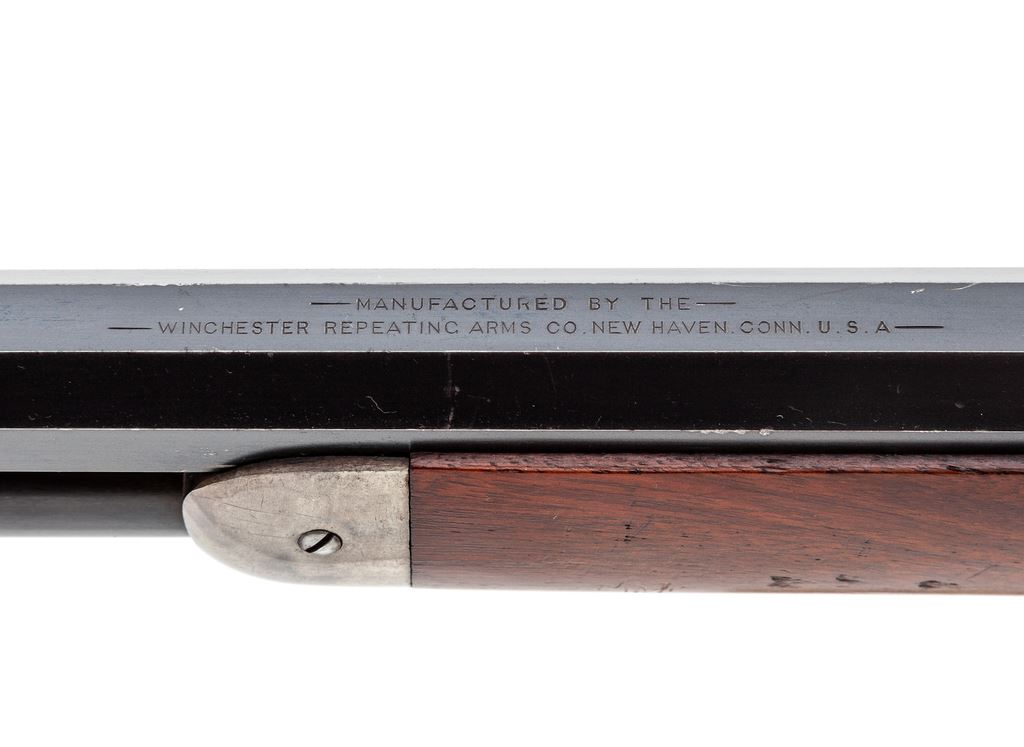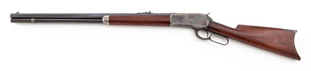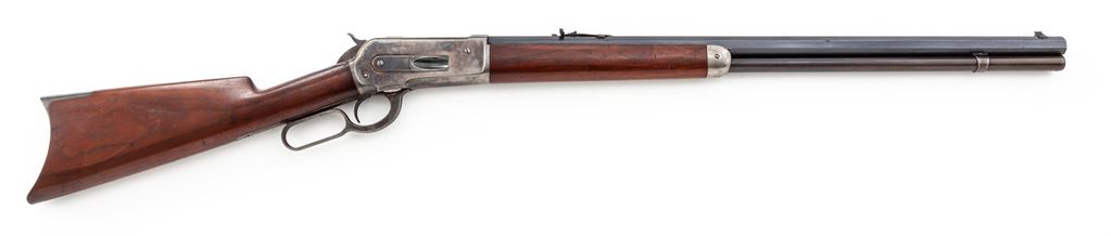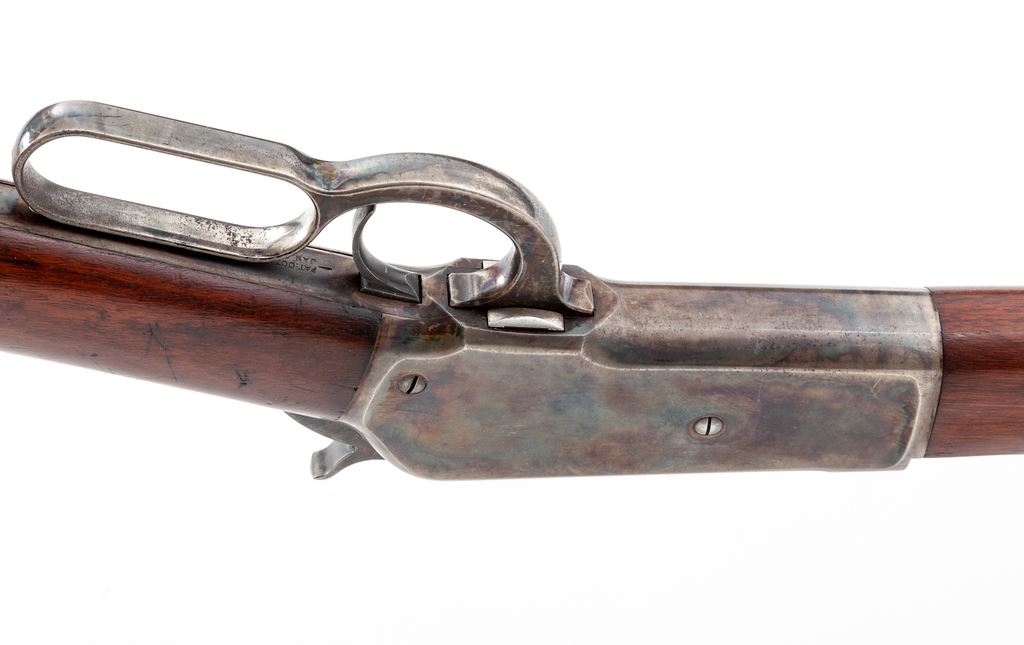 Antique Winchester Model 1886 Lever Action Rifle, #96744, .45-70 cal., 26'' blue octagonal barrel, case hardened frame and lever, smooth straight walnut stock and forend, crescent steel buttplate, with King's front and rear sight. Mfg'd 1895. Condition is near excellent. Barrel retains approx. 92%-94% original blue; magazine tube is somewhat thinner, especially towards muzzle. Case colored frame, lever and hammer have thinned to approx. 90%, with nice well-defined case colors to both sides. Forend cap has mostly thinned to a silvery color. Loading gate with approx. 60% blue remaining. Buttstock and forend with light general scuffs and scratches, and a small sliver missing at right side upper tang measuring approx. .075''x.0125''. Crisp and smooth action, mirror bright bore. Est.: $6,000-$8,000. (Antique)