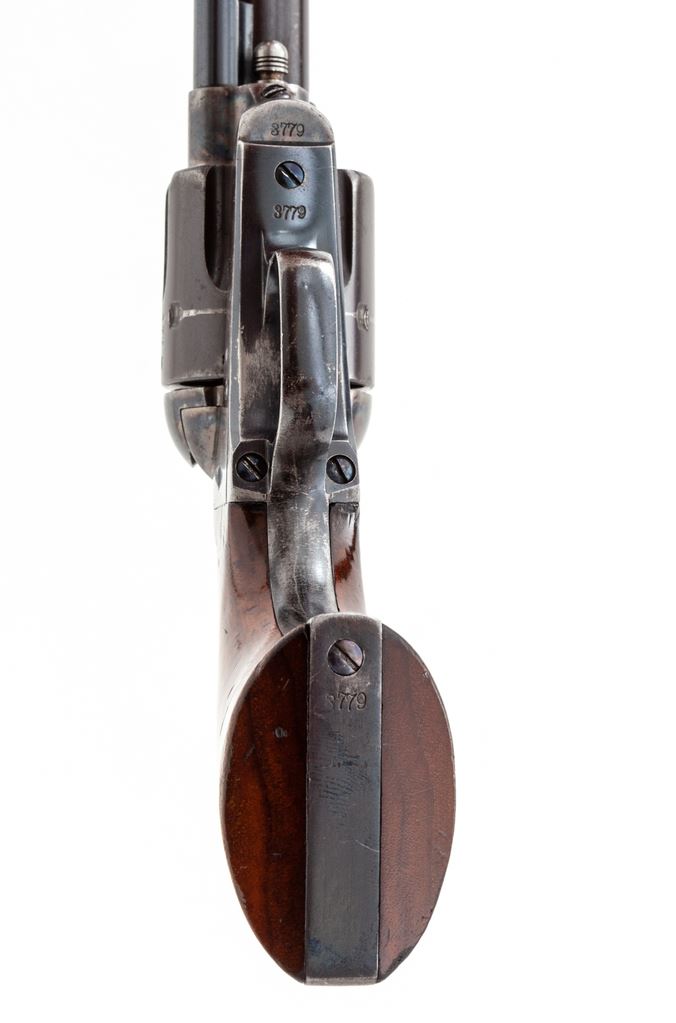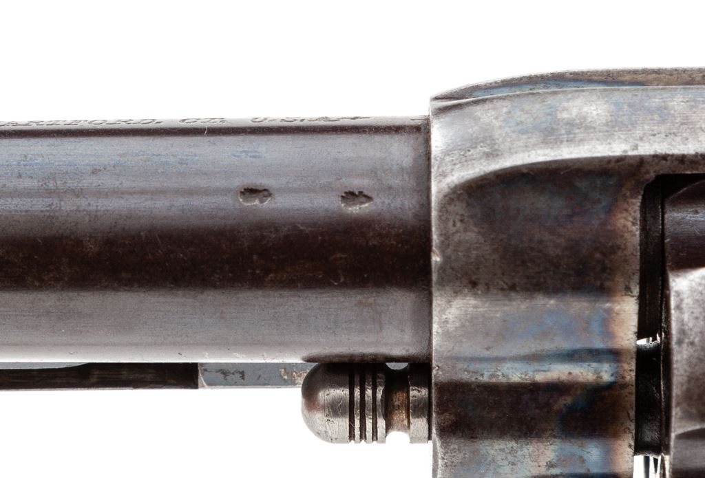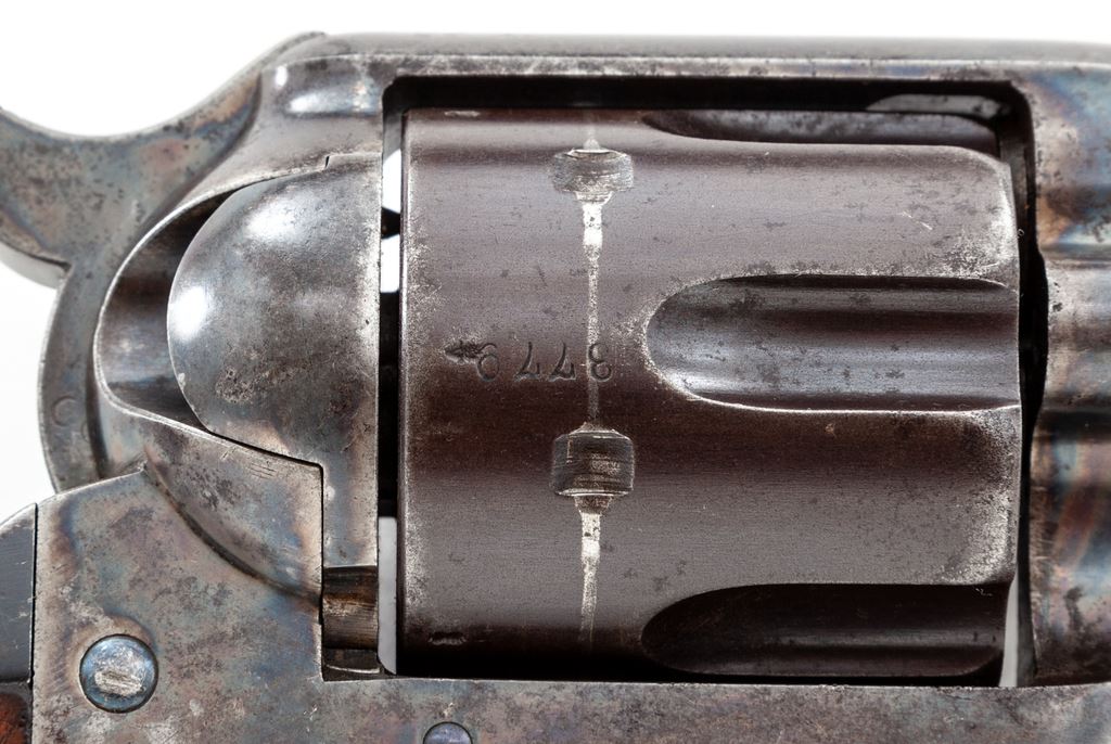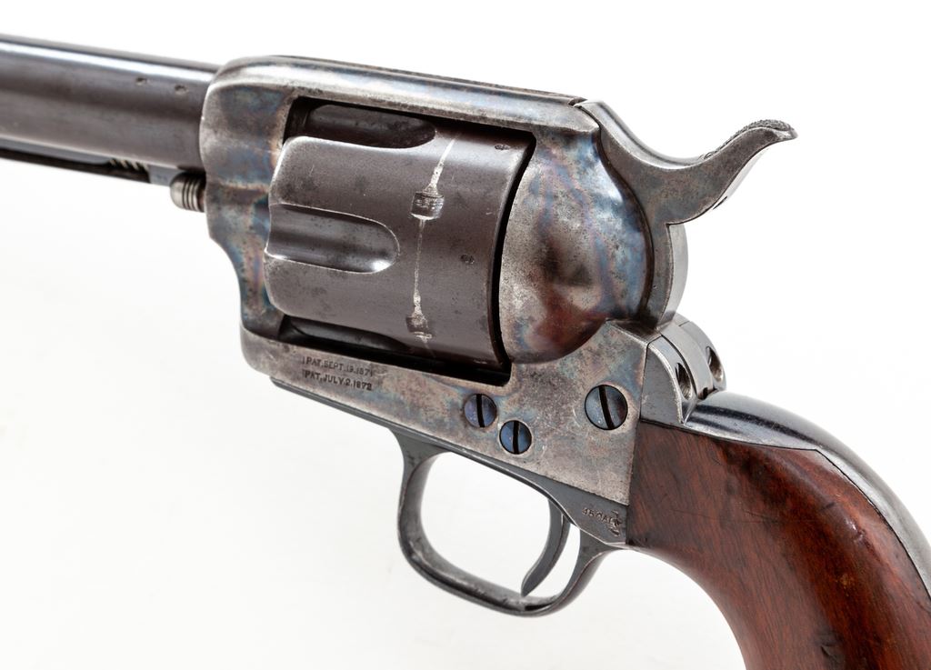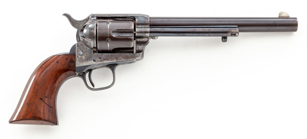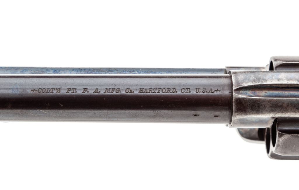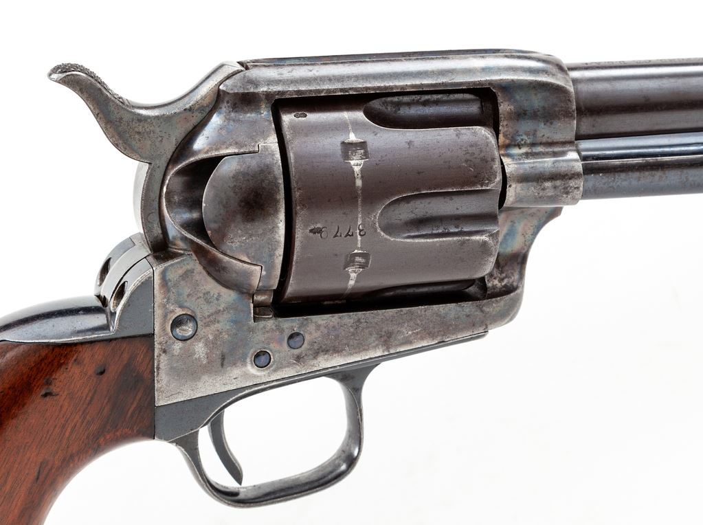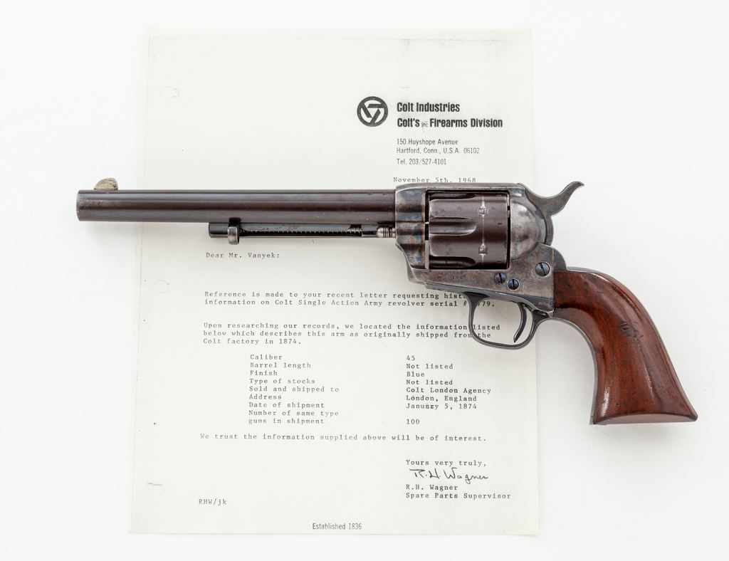 Antique British Proofed Colt Model 1873 Single Action Army Cartridge Revolver, #3779, .450 Boxer CF cal., 7.5'' round barrel marked ''Colt's Pt. F. A. Mfg. Co. Hartford, CT U.S.A.'' in italic font, tiny British proofmarks on cylinder periphery behind each flute and on left side of barrel at frame juncture, left frame with two-line 1871-72 patent dates, ''45 Cal'' marked on left triggerguard bolster, originally blued and case hardened finishes, steel grip straps with varnished one-piece walnut grip. All visible matching serial numbers; loading gate correctly marked ''69''. Mfg'd late 1873-early 1874; originally shipped to Colt's London Agency on Jan. 5, 1874, in a shipment of 100 guns. Condition is excellent, with smooth metal retaining most thinning and toning original blue to barrel, approx. 85% deep blue to ejector rod housing, bluish-brown cylinder with much blue in flutes, most original blue on front half of triggerguard and backstrap apron and bottom, the balance a pleasing gunmetal gray. Frame and hammer retain much bright case color; screws retain bright original fire blue with unmarred slots. Grips show a few age and use marks, fit well, have wonderful color, and retain most of their original varnish. Action is crisp and sure, bore appears excellent. Simply put, an exemplary early Single Action, in a desirable large caliber, accompanied by a 1968-dated Colt factory letter verifying all the above features and signed by famed Colt historian R.H. Wagner. From the iconic Mel Guy Collection of Single Action Colt revolvers. Est.: $15,000-$18,000. (Antique)