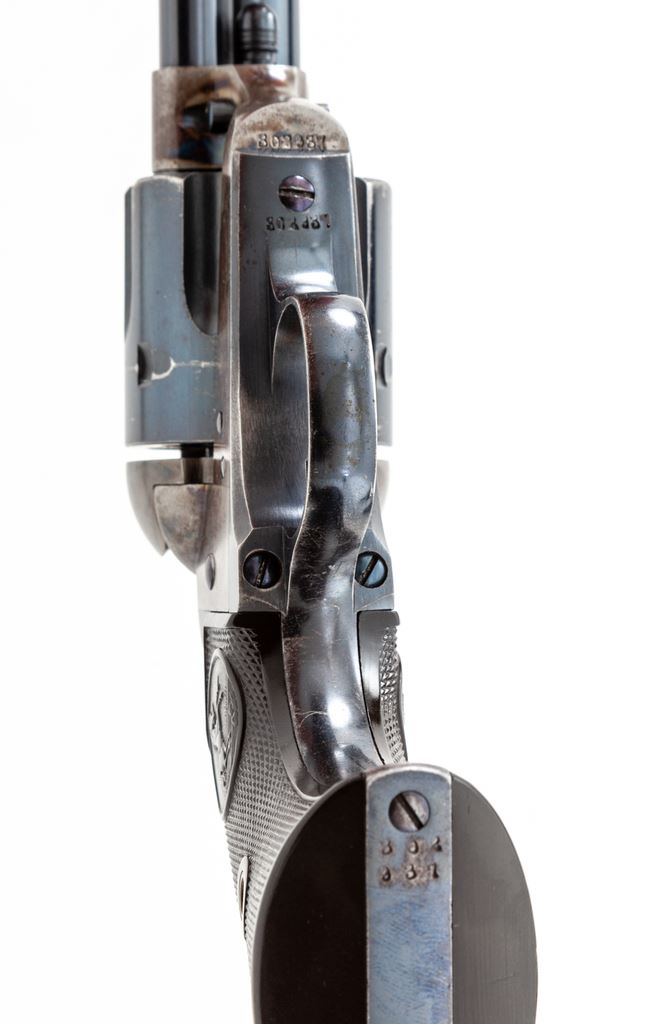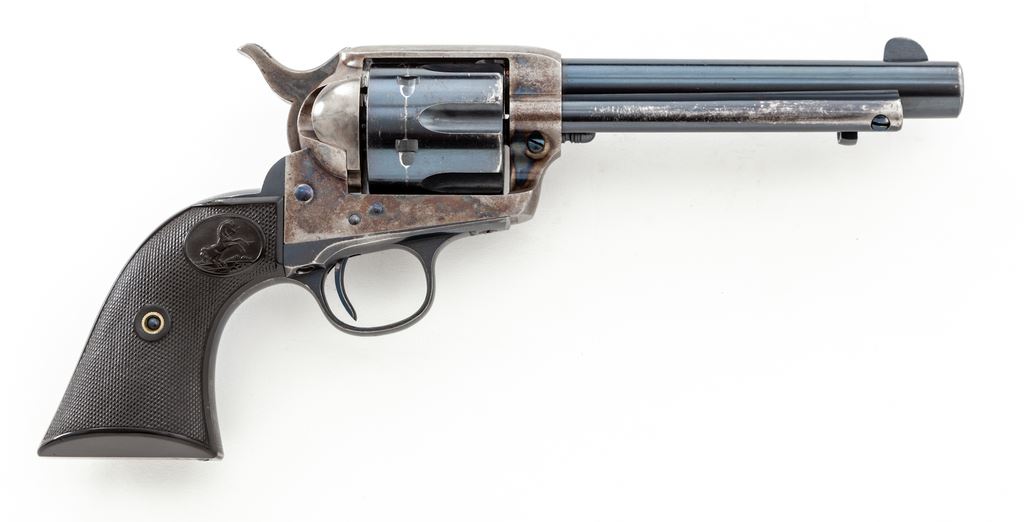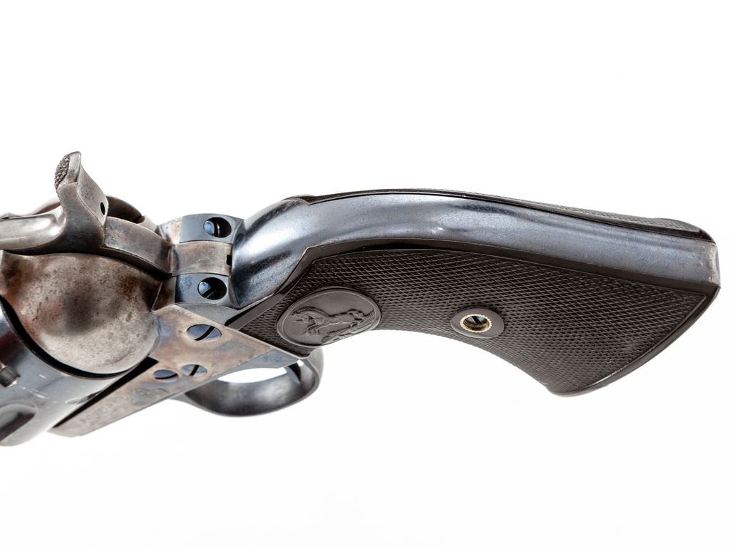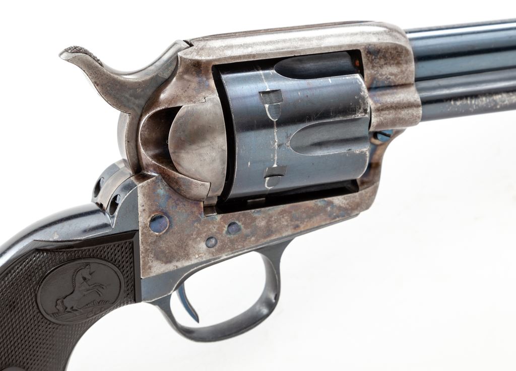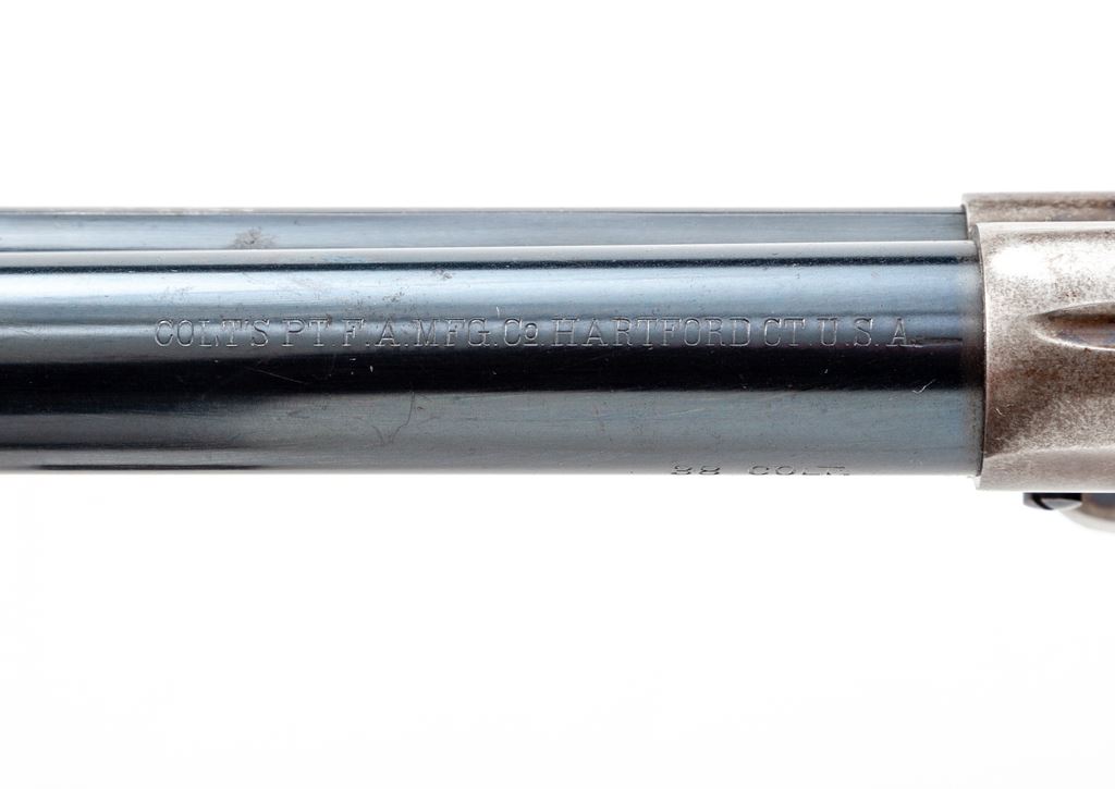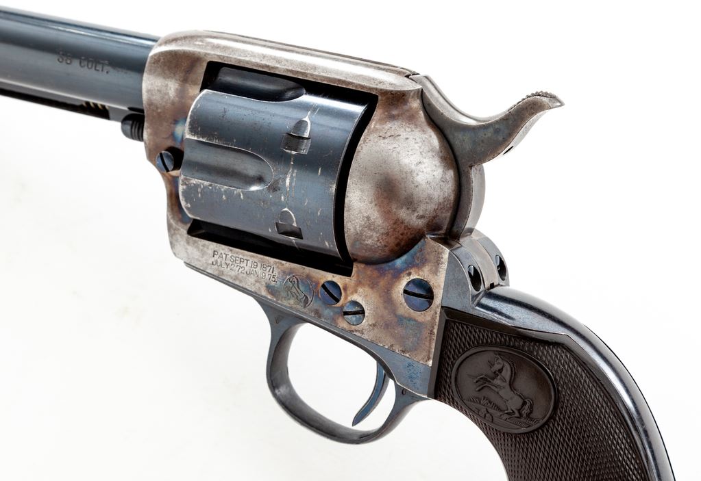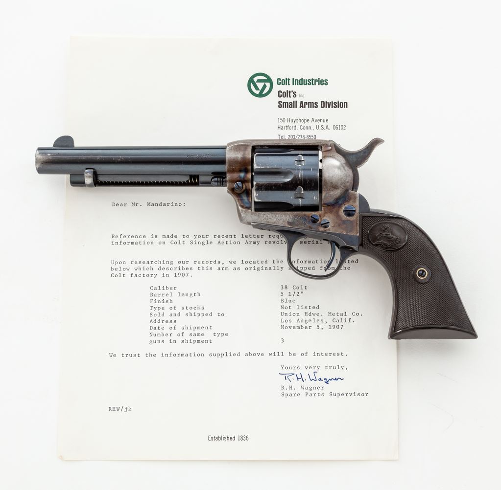 Colt Model 1873 Single Action Army Cartridge Revolver, #302937, .38 Colt CF cal., 5.5'' round barrel marked ''Colt's Pt. F. A. Mfg. Co. Hartford, CT U.S.A.'' in one line, and ''38 Colt.'' to left side near juncture with frame, left frame with two-line 1871-75 patent dates and circled Rampant Colt logo, originally blued and case hardened finishes, steel grip straps with black two-piece checkered hard rubber grips having the Rampant Colt logo within an oval at top. All visible matching serial numbers; loading gate correctly marked ''21''. Mfg'd 1907. Condition is excellent, probably unfired, the barrel retaining approx. 95% deep glossy blue (thinning to left side at muzzle and to side of ejector housing) and blue in the bore, the cylinder retaining 90% blue with deep original blue in the flutes and in the cylinder bores, the grip straps with 95% deep blue (thinning to base of backstrap). Frame and hammer retain pleasing, evenly mottled case colors, bright on sides; trigger and screws show brilliant fire blue and unmarred screw slots. Grips are unworn with sharp checkering, and fit well. Action is crisp and sure, bore is shiny with very good rifling. This exemplary Single Action was shipped to Union Hardware Metal Co. in Los Angeles, CA, on November 5, 1907 in a shipment of just three guns. All the above features are confirmed in an accompanying 1969-dated Colt factory letter signed by famed Colt historian R.H. Wagner. From the iconic Mel Guy Collection of Single Action Colt revolvers. Est.: $7,000-$9,000. (C&R/PPT)