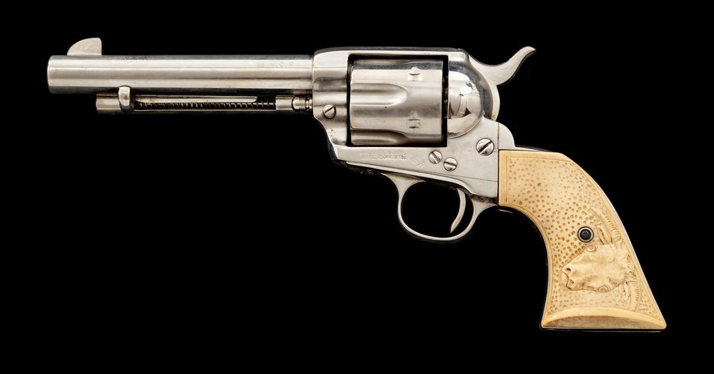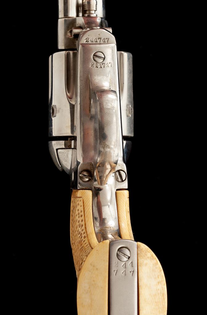 Colt Model 1873 Single Action Army Cartridge Revolver, #244747, .38 WCF cal., 5.5'' round barrel with one-line ''Colt's Pt. F.A. Mfg. Co. Hartford, CT. U.S.A.'' top address and ''38 W.C.F.'' marked on left side, 6-shot fluted cylinder, left frame with two-line 1871-72-75 patent dates and ''Rampant Colt'' logo, full nickel plate finish, two-piece ''steer head'' composite grips. Mfg'd 1903. All matching visible serial numbers; loading gate correctly marked ''1026''. Condition is very good with possibly refinished frame and straps; sharp markings overall, retaining approx. 90% nickel. Grips are very good with sharp detail. Action is crisp and light, perhaps tuned; bore is clean with sharp rifling. Est.: $1,000-$1,500. (C&R/PPT)