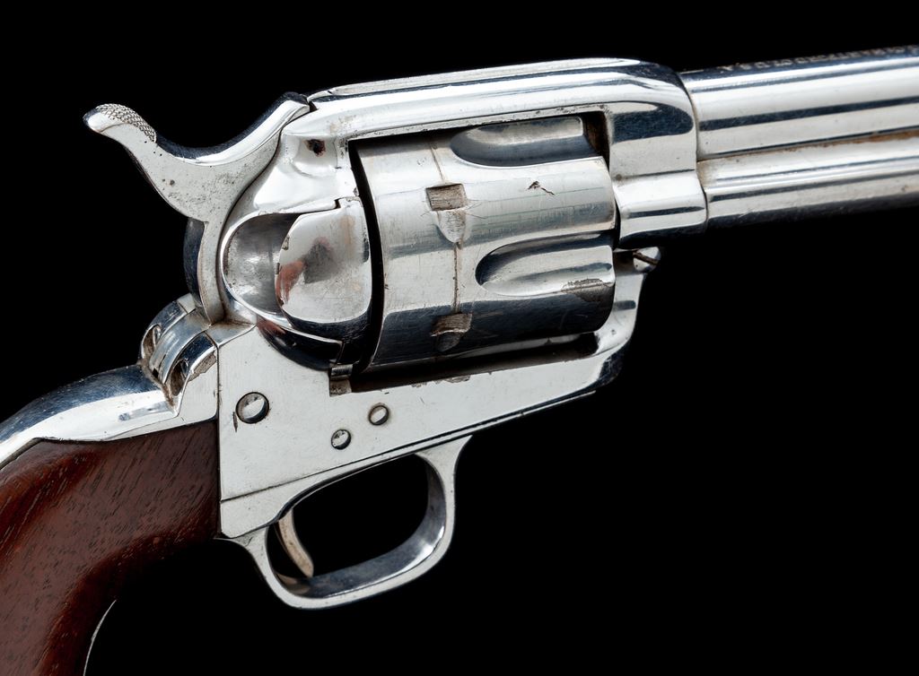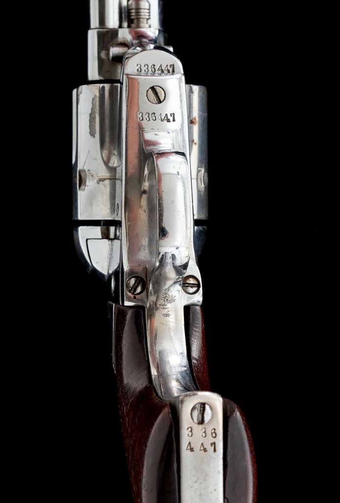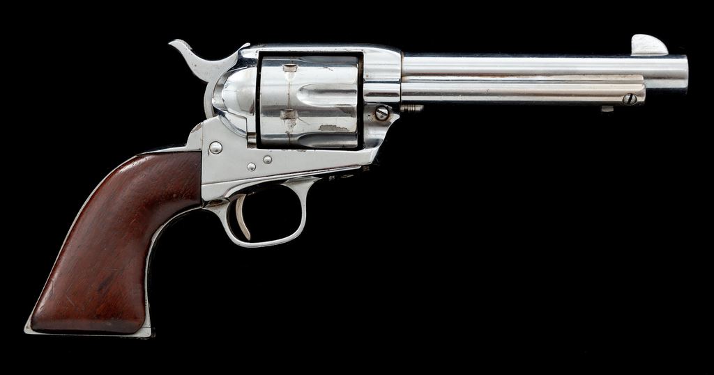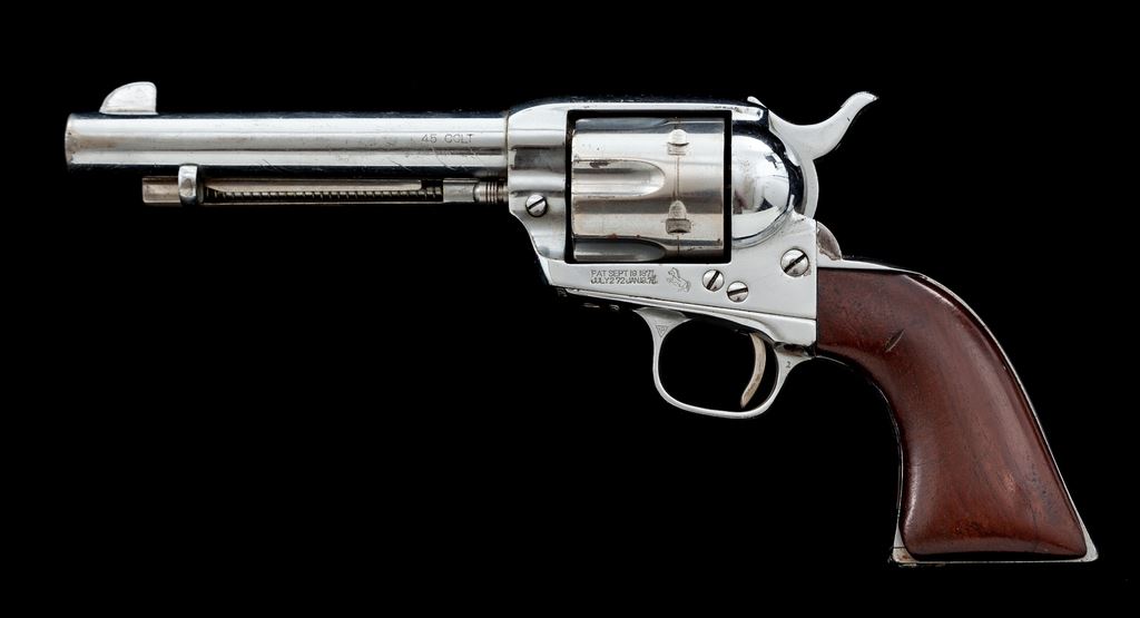 Colt Model 1873 Single Action Army Cartridge Revolver, #336447, .45 Colt CF cal., 5.5'' round barrel with one-line ''Colt's Pt. F.A. Mfg. Co. Hartford, CT. U.S.A.'' top address and ''45 Colt'' marked on left side, 6-shot fluted cylinder, left frame with two-line 1871-72-75 patent dates and ''Rampant Colt'' logo, full nickel plate finish, earlier one-piece varnished walnut grips. Mfg'd 1917. All matching visible serial numbers; loading gate correctly marked ''417''. Condition is very good with possibly refinished frame and sharp markings overall, retaining approx. 75% nickel; cylinder and ejector tube with a more aged color. Grips are very good, having been sanded and now slightly undersized with smoothed chips at both toes. Action is crisp and light, perhaps tuned; bore is clean with sharp rifling. Est.: $1,000-$1,500. (C&R/PPT)
