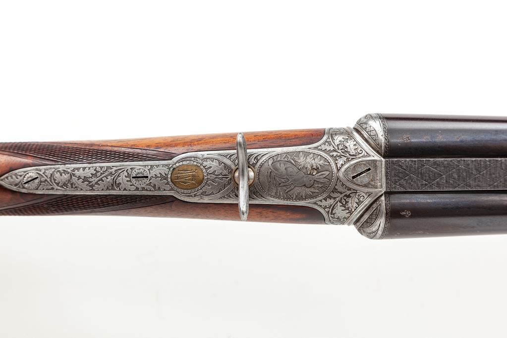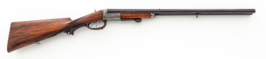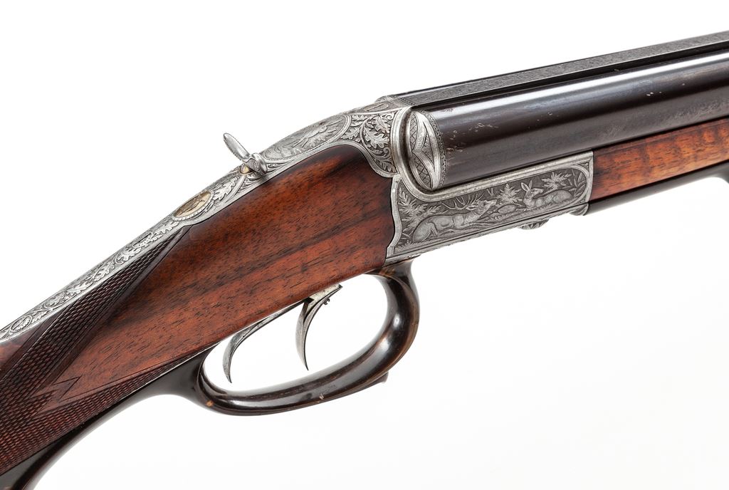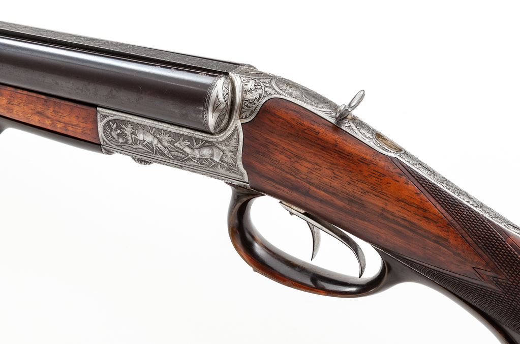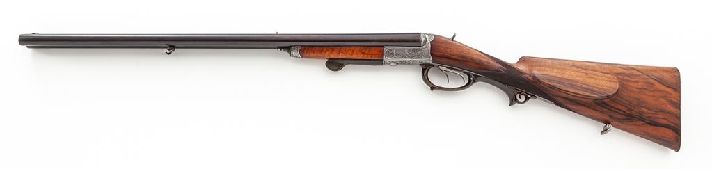 Very High Quality German Side-by-Side Double Rifle, #4935. 20 bore 24-3/4'' (63cm) barrels have 2-1/2'' (63mm) chambers, and would be used to hunt medium-sized game in European style (driven) hunting; sling swivels are present. Action uses a side-swing underlever to slide the barrels aft onto the breechface, and appears quite strong; "(crown)/V" proofmark on right-hand barrel. Rib is marked ''W. Collath in Frankfurt O. Patent'', with single Express sight present. Receiver, top tang and barrel bolsters are ornately engraved with stag scenes, rabbit, and oak leaf patterns. Opening lever and triggerguard are carved horn, buttplate is checkered pewter. Forestock and straight cheekpiece buttstock are oil-finished high grade walnut. Action has double triggers, simple extractors, and a rotary safety device on top. Condition is excellent, with no marks to wood or metal. Very tight and secure lockup. An excellent example of German craftsmanship. Est.: $1,500-$2,500. (Antique)