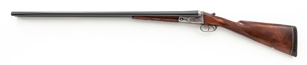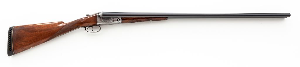 Parker VHE Grade Hammerless Side-by-Side Shotgun, #172765, 12 ga. 32'' ''Vulcan Steel'' barrels have 2-1/2'' chambers and are choked Full/Full. Boxlock action has double triggers, no safety, and auto ejectors. Typical VH Grade border engraving used on receiver, barrel bolsters, triggerguard and tangs. Splinter forend and straight English buttstock have adequate checkering, and a Pachmayr Whiteline recoil pad is fitted to butt. Mfg'd 1916. Condition is very good, with approx. 15%-20% case hardening remaining, some handling marks to wood and some action wear. However, action locks tight and bores are bright. Judging by this configuration, this would be a gun bought for trapshooting in 1916. Est.: $2,000-$3,000. (C&R)