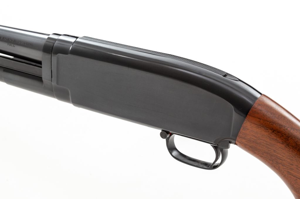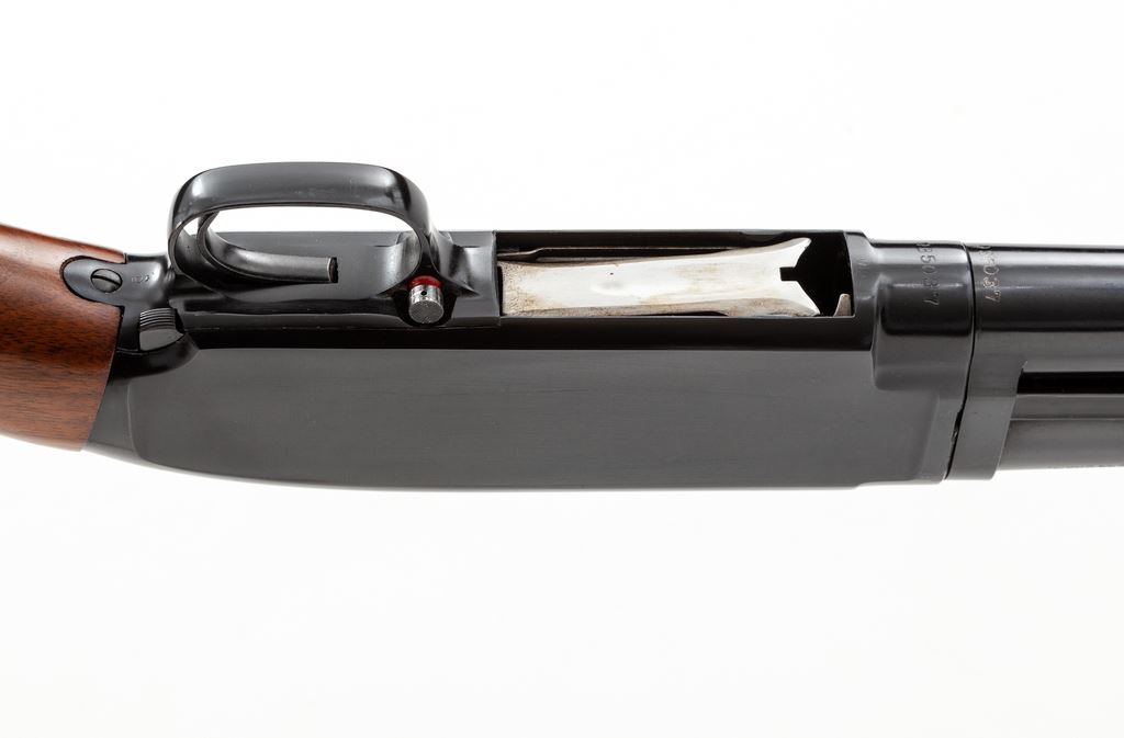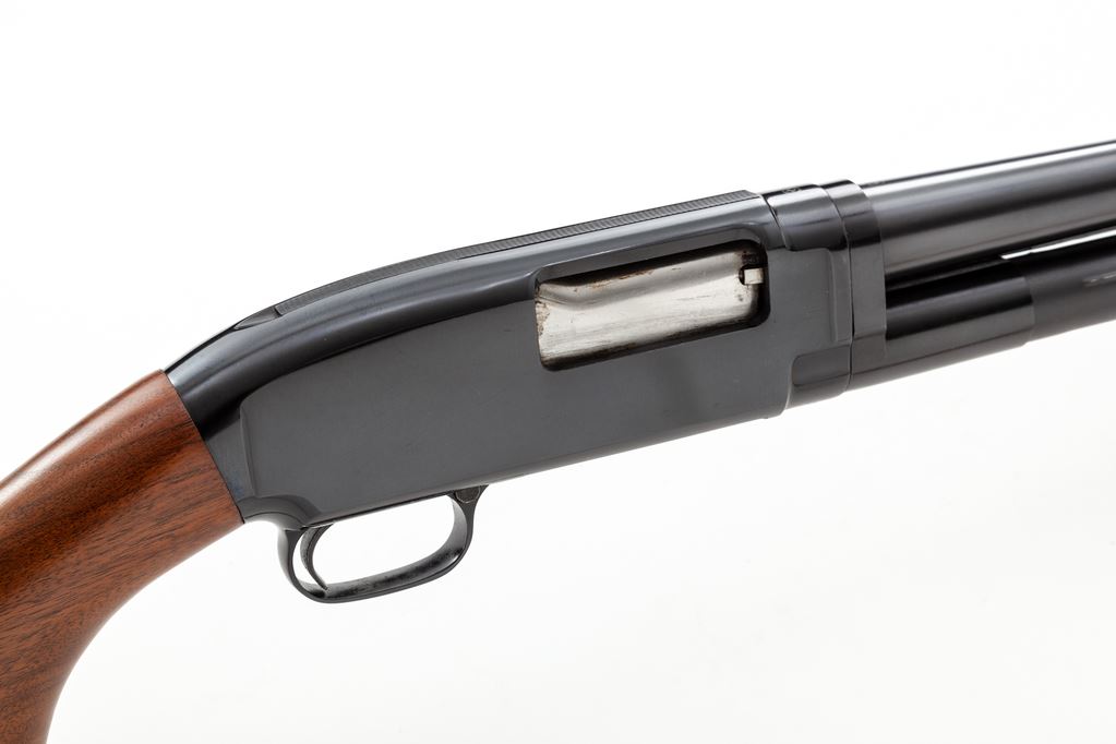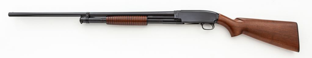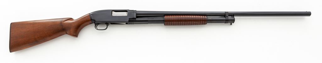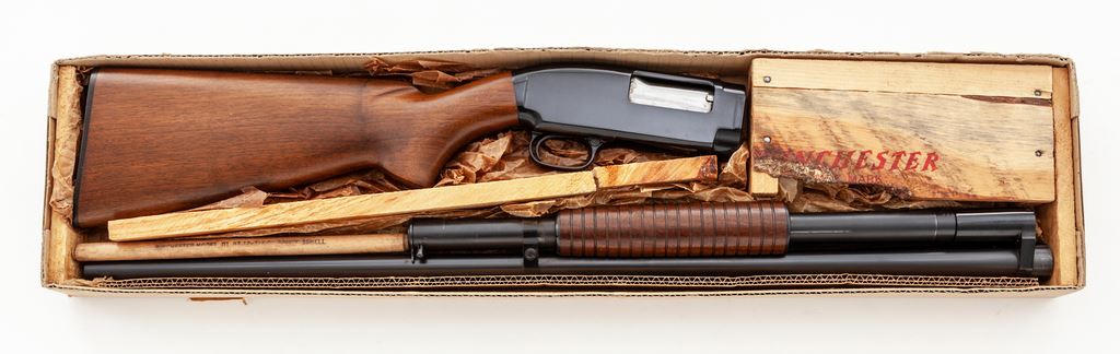 New-in-Box Winchester Model 12 Field Grade Slide-Action Shotgun, #935037, 12 ga. 30'' plain barrel has 2-3/4'' chamber and is choked Full, with 18-groove early forend. Field Grade buttstock is of pre-war configuration, without grip cap and possessing an early buttplate. Contained in original Winchester cardboard box with correct serial number, wooden dividers, original Winchester wood magazine plug, and lots of wax paper. Mfg'd 1942. Condition is as new, no marks or dings, with paperwork. May have been assembled but appears unfired. A truly original Model 12. Est.: $1,000-$1,500. (C&R)