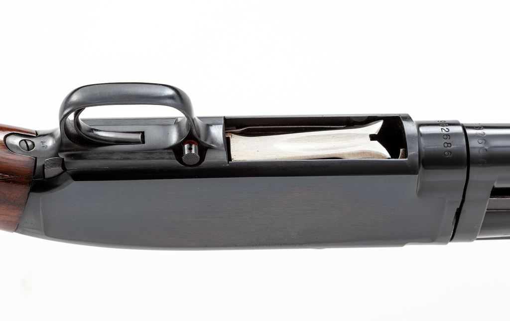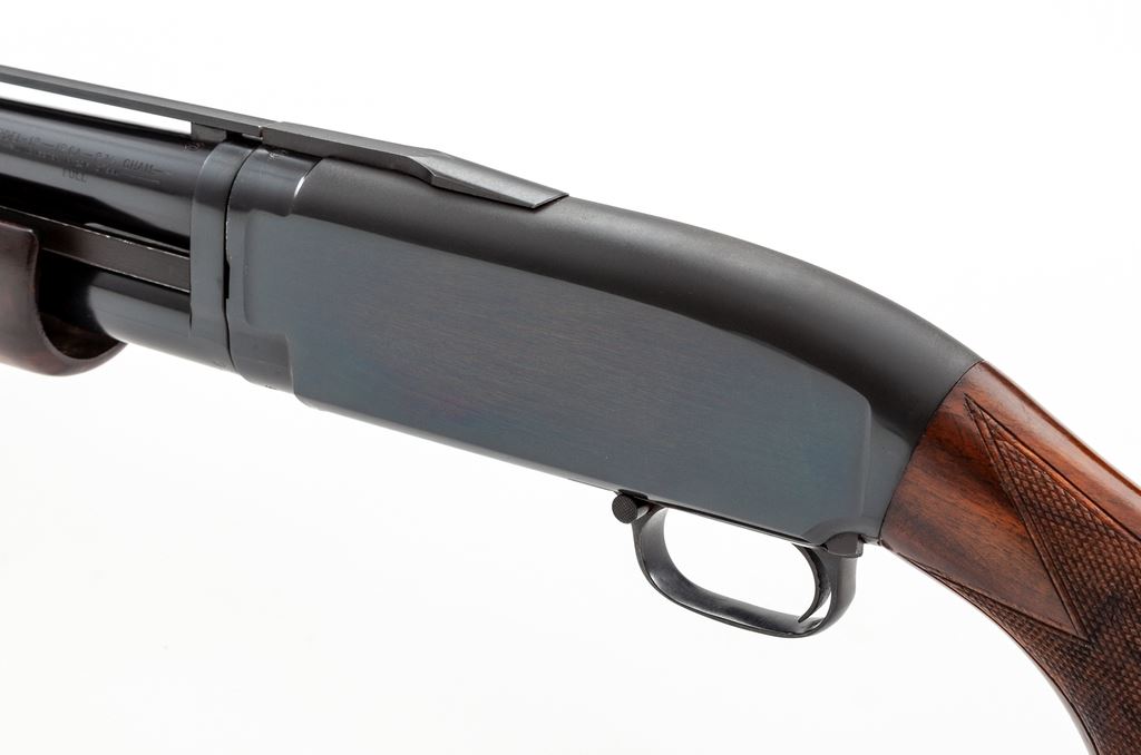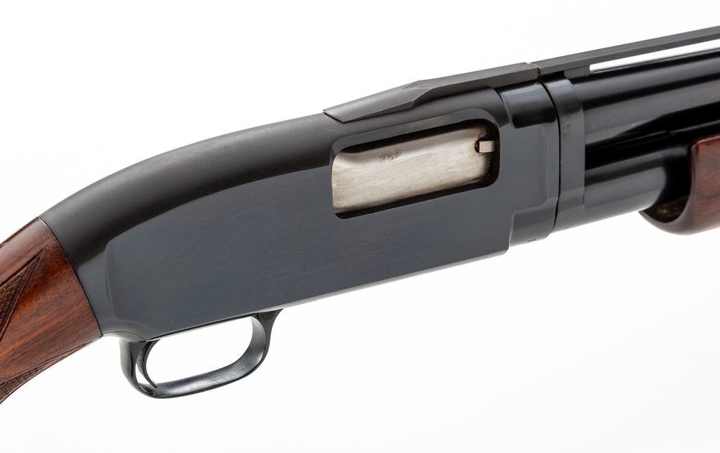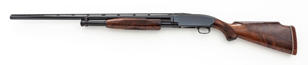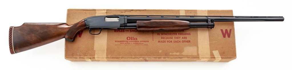 New-in-Box Winchester Standard Grade Trap Shotgun, #1962686. 12 ga. 30'' barrel has ''New Winchester Vent Rib'' with rectangular posts and duck bill that extends 3.25'' onto receiver; 2-3/4'' chamber and Full choke. Wood is above average walnut, with beavertail forend, pistol grip, Monte Carlo comb, all correctly checkered, and original red Winchester recoil pad. Receiver is standard blue with dull blue on top surface. Contained in an original Winchester box, without serial number, but with correct description; original paperwork included. Mfg'd 1964. Condition is as new and appearing unfired. No mars to wood or metal. Est.: $1,500-$2,500. (C&R)