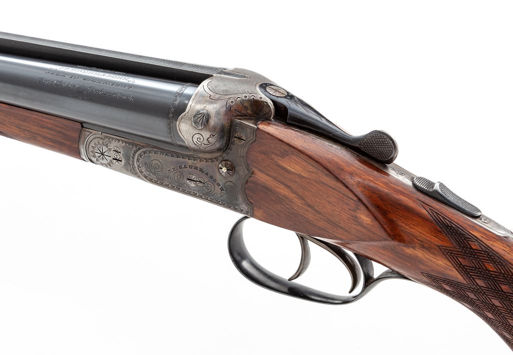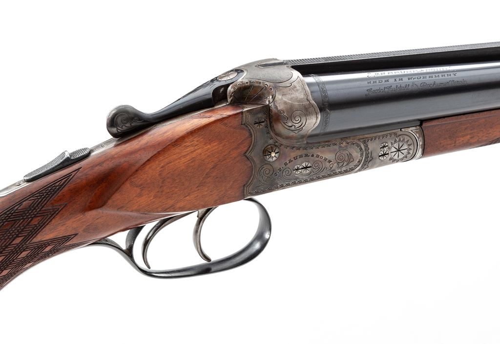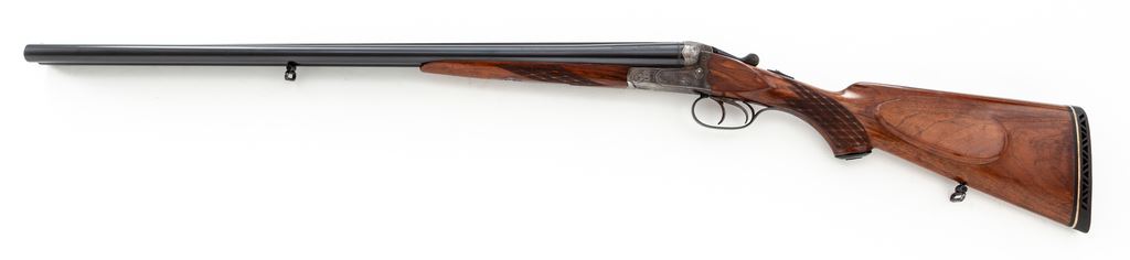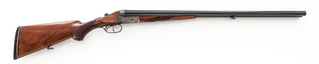 J.P. Sauer & Sohn Royal Grade Side-by-Side Shotgun, #245158, 12 ga. 28-3/8'' (70cm) ''Laufstahl'' barrels have 2-3/4'' chambers, solid rib, and are choked F/F. Scalloped boxlock action features double underlugs with a Greener crossbolt, double triggers, auto ejectors, cocking indicators and auto safety. Receiver is lightly engraved with Sauer logos and Arabesque scrolls. Splinter forend and pistol-grip buttstock with cheekpiece feature skipline checkering, black plastic grip cap, sling swivels and Whiteline recoil pad. Mfg'd approx. 1960s. Condition is very good to fine, with handling marks to wood, some loss of case color, and some wood compression at mating to scallops. Action functions perfectly, locks very tight, and bores are bright. Est.: $750-$1,000. (Modern)