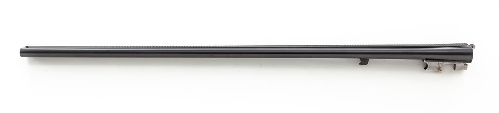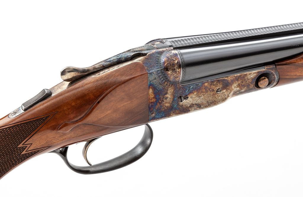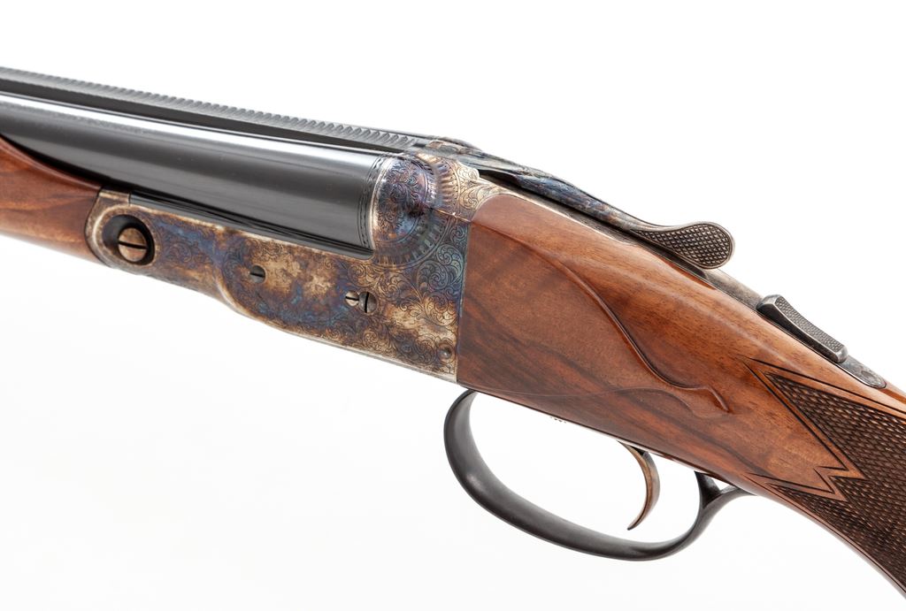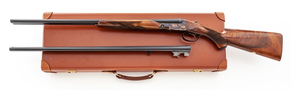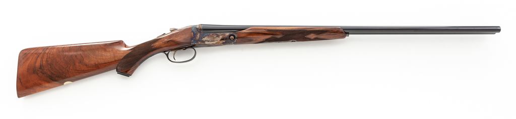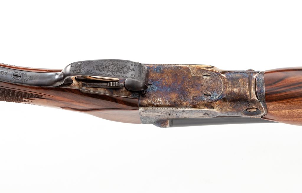 Parker Reproduction by Winchester DHE Grade Side-by-Side Two-Barrel Shotgun Set, #28-02288, 28 ga. 26'' barrels have 2-3/4'' chambers, concave rib, and are choked Quail1/Quail2 (IC/Mod.); 28'' barrels are the same but choked Mod./Full. The 00 frame size hammerless action is profusely engraved with hunting dogs on both sides, pheasant on the bottom, and rose and scroll on the balance. The rare beavertail forend and pistol-grip buttstock are of Presentation Grade walnut and feature 22 LPI checkering, black Parker grip cap, blank medallion inlay and skeleton buttplate. Boxlock action has a single selective trigger, auto ejectors and auto safety. Housed in original Parker reproduction hard case. The fitted leather case is specially made for the two-barrel set, and includes snap caps and an outer canvas cover to protect the leather. Mfg'd approx. 1985. Condition is as new and possibly unfired, with approx. 99% case coloring to receiver, which is slightly toned, few handling marks to wood, but almost no wear to action. A beautiful little Parker reproduction. Est.: $3,500-$5,000. (Modern)