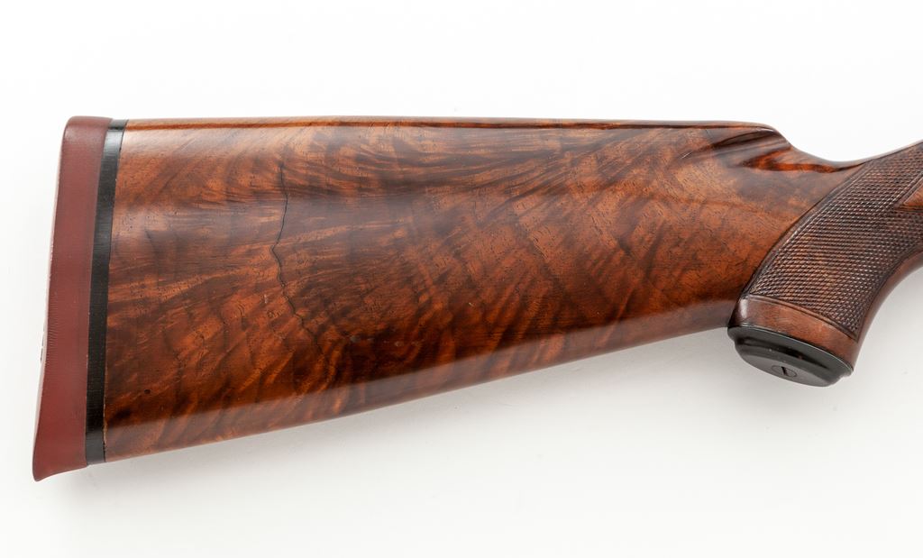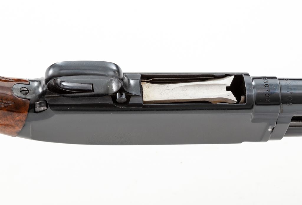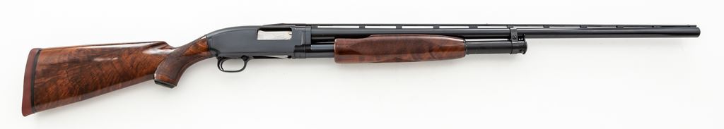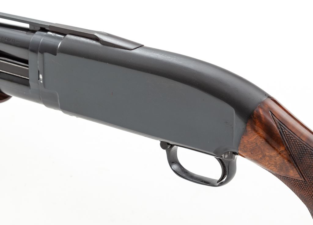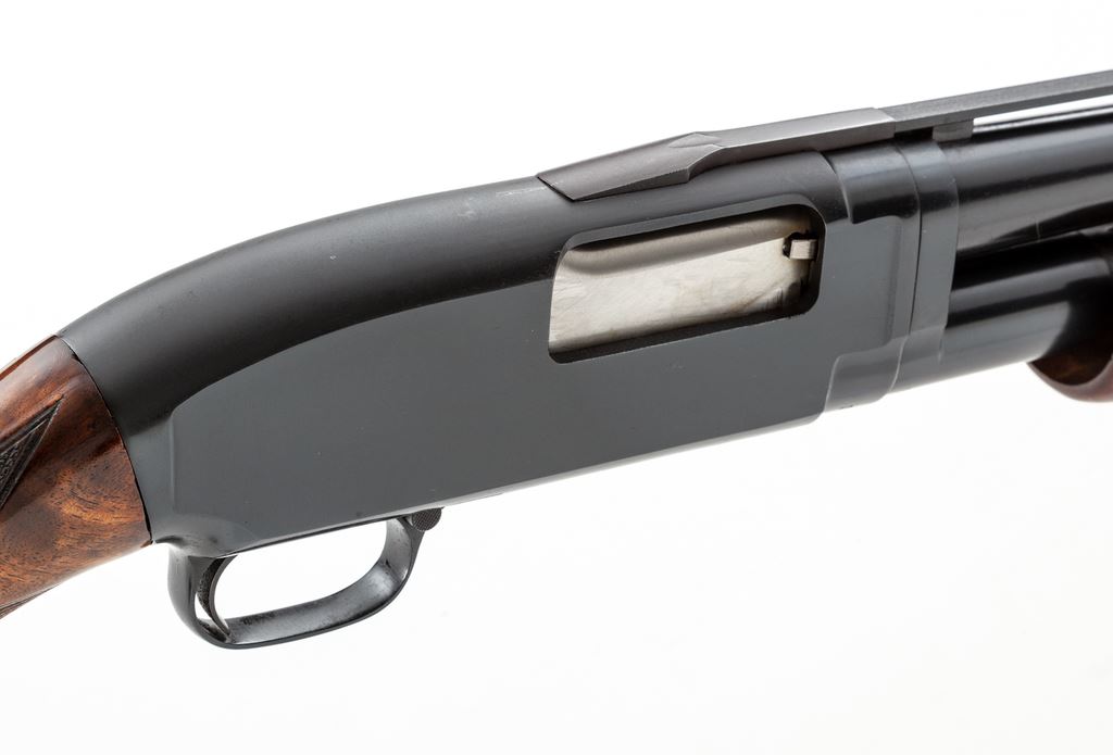 Winchester Model 12 Standard Grade Trap Slide-Action Shotgun, #1930705. 12 ga. 30'' barrel has 2-3/4'' chamber, is choked Full, and has a late (rectangular post) duck-bill vent rib that extends 3-1/4'' onto the receiver. The full forend and pistol-grip buttstock are of nicely figured walnut, high-gloss finished, with correct Winchester checkering, unmarked metal grip cap, and original solid red Winchester recoil pad. Mfg'd 1961. Condition is excellent, with few small handling marks to wood but very little wear to action, which does not appear reblued; bore is bright. A nice, original Model 12 Trap gun. Est.: $700-$950. (C&R)