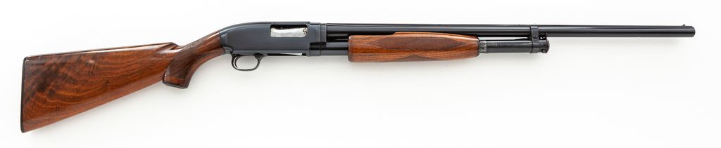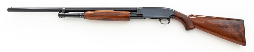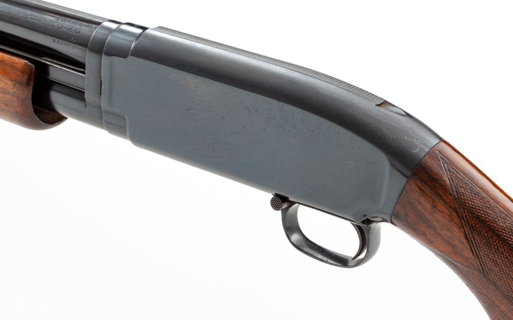 Winchester Model 12 Skeet Grade Slide-Action Shotgun, #818177. 16 ga. 26'' solid rib barrel has a 2-3/4'' chamber, target beads, and is choked ''WS-1'', with patent identification. Receiver has engine-turned bolt and shell lifter, and marked ''Skeet'' below the serial number. Full forend and pistol-grip buttstock are fancy walnut, with Winchester-marked grip cap and early Winchester butt pad. Mfg'd 1940. Condition is very good, as a coat of varnish has filled in checkering, with few small handling marks. Action is a little stiff and needs a cleaning, but functions correctly; bore is bright. A very nice 16 ga. Model 12 Skeet gun. Est.: $1,500-$2,500. (C&R)