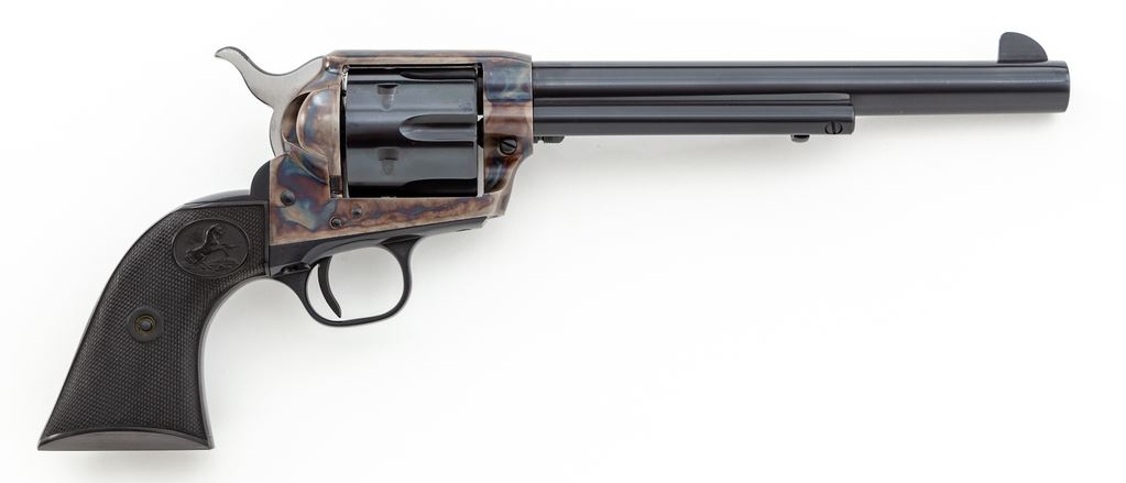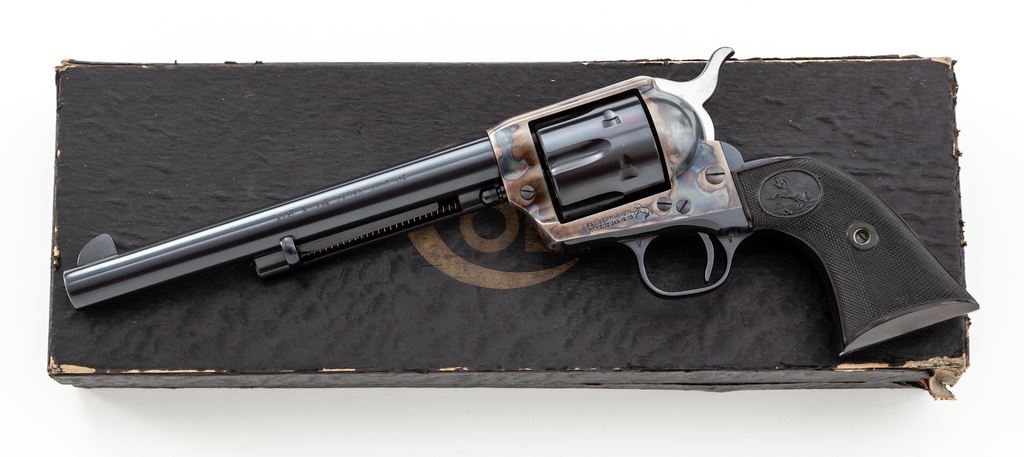 Colt 2nd Generation Single Action Army Revolver, #37545SA, .45 Colt cal., 7.5'' barrel, blue and case hardened finish, factory checkered black plastic grips. In correct black two-piece unnumbered box with instructions and warranty card. Mfg'd 1963. Condition is excellent retaining approx. 98%+ original finish. Grips and action are crisp, bore is mirror bright. Box is very good; top edges of lid a little tattered in one corner. Est.: $2,000-$3,000. (C&R/PPT)