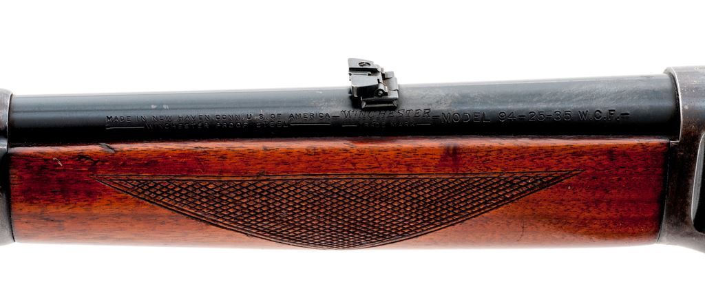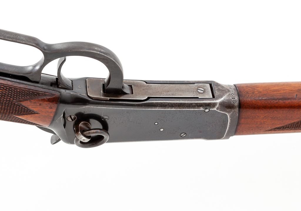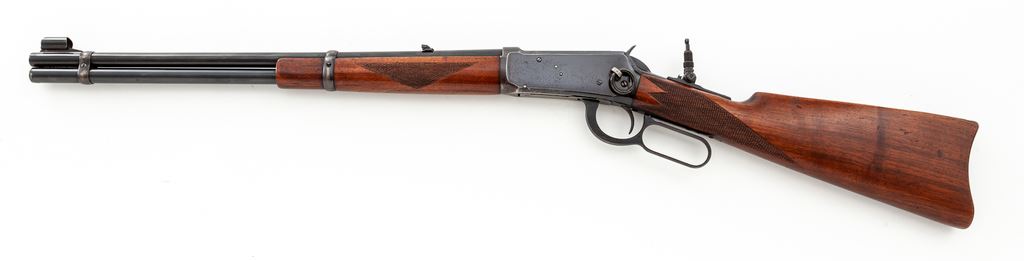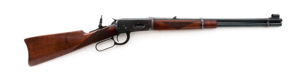 Pre-War Deluxe Winchester Model 1894 Saddle Ring Carbine, #1128512, .25-35 cal., 20'' barrel, blue finish, checkered straight walnut stock and forend, steel carbine buttplate, with standard front and rear sights, as well as Marbles tang sight. Mfg'd 1937. Condition is excellent retaining approx. 92%-94% original blue, with thinning at balance areas and to highpoints of barrel bands. Stock with minor marks from handling. Good action, bright bore. Est.: $3,500-$5,000. (C&R)