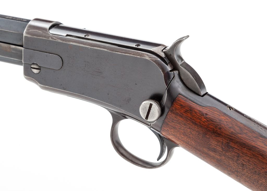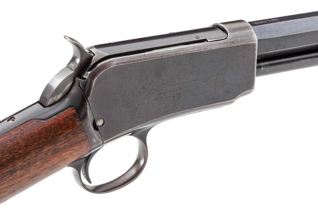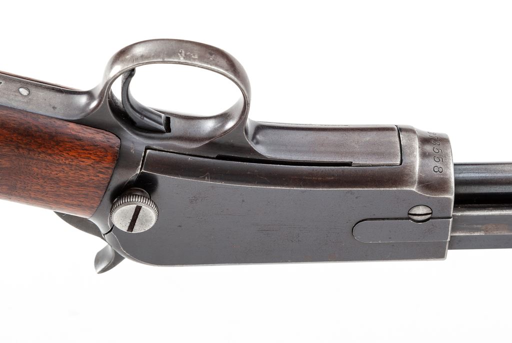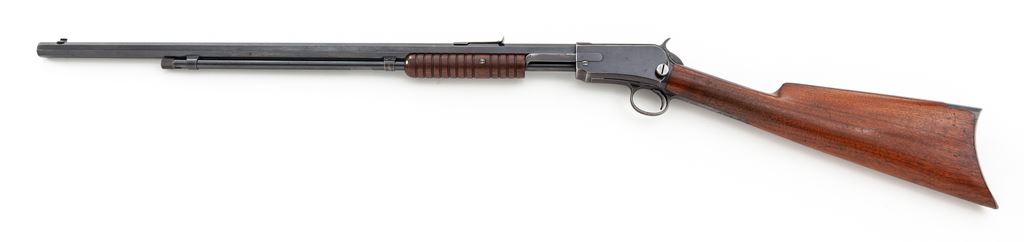Second Model Winchester 1890 Pump Action Rifle, #273558, .22 Long cal., 24'' octagon barrel, blue finish, straight grip walnut stock, 12-groove forend, crescent steel buttplate, dovetailed silver bead front sight, ''V''-notched ''1901'' patent date rear sight with adjustment screw. Mfg'd 1906. Condition is fine with approx. 80% original blue with the majority of the finish loss occurring on the highpoints, balance point, upper and lower tang; some of the areas of thinned finish have toned brown. Factory lettering is well defined. Wood shows normal scattered moderate handling marks with light thinning to the finish at the wrist. Stock fits tight at the surrounding metal surfaces. Action is crisp with a smooth hammer and trigger; bore is very good. Overall a nice solid rifle. Est.: $1,000-$1,500. (C&R)