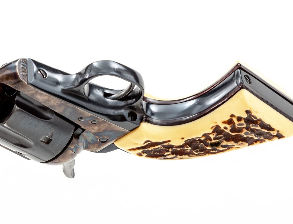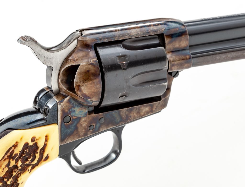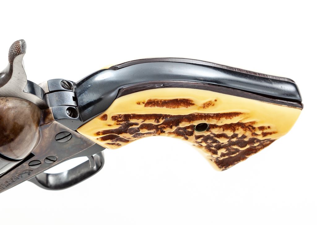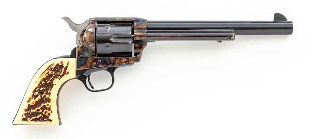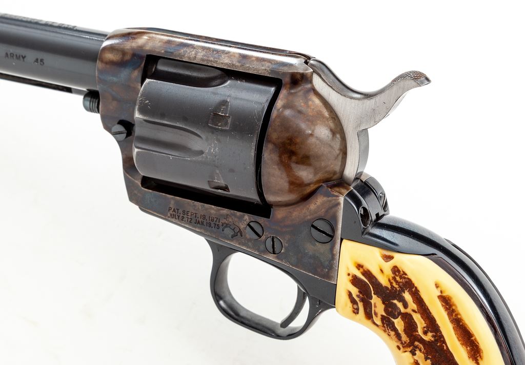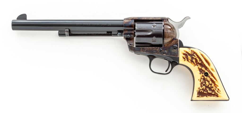 Early Colt 2nd Generation Single Action Army Revolver, #25024SA, .45 Colt cal., 7.5'' barrel, blue and case hardened finish, with faux stag grips. Mfg'd 1959. Condition is fine retaining approx. 94% blue with most of the losses to the ejector rod housing. Cylinder has been refinished; barrel, although factory, appears to be from a later revolver. Action is crisp, bore is fine. Est.: $750-$1,000. (C&R/PPT)
