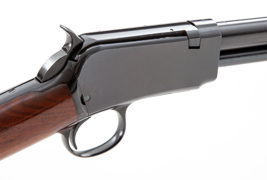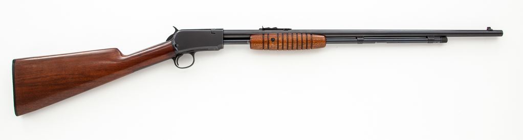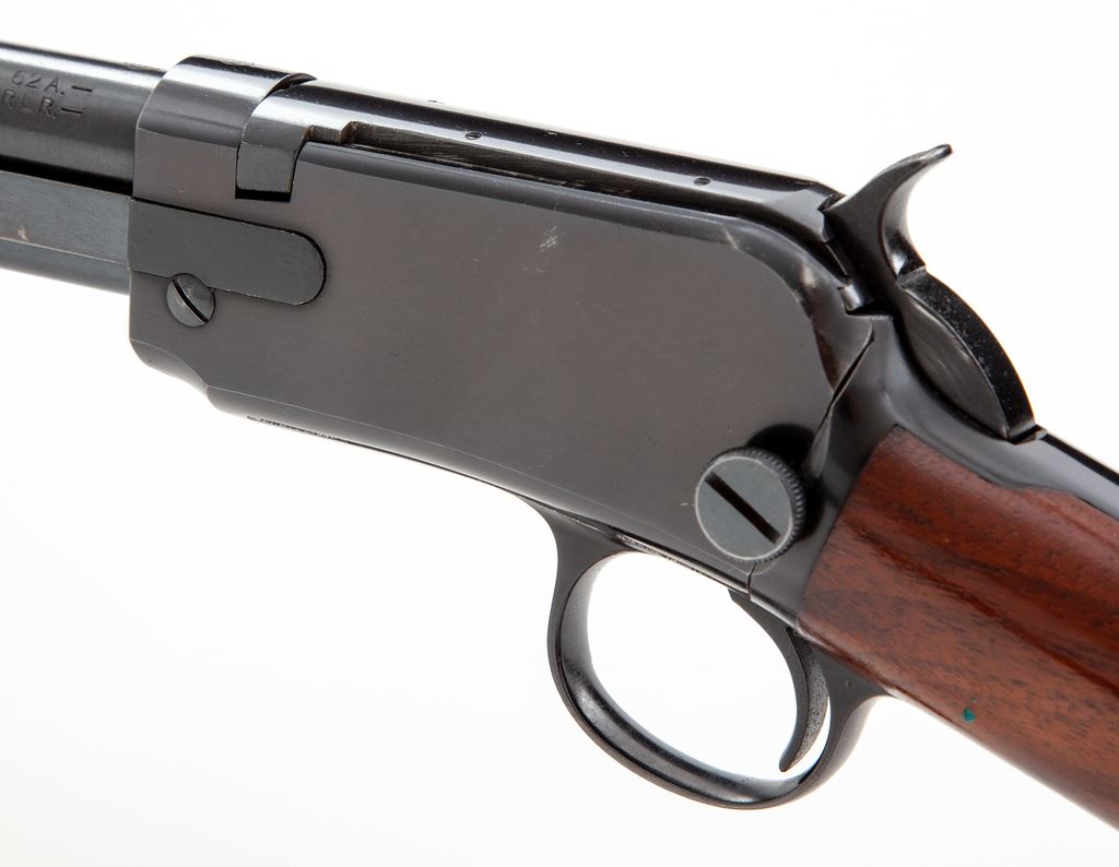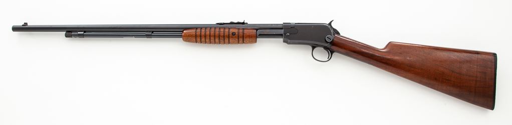 Pre-War Winchester Model 62A Pump Action Rifle, #101572, .22 S-L-LR cal., 23'' barrel, blue finish, smooth walnut stock, 10-groove small forend, factory checkered hard rubber buttplate, with standard sights. Mfg'd 1940. Condition is fine to near excellent, with only minor thinning to finish in actioning area at top of frame and some very small scratches to left side of frame. Straight grain stock shows only minor impressions and has clearly never been removed from the frame. Good action, bright bore. Est.: $600-$800. (C&R)