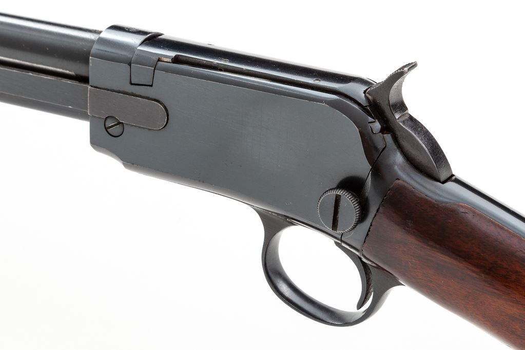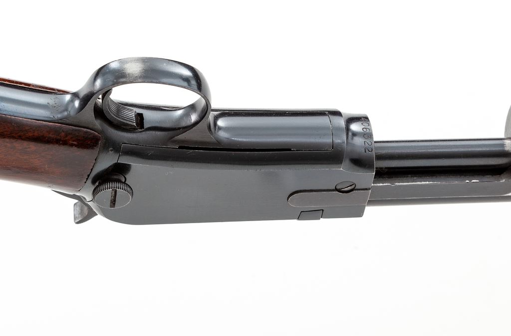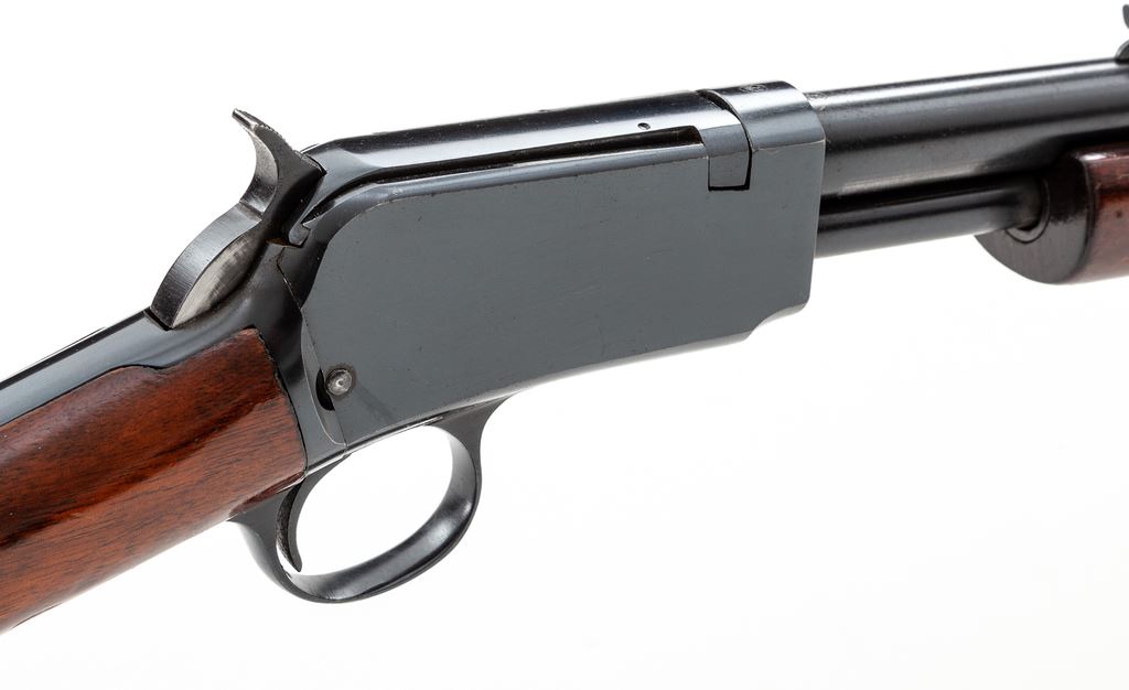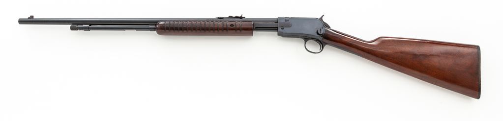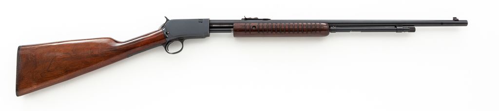 Winchester Model 62A Pump Action Rifle, #406322, .22 S-L-LR cal., 23'' barrel, blue finish, smooth walnut stock, 17-groove forend, factory checkered hard rubber buttplate, with standard sights. Mfg'd 1958. Condition is near excellent with only minor thinning to finish in actioning area at top of frame and beneath slide bar. Straight grain stock with some pressure dings and scuffs, mostly to varnish, with oil darkening near metal surfaces and additional finish added to stock. Good action, bright bore. Est.: $500-$750. (C&R)
