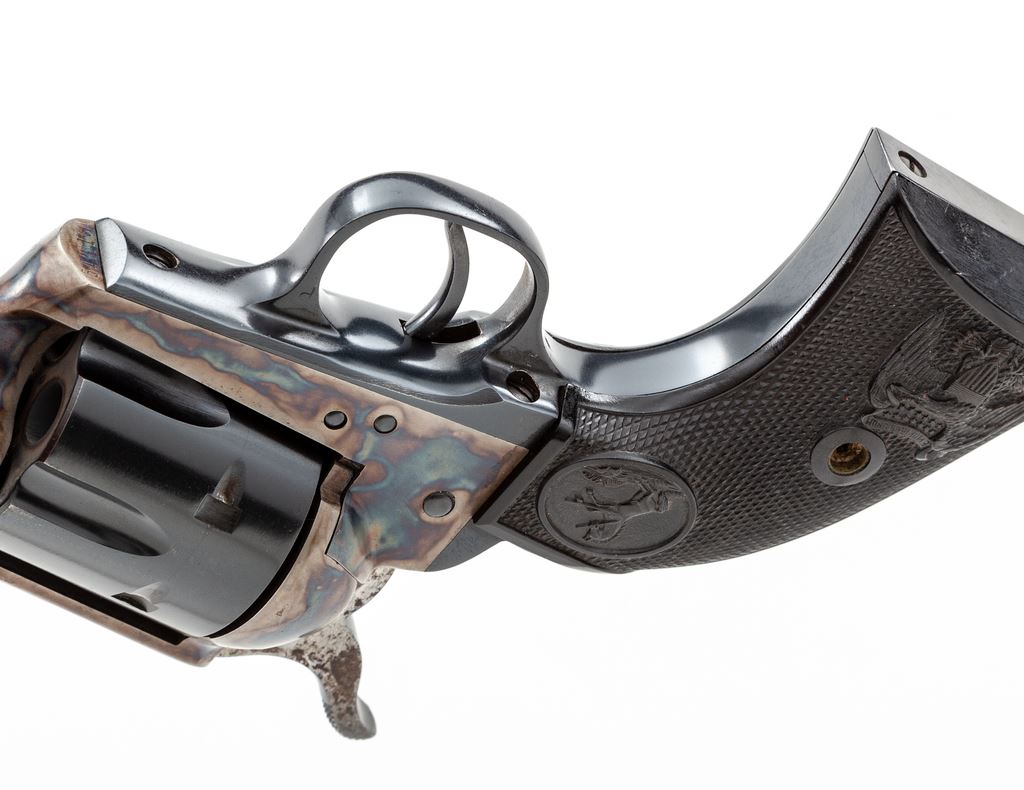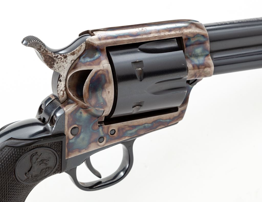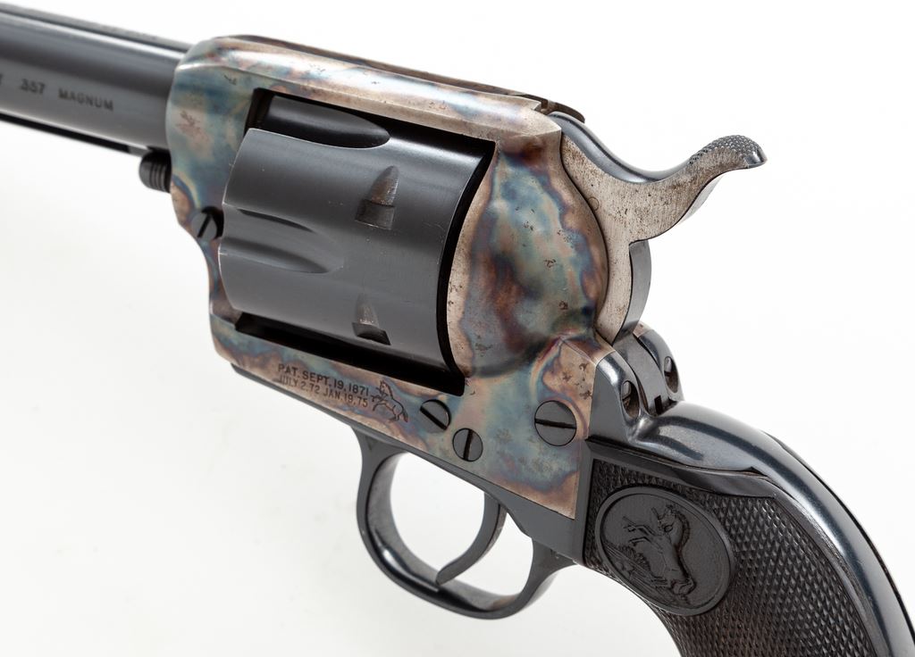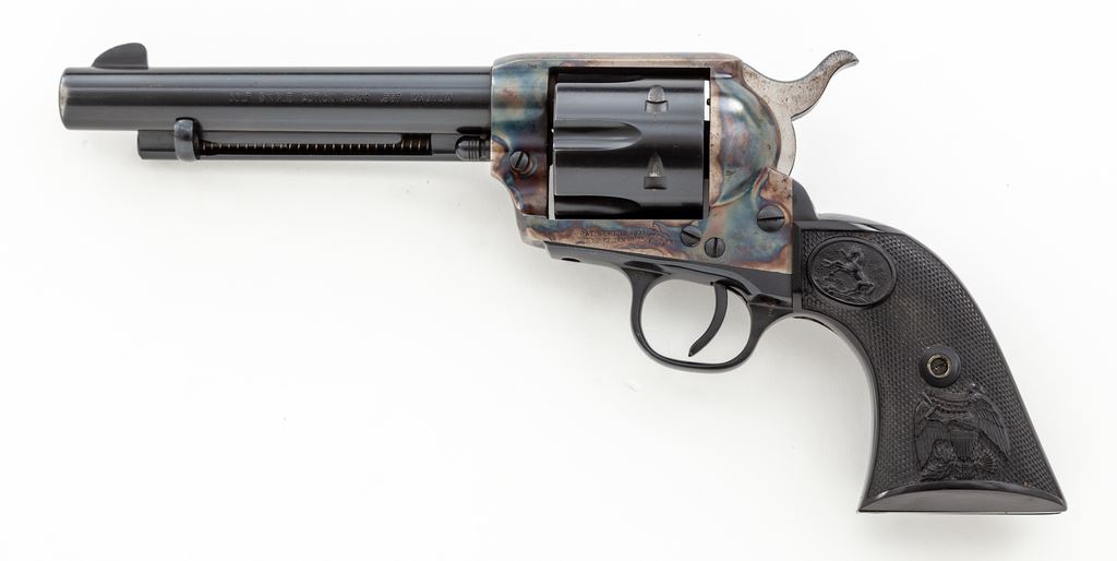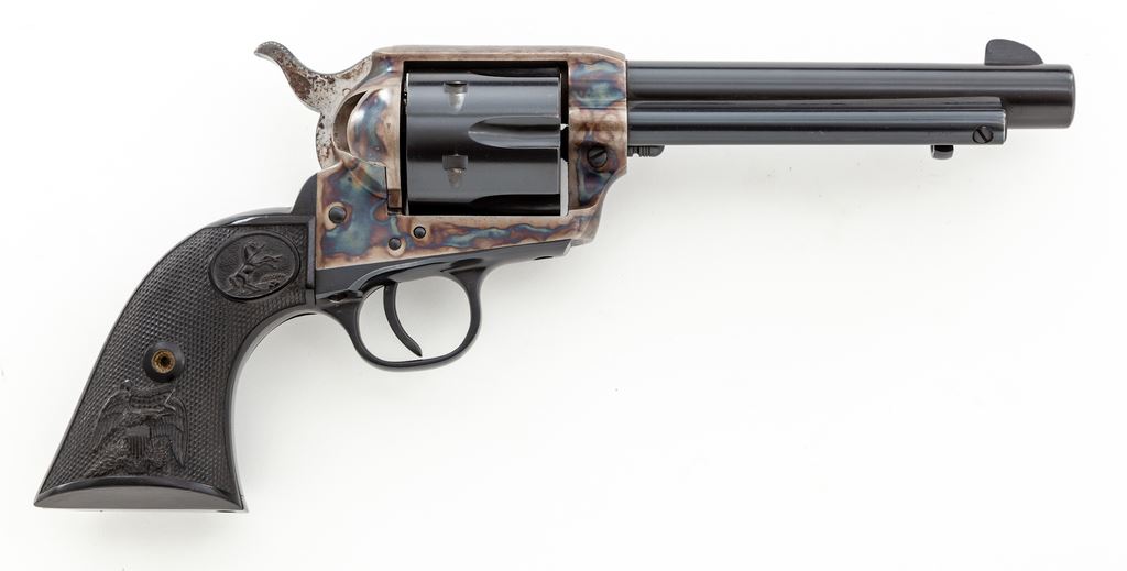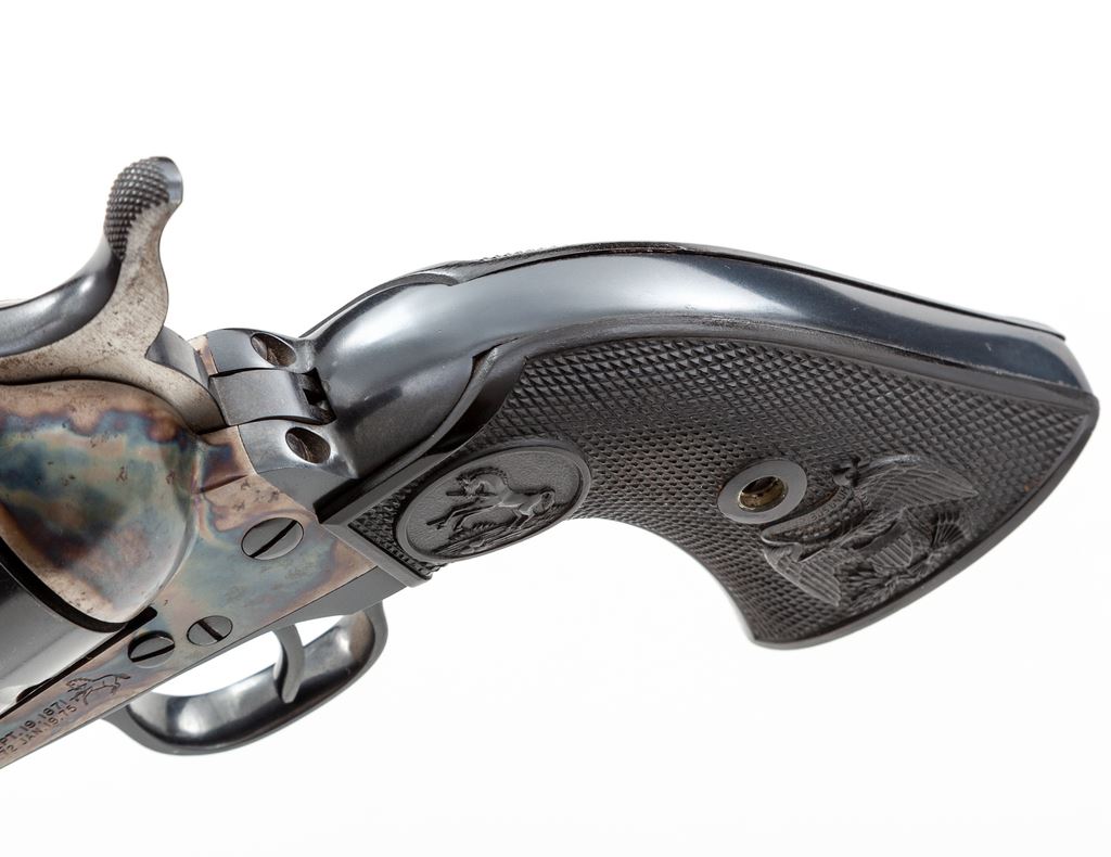 Colt 2nd Generation Single Action Army Revolver, #54081SA, .357 mag. cal., 5.5'' barrel, blue finish, case hardened frame, factory black plastic eagle and Rampant Colt grips, with standard fixed sights. Mfg'd 1970. Overall condition is fine+ with approx. 96%-97% factory blue and case colored finish; muzzle shows light wear and cylinder with a minor index line. Hammer with dark spotting, predominantly on the right side. Parts of the frame and barrel with some tiny specks of oxidation. Grips with a few slight scratches and small handling marks to the bottom edges, otherwise both are excellent. Action is smooth and crisp with an excellent bore. This revolver appears to have sat for a while and a thorough cleaning would probably raise the overall condition to near excellent. Est.: $1,200-$1,800. (C&R/PPT)