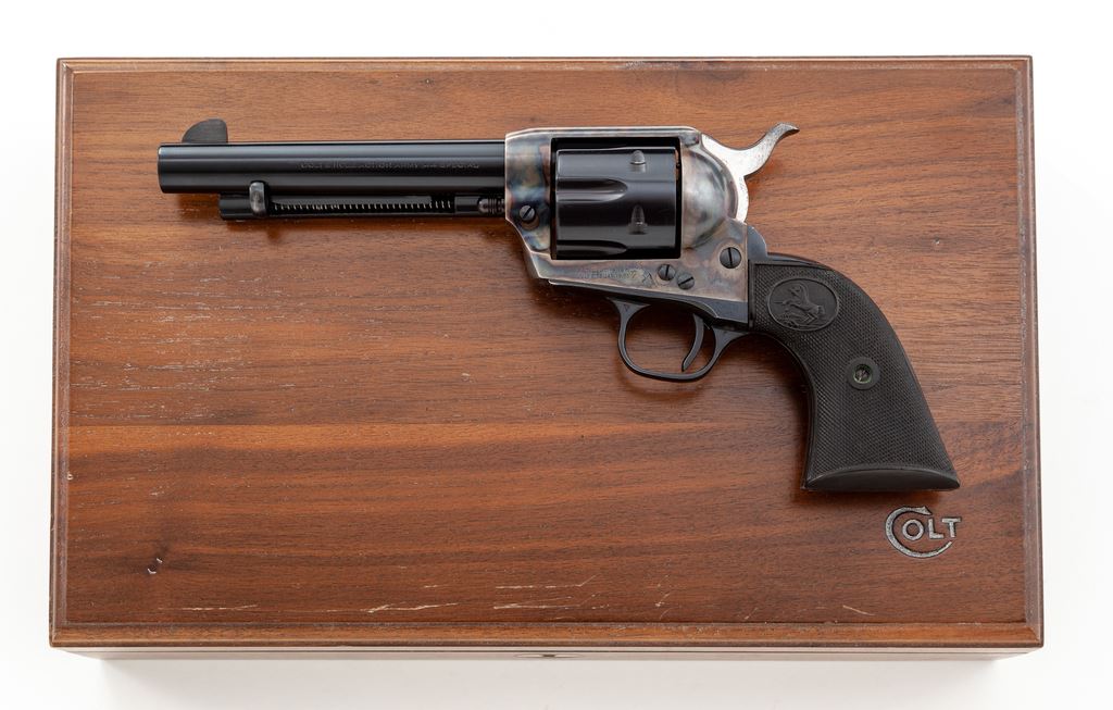 Colt 2nd Generation Single Action Army Revolver, #36131SA, .44 Spec. cal., 5.5'' barrel, blue and case hardened finish, factory checkered black plastic grips. In its original Colt stagecoach box, with Colt factory maroon-lined mahogany display case with key. Mfg'd 1962. Condition is excellent retaining approx. 98%+ original finish. No visible dragline to cylinder. Grips and action are crisp, bore is mirror bright. Stagecoach box is unnumbered and marked both ''5-1/2'' and ''.44'', remaining in excellent condition, with minor tattering to one of the lid edges. Est.: $1,800-$2,400. (C&R/PPT)