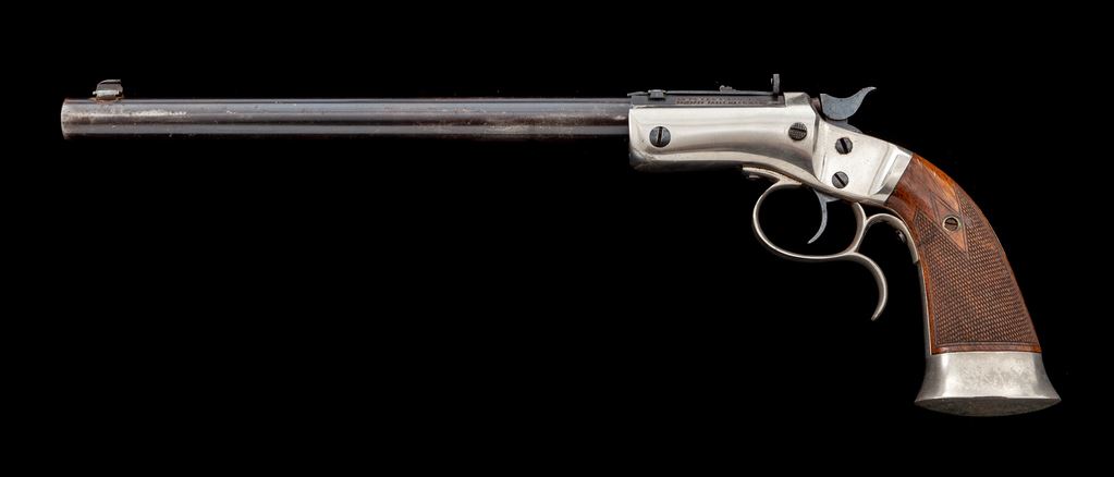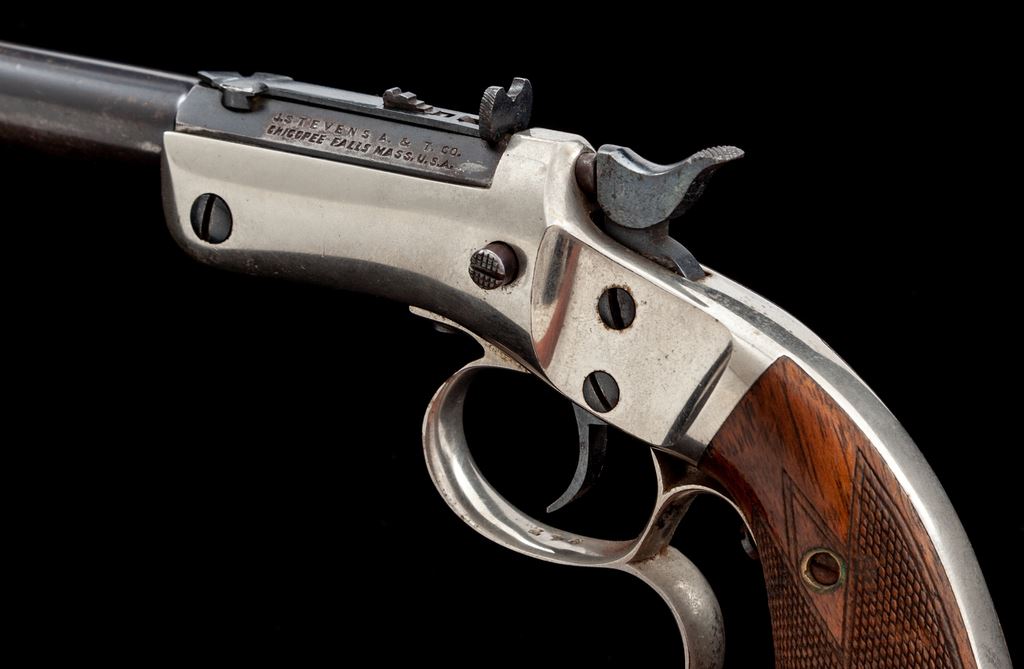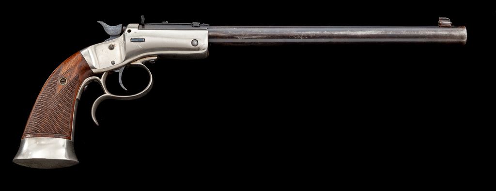 Stevens Conlin No. 38 2nd Issue Single Shot Cartridge Pistol, #21247, .22 RF cal., 10'' round-to-octagon tip-up barrel marked ''J. Stevens A. & T. Co. / Chicopee Falls, Mass. U.S.A.'' on left flat (approx. 6,000 mfg'd 1884-1903); dovetailed blade front sight and adjustable leaf rear sight. Originally blued barrel, hammer and trigger; nickel-plated steel frame and integral grip straps, triggerguard with finger spur, weighted buttcap, and finely checkered walnut two-piece grips. Condition is very good to fine retaining nearly all of the bright factory nickel plating (thinning a bit at buttcap) and 50% toning barrel blue. Serial numbers match; grip checkering is sharp. Action is crisp; bore with visible rifling should clean. Est.: $550-$950. (C&R/PPT)