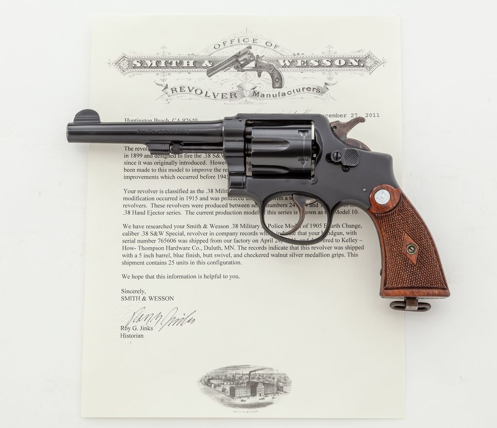 Pre-War Smith & Wesson Model 1905 (4th Change) Double Action Revolver, #765606, .38 Spec. cal., 5'' barrel, blue finish, factory checkered large diamond walnut matching numbered grips with S&W medallions, case hardened checkered hammer and serrated trigger, with lanyard loop in butt. Shipped from the factory on April 24, 1941, to Kelley-How-Thompson Hardware Co., Duluth, MN, with factory letter signed by S&W Historian Roy G Jinks. Condition is excellent with only the slightest loss to finish to forward portion of frame lug just in front of triggerguard. Very thin index mark to cylinder, light thinning to muzzle and high edges of cylinder latch. Grip with light wear, more pronounced to right panel. Crisp action, mirror bright bore. Est.: $750-$1,000. (C&R/PPT)