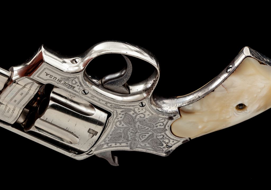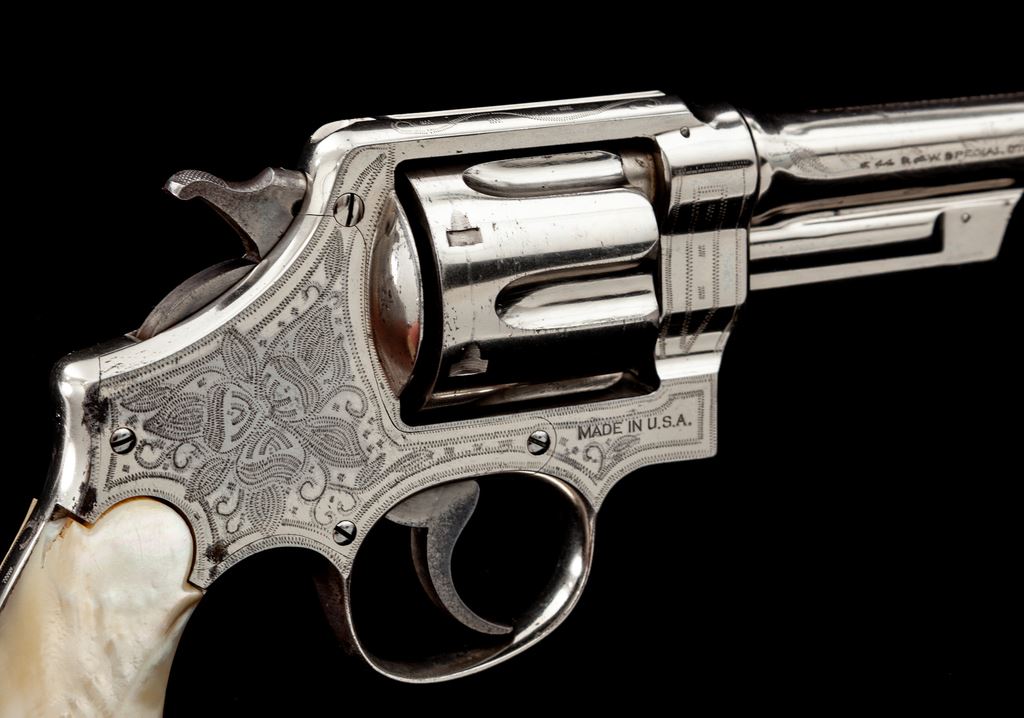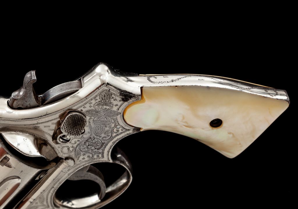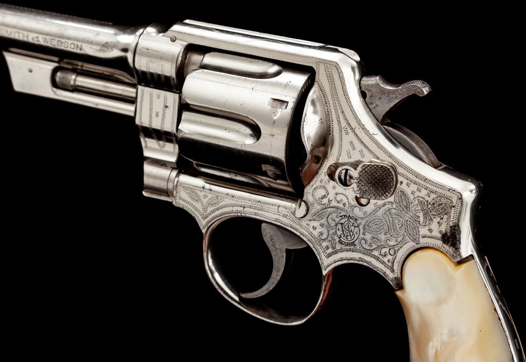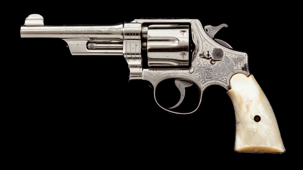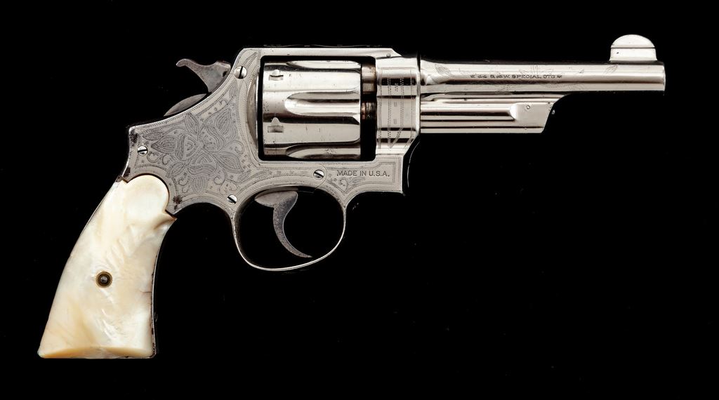 Smith & Wesson 3rd Model Hand Ejector Double Action Revolver, #28443, .44 Spec. cal., 5'' barrel, cactus motif border engraved, nickel finish, slab pearl grips. Mfg'd between 1926-1941. Sometimes known as the ''Model of 1926'' or ''Wolf & Klar'' model, which would explain this Tex/Mex style border engraving that Wolf & Klar were known for. Condition is near excellent, with some small losses to nickel finish near top of front and back strap. Minor scuffs and scratches overall. Right grip panel with small loss at top of backstrap. Good action, fine bore. Est.: $1,800-$2,400. (C&R/PPT)