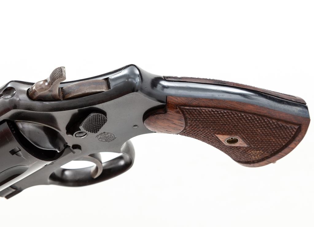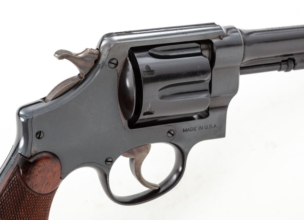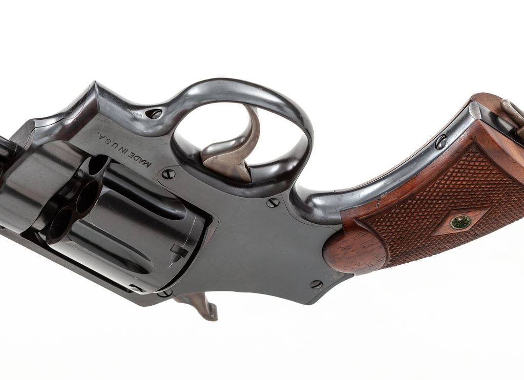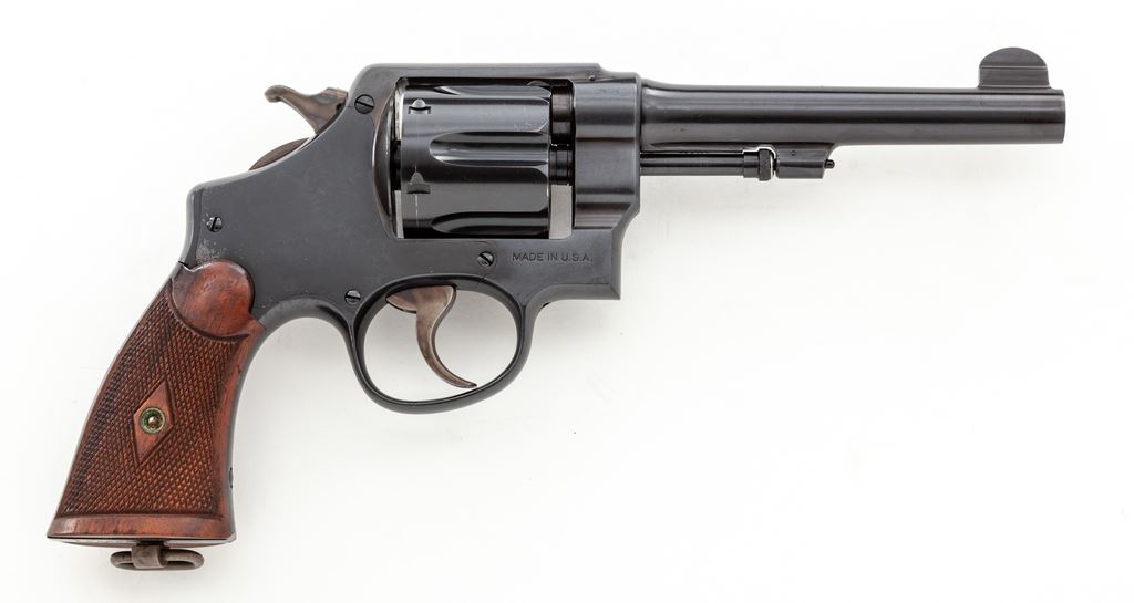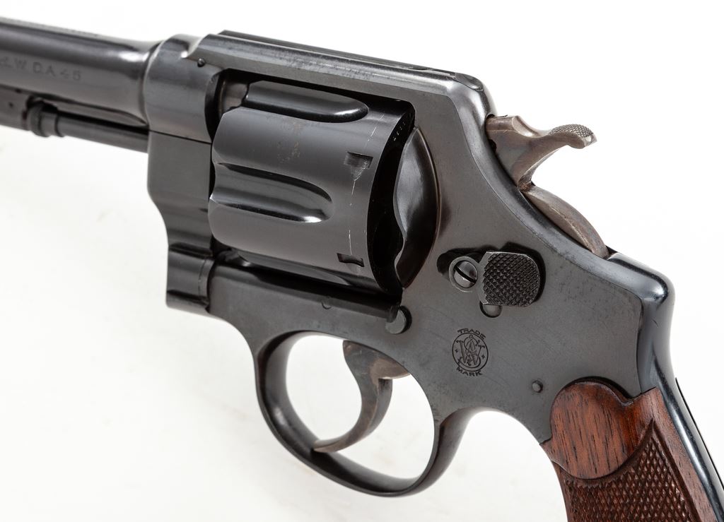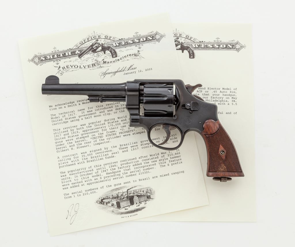 Smith & Wesson Commercial Model 1917 Double Action Revolver, #180006, .45 ACP & .45 Auto rim cal., 5.5'' barrel, blue finish, factory checkered walnut pencil-numbered grips, with lanyard loop in butt. Shipped from the factory on May 28, 1926, to E.K. Tryon Co., Phila., PA, with factory letter signed by S&W Historian Roy G. Jinks. Condition is excellent retaining approx.. 98%+ original blue finish, with only the lightest wear in actioning areas. Grips and action are crisp, bore is bright. Est.: $1,800-$2,400. (C&R/PPT)