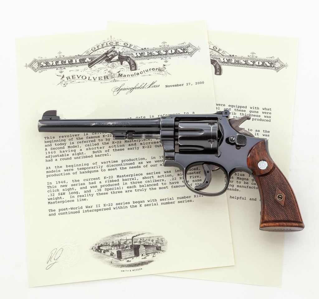 Pre-War Smith & Wesson K-22 Masterpiece Double Action Revolver, #684440, .22 LR cal., 6'' barrel, blue finish, factory checkered walnut magna unnumbered grips with S&W medallions, factory bright bead Patridge front sight, with large elevation screw-adjustable target rear sight. Shipped from the factory on April 9, 1940, to Marshall Wells Co., Spokane, WA, with factory letter signed by S&W Historian Roy G. Jinks. Considered rare with only 1067 mfg'd prior to WWII. Condition is fine retaining approx. 90%-92% blue. Losses to left side of barrel and muzzle, forward portion of cylinder, and thinning to grooved front and back strap. A period trigger shoe has been added. Grips show mild flattening. Crisp smooth action, excellent bore. Est.: $2,500-$3,500. (C&R/PPT)