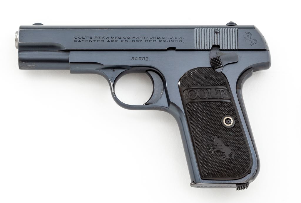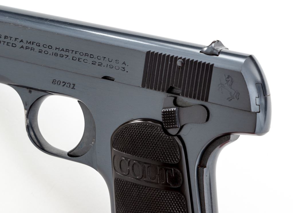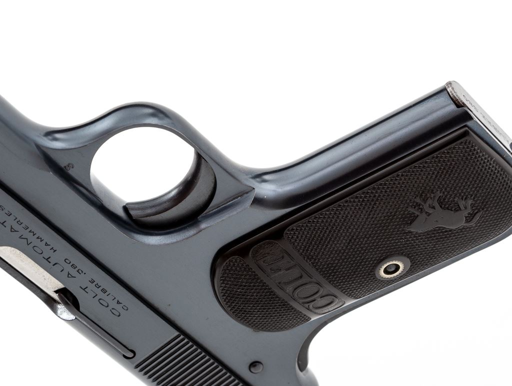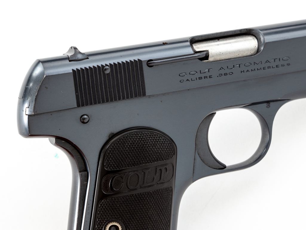 Colt Model 1908 Pocket Hammerless Semi-Automatic Pistol, #80731, .380 cal., 4'' barrel, blue finish, factory checkered hard rubber grips, and one correct early factory magazine. Mfg'd 1926. Condition is excellent retaining approx. 97%+ original blue with some thinning to left side of triggerguard bow. Nice crisp grips, good action, bright bore. Est.: $800-$1,200. (C&R/PPT)