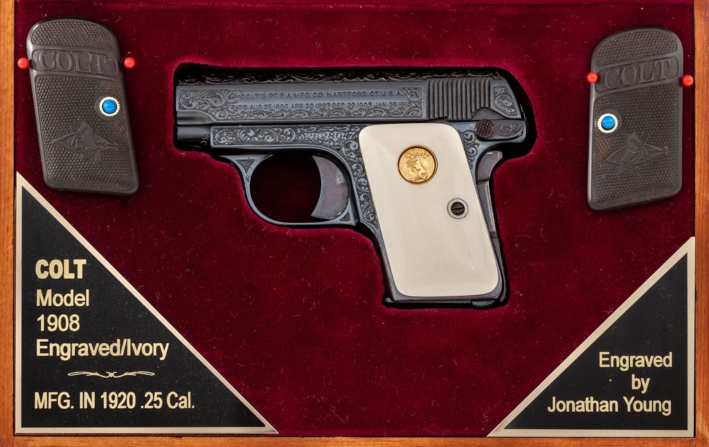 Jonathan Young engraved Colt Model 1908 Vest Pocket Semi-Automatic Pistol, #262804, .25 Auto cal., 2'' barrel, medium relief vignette engraved, royal blue finish, ivory grips with gold Colt medallions, and original magazine with engraved base plate. Mfg'd 1920. In pine Colt marked box lined in red velvet. Original hard rubber grips are included. Condition is excellent as modified, with all work being nicely accomplished. Grips and action are excellent, bore is fine. Est.: $1,000-$1,500. (C&R/PPT)