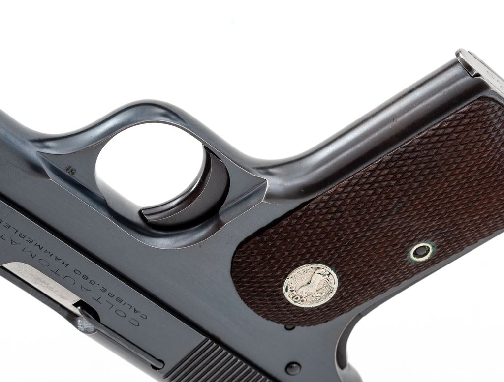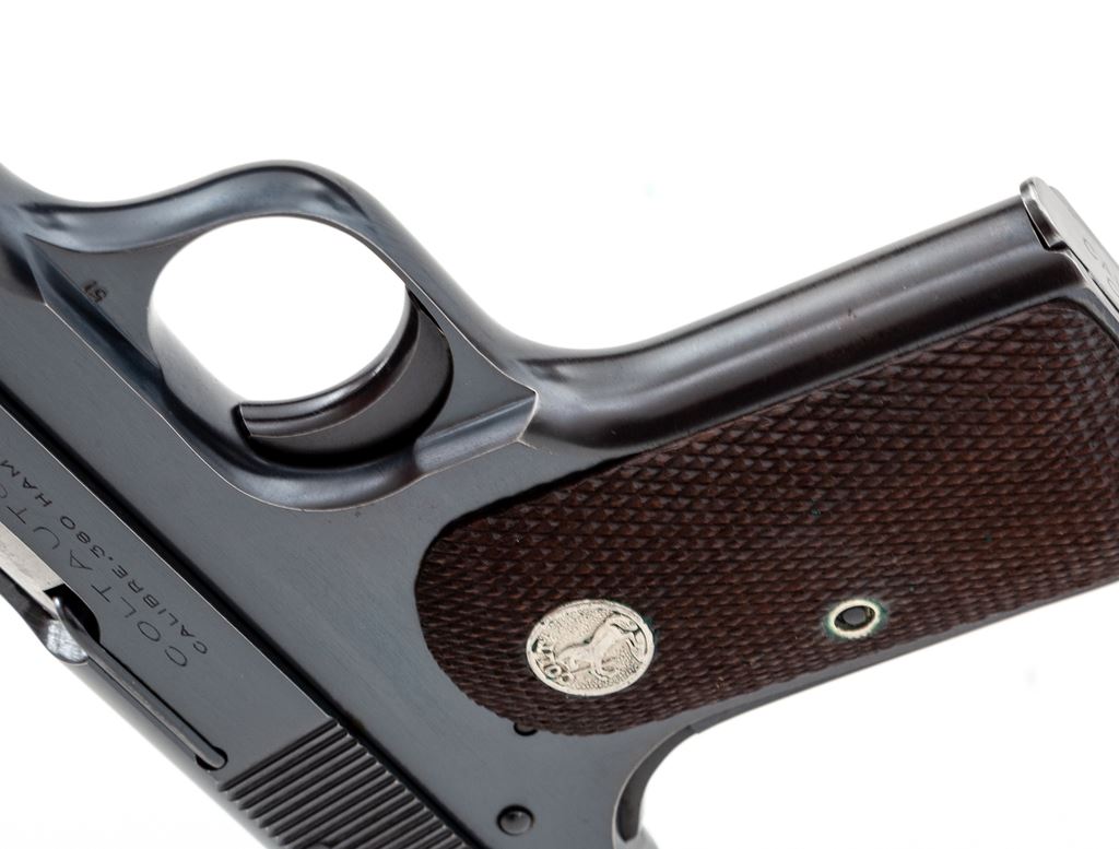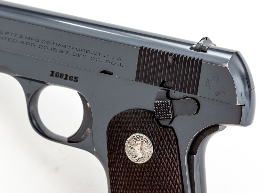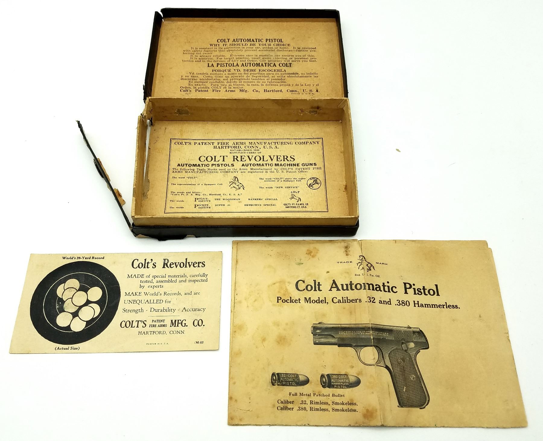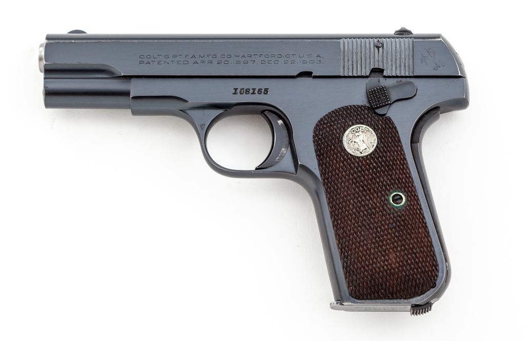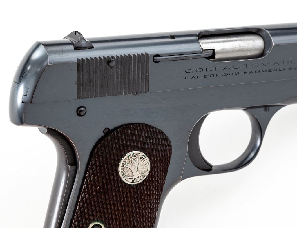 Colt Model 1908 Pocket Hammerless Semi-Automatic Pistol, #108165, .380 cal., 4'' barrel, blue finish, factory checkered walnut grips with Colt medallions, and one correct factory two-tone magazine. In original box numbered to the gun, with paperwork. Mfg'd 1931. Condition is excellent retaining approx. 96%+ original blue with some micro-scratching and wear in actioning areas of trigger. Nice crisp grips, good action, bright bore. Est.: $800-$1,200. (C& R/PPT)