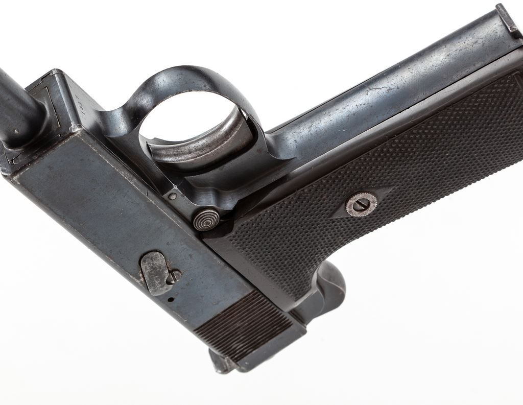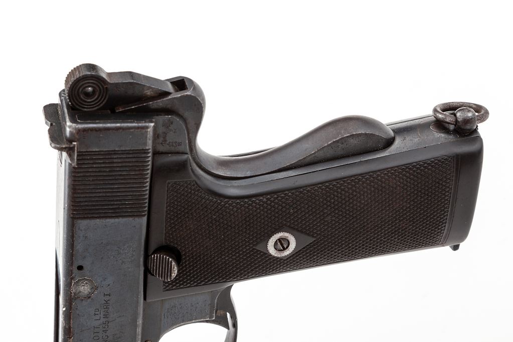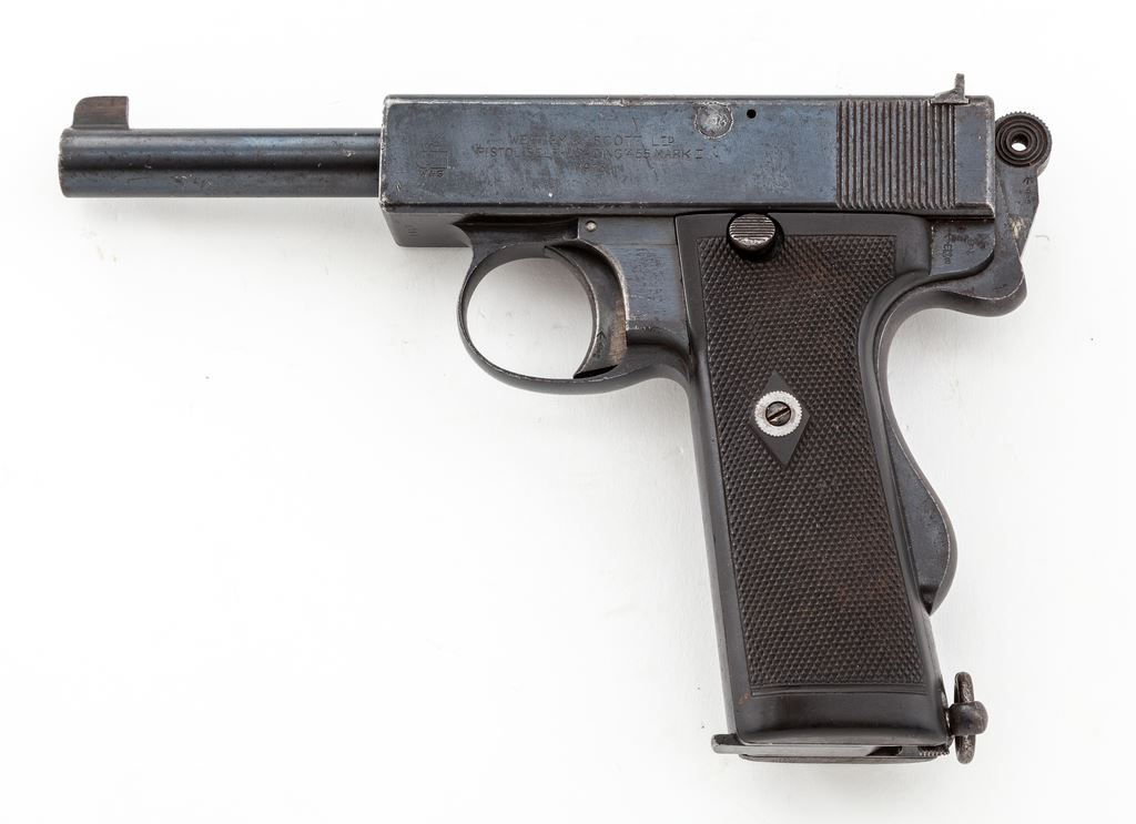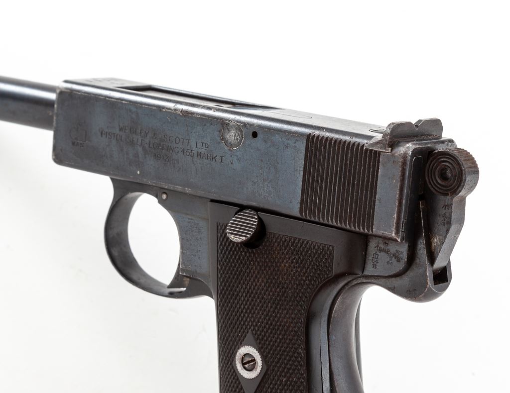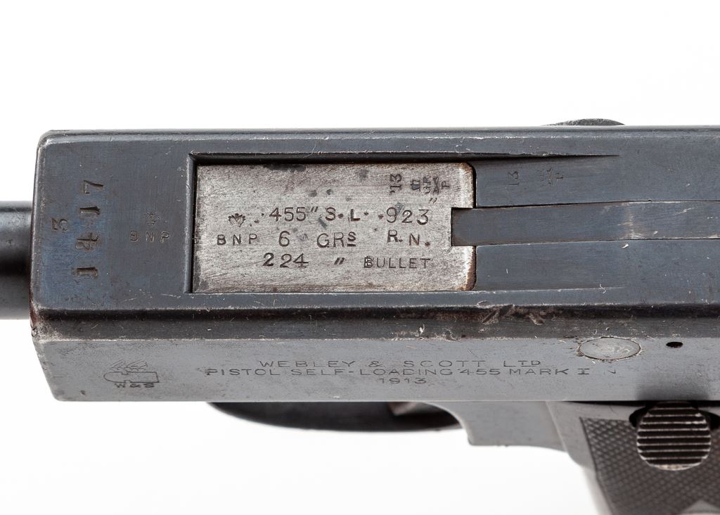 Webley & Scott Model 1913 Semi-Automatic Pistol, #1417, .455 MK I cal., 5'' barrel, blue finish, factory checkered vulcanized rubber grips, with one original factory magazine. Pistol is dated 1913, with British ''(crown)/BNP'' proofmarks and extensive proofhouse markings to top of breech area. Condition is fine to near excellent, retaining approx. 90%+ blue, with light general scuffs and scratches. Grips and action are crisp, bore is very good. Est.: $1,800-$2,400. (C&R/PPT)