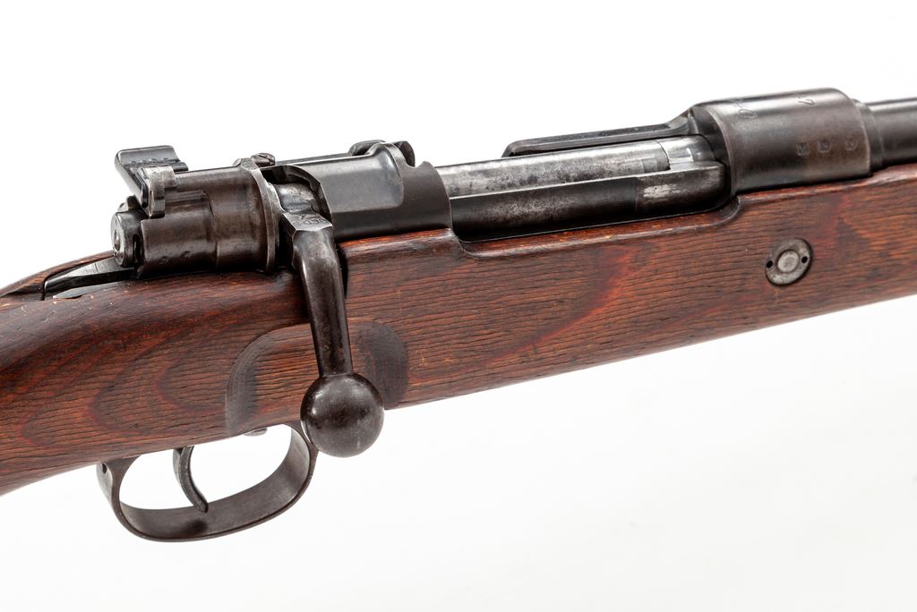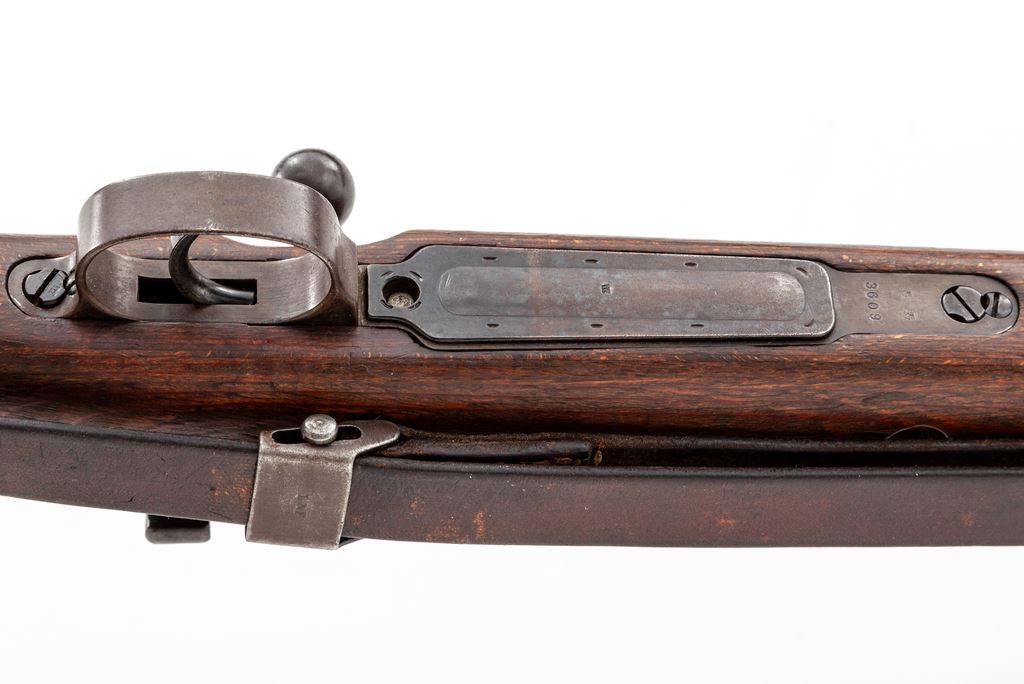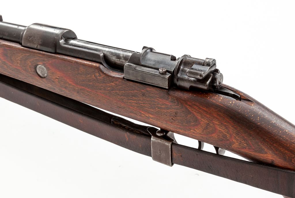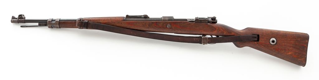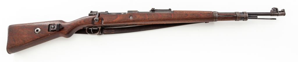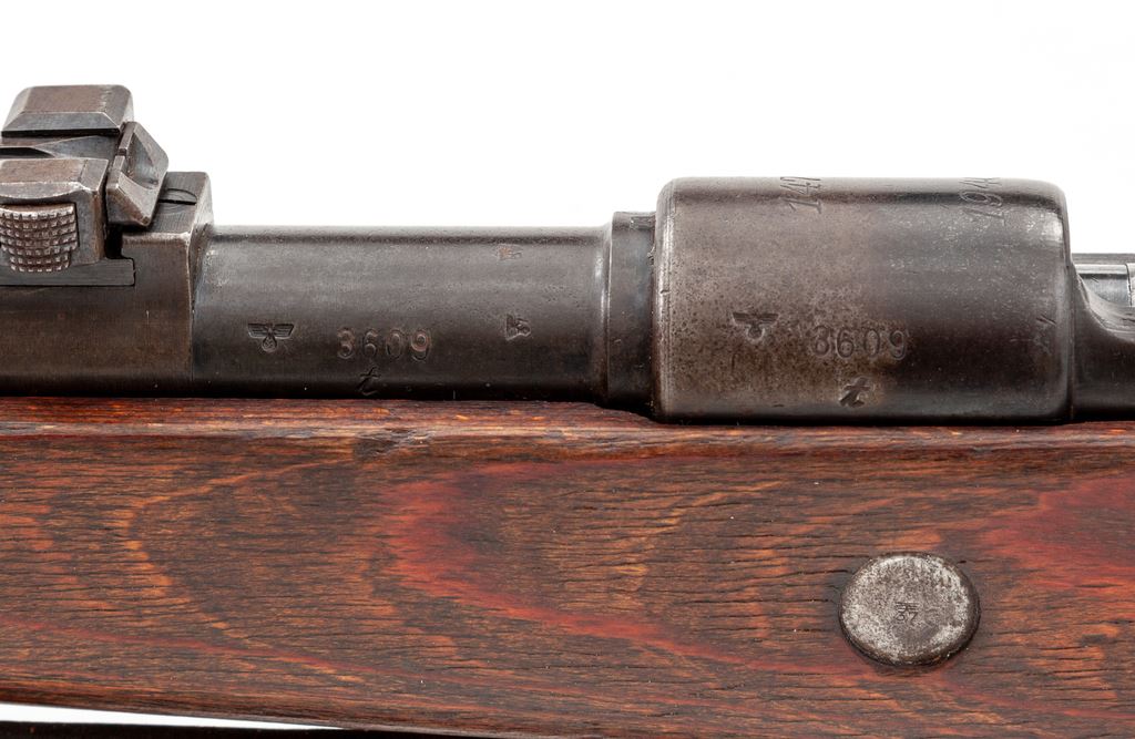 German Kar98k Mauser Bolt Action Rifle, #3609T, 8x57mm cal., 23.6'' barrel, blued finish, laminated stock, cleaning rod, inverted ''V'' front sight with adjustable tangent rear sight. Marked on receiver ring ''147'' (code of the Suhl & Sohn Co.) over ''1940''. Left side of receiver rail marked ''MOD 98''. Intact eagle/swastika stamps on left side of barrel and chamber. Two ''(eagle)/37'' stamps on barrel and chamber, along with ''(eagle)/359'' right side of chamber. ''(Eagle)/359'' on right side of barrel below rear sight. Right side of buttstock marked ''H/(swastika)/(eagle) WaA 37/(eagle)/(swastika) WaA 37''. Rifle has a front sight without slots for sight hood, ''H'' front band, stamped magazine floorplate, and flat buttplate. Matching numbers. Condition overall is very good with approx. 75% finish remaining on metal surfaces, with thinning and browning on the forward part of the chamber, front sight and front band, floorplate, and buttplate. Wood is very good with a nice even color showing a couple of very small closed cracks and a few old dents to the handguard, scratches to the forend, and overall light handling marks. Action is smooth, bright bore is very good with some wear to the rifling. Includes a German army sling stamped ''L&F'' on the buckle and a steel muzzle cover stamped ''m'', both in very good condition. No visible import stamps. Overall a very nice example of this iconic rifle. Est.: $1,200-$1,500. (C&R)