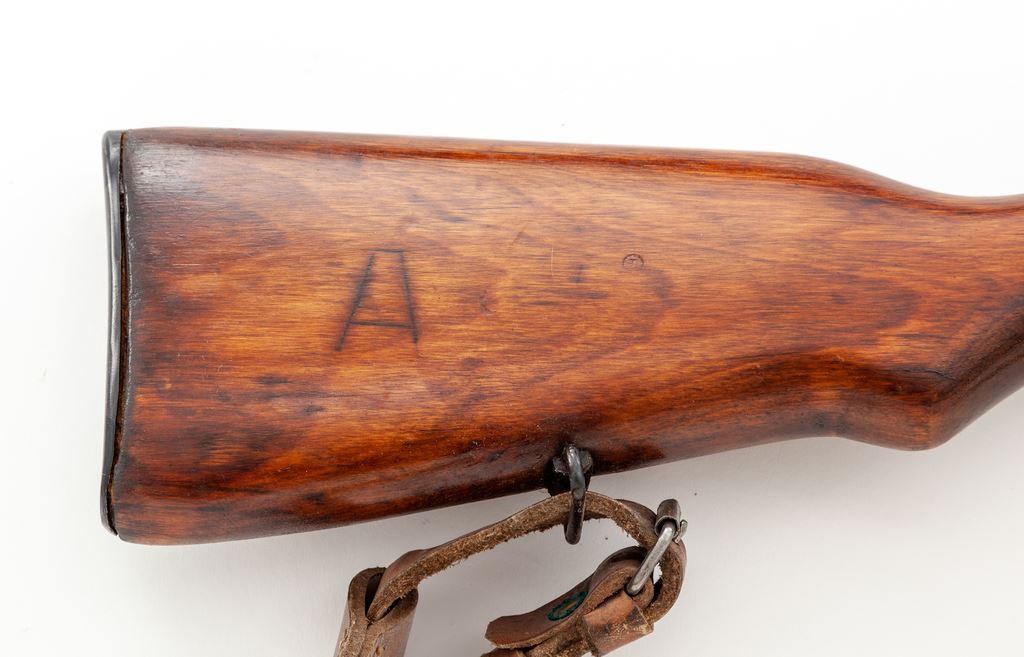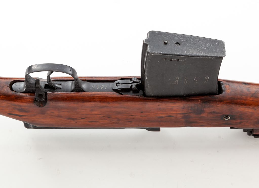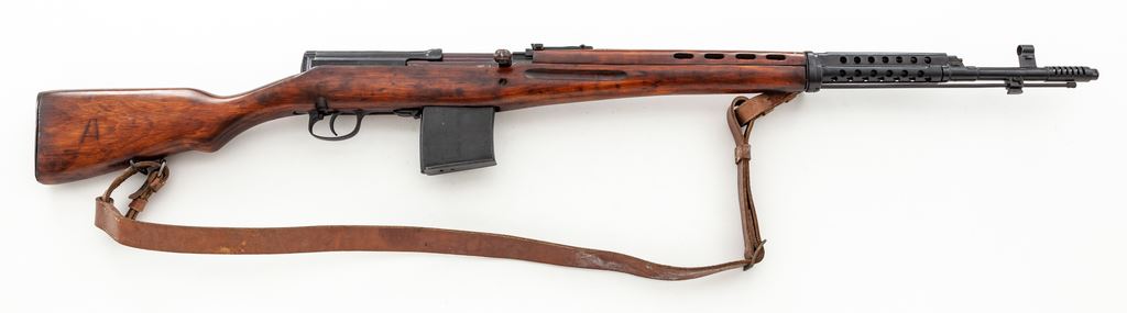 Soviet M1940 SVT Tokarev Semi-Automatic Rifle, #TO6154, 7.62x54R cal., 26.6'' barrel including muzzlebrake, blued finish, hardwood stock, hooded post front sight with adjustable tangent rear sight. Marked on top of chamber with five-pointed star stamp over ''1943'', along with a square refurbishment type stamp. Includes cleaning rod and one 10-round magazine. Matching original engraved serial number on bolt handle and matching original stamped number on left side of buttstock. Mismatched stamped and engraved numbers on magazine. Receiver cover metal is rough and there is a dark spot on left side of buttstock where arsenal repairs likely were done. An ''A'' has been carved in right side of buttstock which appears to have been refinished over during an arsenal refurbishment. Condition overall is about fine with over 95% of the arsenal refinished blue remaining on metal surfaces, with light wear on the buttplate. Wood is very good with areas of very light wear to the finish. Action is smooth, bore is excellent with sharp rifling. Includes a brown leather sling with leather collars. Import stamped on right side of receiver. Est.: $1,000-$1,500. (C&R)