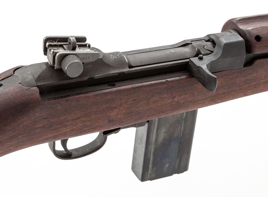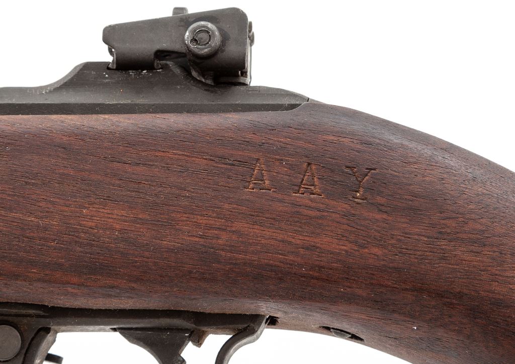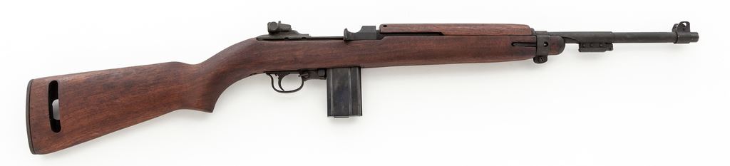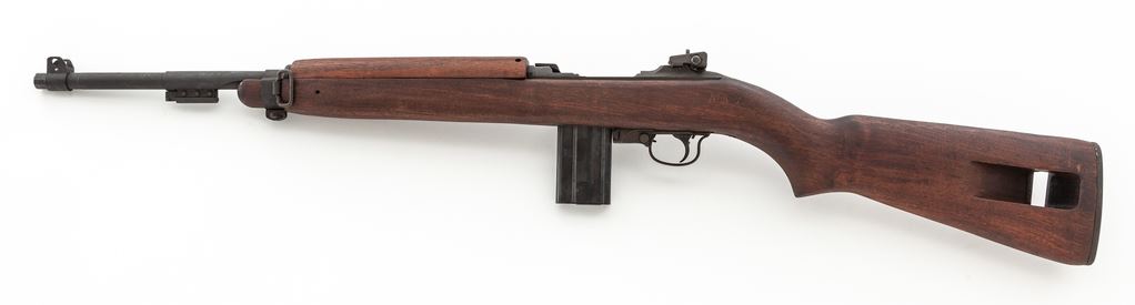 Winchester M1 Semi-Automatic Carbine, #1126120, .30 Carbine cal., 18'' barrel, parkerized finish, walnut stock, blade front sight with protective ears and adjustable aperture on ramp rear sight. Marked on receiver ring ''U.S.CARBINE CAL..30 M1'', and on tang ''WINCHESTER''. Barrel behind front sight is stamped with a ''W''. Left side of stock at wrist is stamped ''AAY''. ''P'' and ''X'' stamped on underside of wrist. Flat bolt. Includes three (3) 15-round U.S.G.I. magazines stamped ''IU'', two in khaki canvas WWII mag pouch marked ''US'' and ''QMD 1942''. Condition overall is excellent with almost all of the re-parkerized finish remaining on metal surfaces, showing light wear around the bolt area. Wood shows even color and a few scattered handling marks, otherwise excellent. Action is smooth, bright bore is very good. Est.: $800-$1,200. (C&R) (High cap mags not available to Calif. residents.)