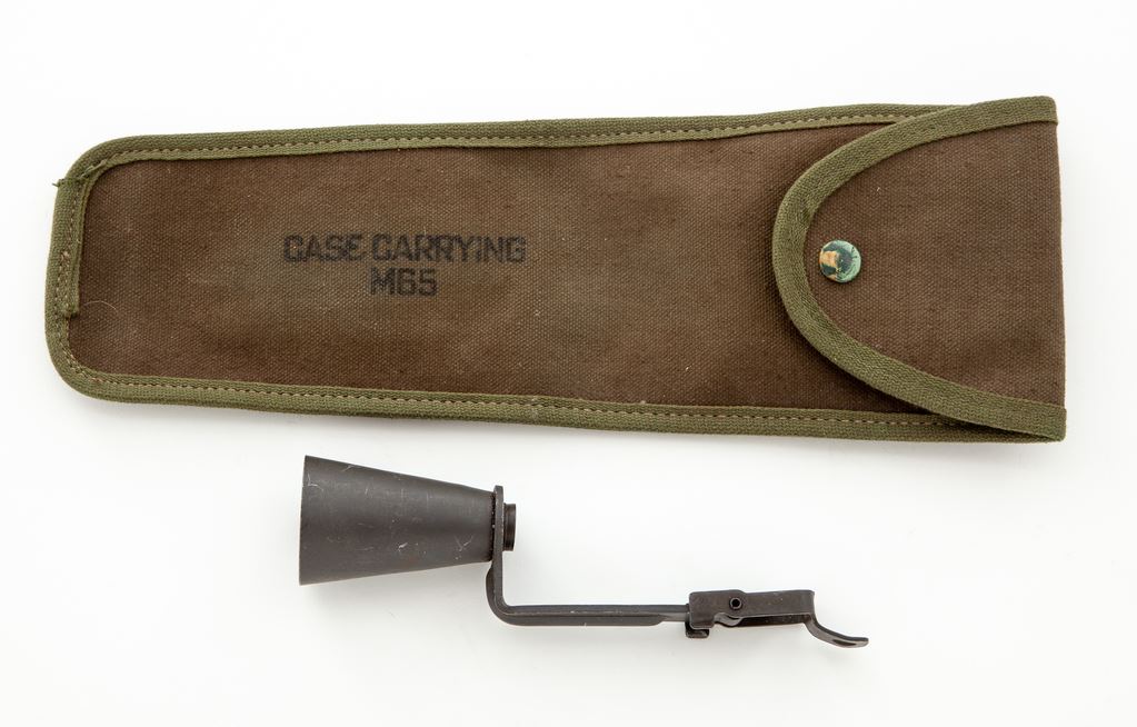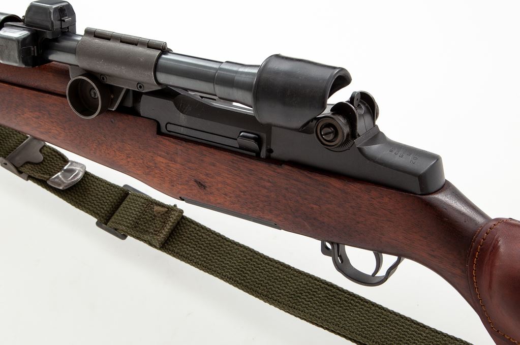 U.S. Springfield M1-D Garand Semi-Automatic Sniper Rifle, #2074232, .30-06 cal., 24'' barrel dated 2-53, parkerized finish, walnut stock, forend and upper handguard; with U.S. M84 telescopic sight on standard M1-D scope mounts. Rifle includes 11-62 dated leather cheekpiece, late '50s green canvas sling unattached, T37 flash hider, standard M2 flash hider, scope carrying case, and laminated gov't transfer document. Condition is excellent as arsenal built, with later manganese phosphate finish to receiver, with all other components to be factory original zinc phosphate finish. Unmarked walnut stock shows light general impressions, specifically to left side above magazine floorplate. Leather cheekpiece with oil staining and verdigris to lacing and brass eyelets. Scope optics are extremely clear; eyepiece and sunshade are present. Action is crisp, bore is mirror bright, and shows little overall use. Est.: $2,500-$4,000. (C&R)