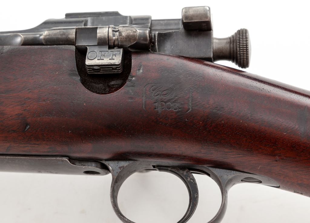 Scarce Early Model 1903 Bolt Action Rifle, by Rock Island Arsenal, #28584, .30-06 cal., 24'' barrel dated 2-05, blue finish, ''CN'' (Conrad Nelson) 1908 cartouched finger-groove walnut stock pre-dating crossbolt with high flat-top handguard without steel reinforcing clips; forend tip of stock above bayonet lug with large serif ''S'' indicating that the stock had been shortened at time of caliber conversion to .30-06. Smooth blue buttplate with case hardened trap cover, script type circle-''P'' proofmark at wrist behind triggerguard, early small diameter rear sight windage knob, smooth thin trigger, split shank lower barrel band. Condition is very good to about fine retaining approx. 95% factory blue with light to moderate pitting that has been cleaned near muzzle. Stock with mostly visible cartouche, dark abrasions with dings, gouges and scuffs; forend shows similar but slightly more pronounced marks. Buttplate retains approx. 90% original blue with case colors to butt trap only slightly muted. Action remains crisp, bore is fine to near excellent. A very scarce and highly collectible early '03 variation. Est.: $3,000-$5,000. (C&R)