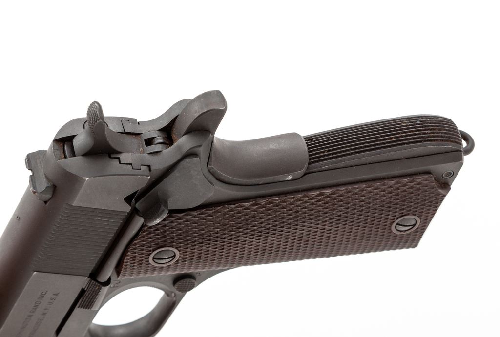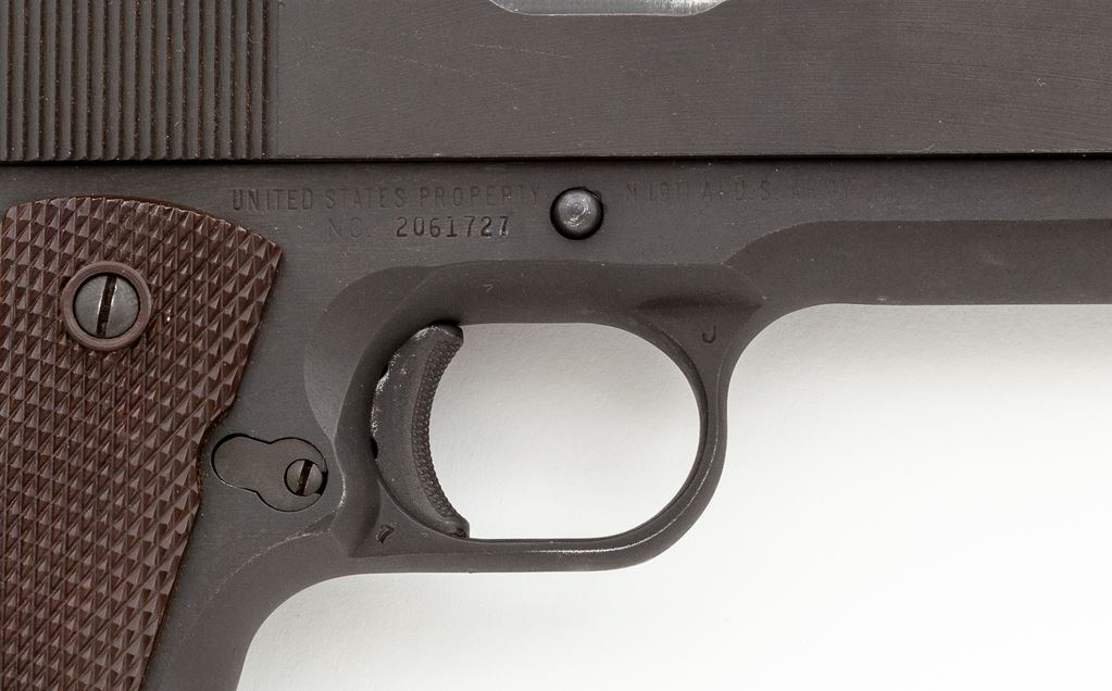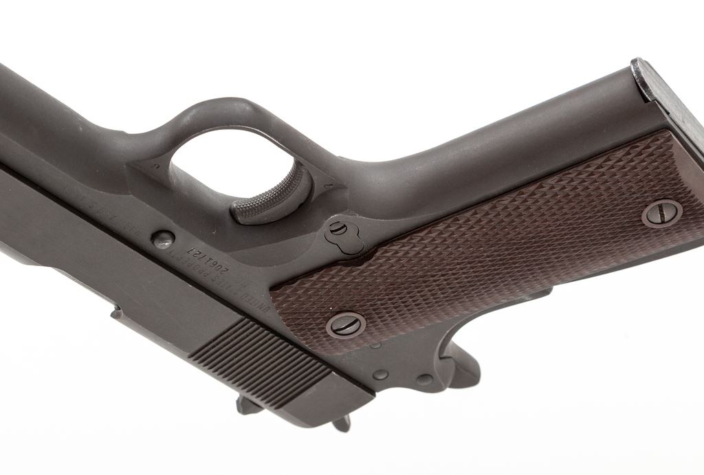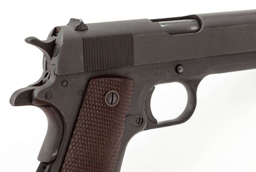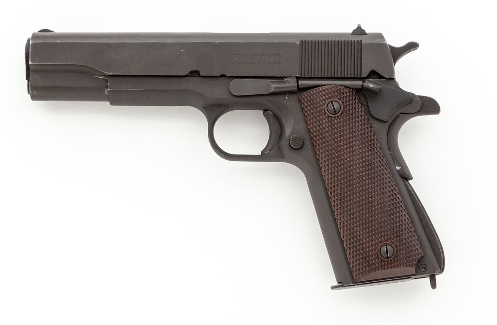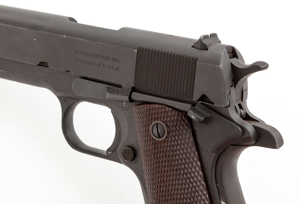 WWII Remington-Rand Model 1911-A1 Semi-Automatic Pistol, #2061727, .45 ACP cal., 5'' barrel, parkerized finish, WWII brown checkered plastic grips with small reinforcing rings, and one WWII era contract magazine. ''FJA'' inspected, with Ordnance wheel stamped thru the finish. Mfg'd 1944. Condition is excellent with only very light high edgewear to slide and forward portion of frame. Grips and action are crisp, bore is fair and should clean. A very nice 3rd Type Remington-Rand 1911-A1. Est.: $1,800-$2,400. (C&R/PPT)